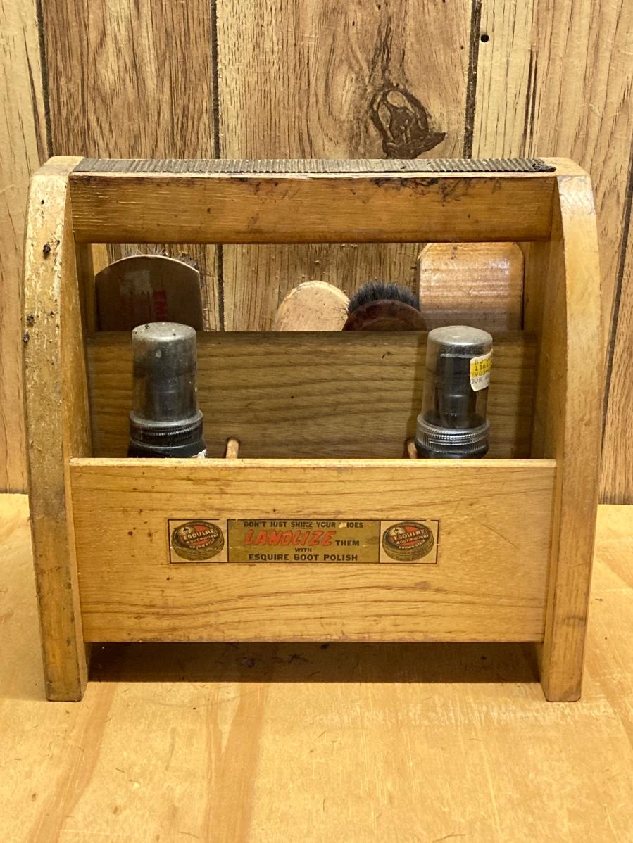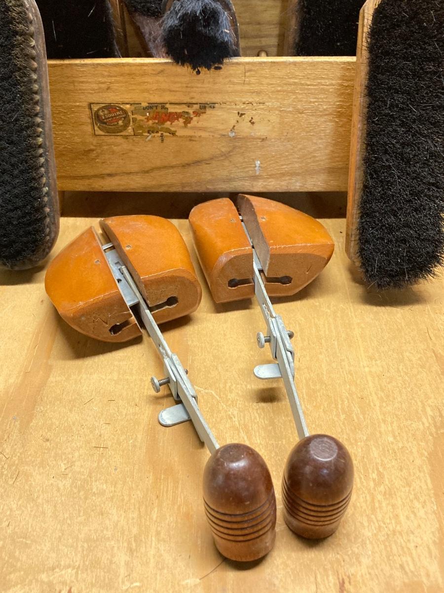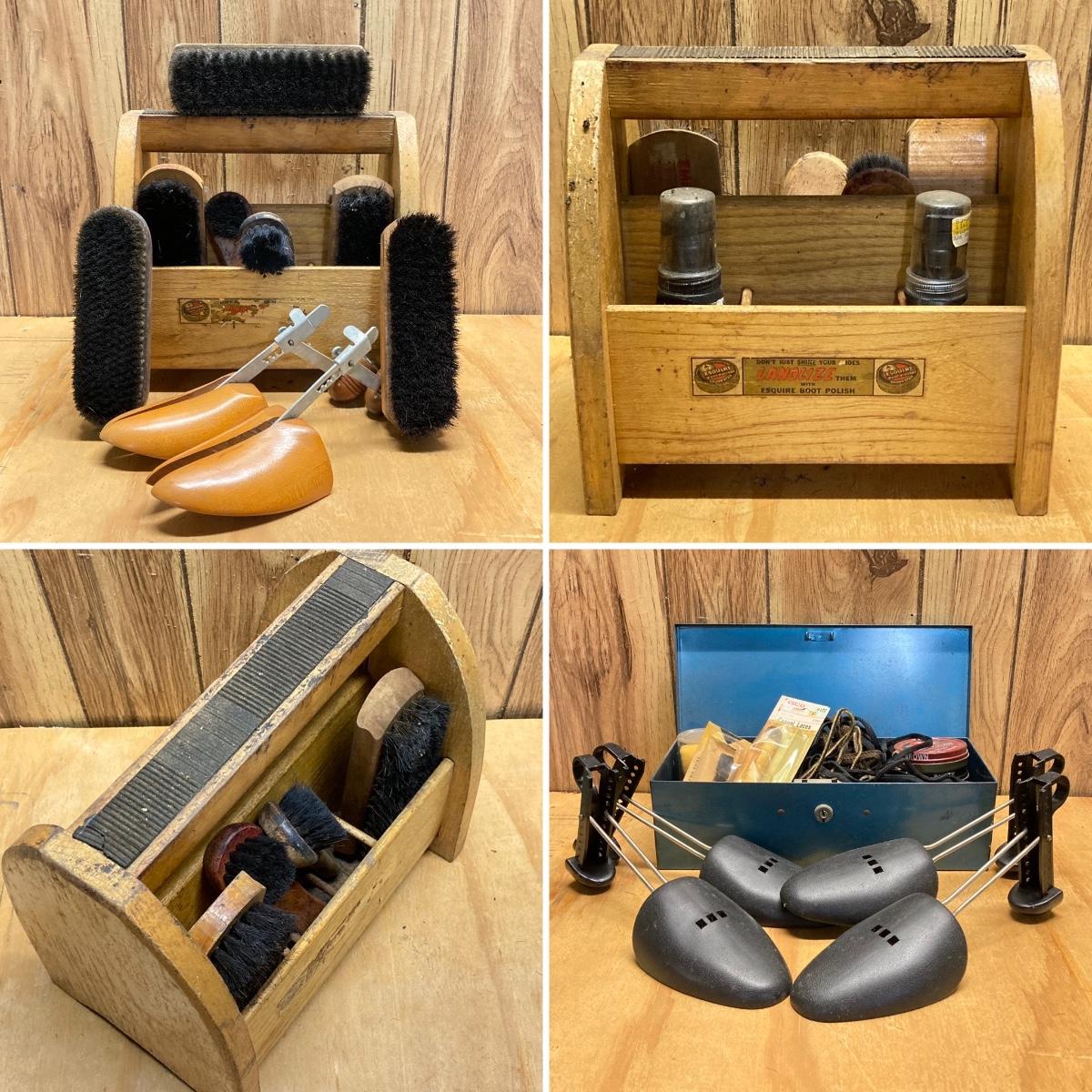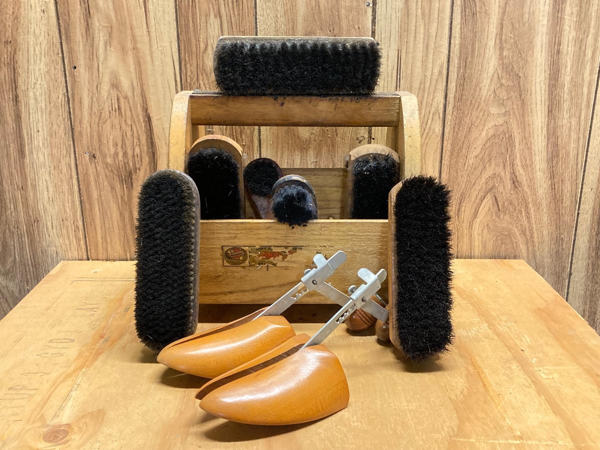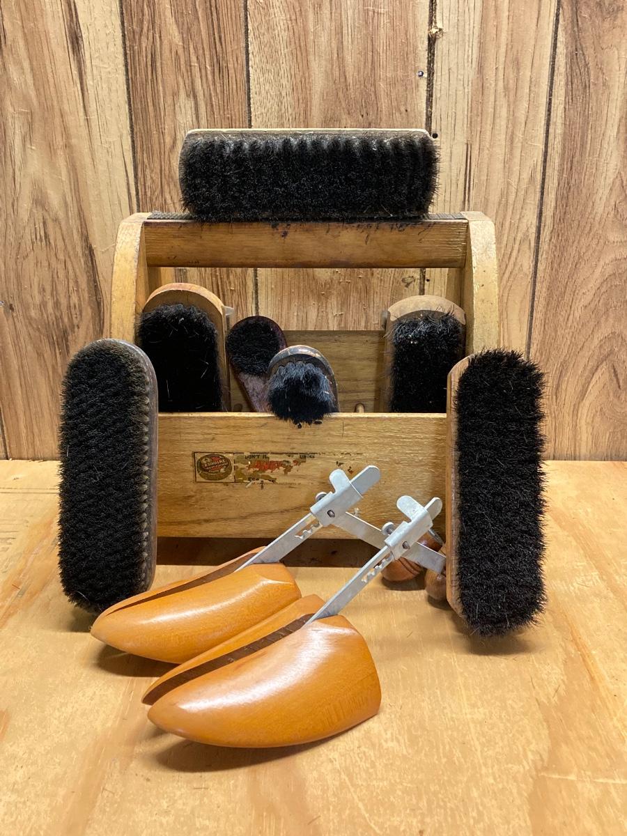 LOT 41: Vintage Esquire Shoe Shine Wood Box, Florsheim Wood Tree / Stretchers, Brushes, Laces and More