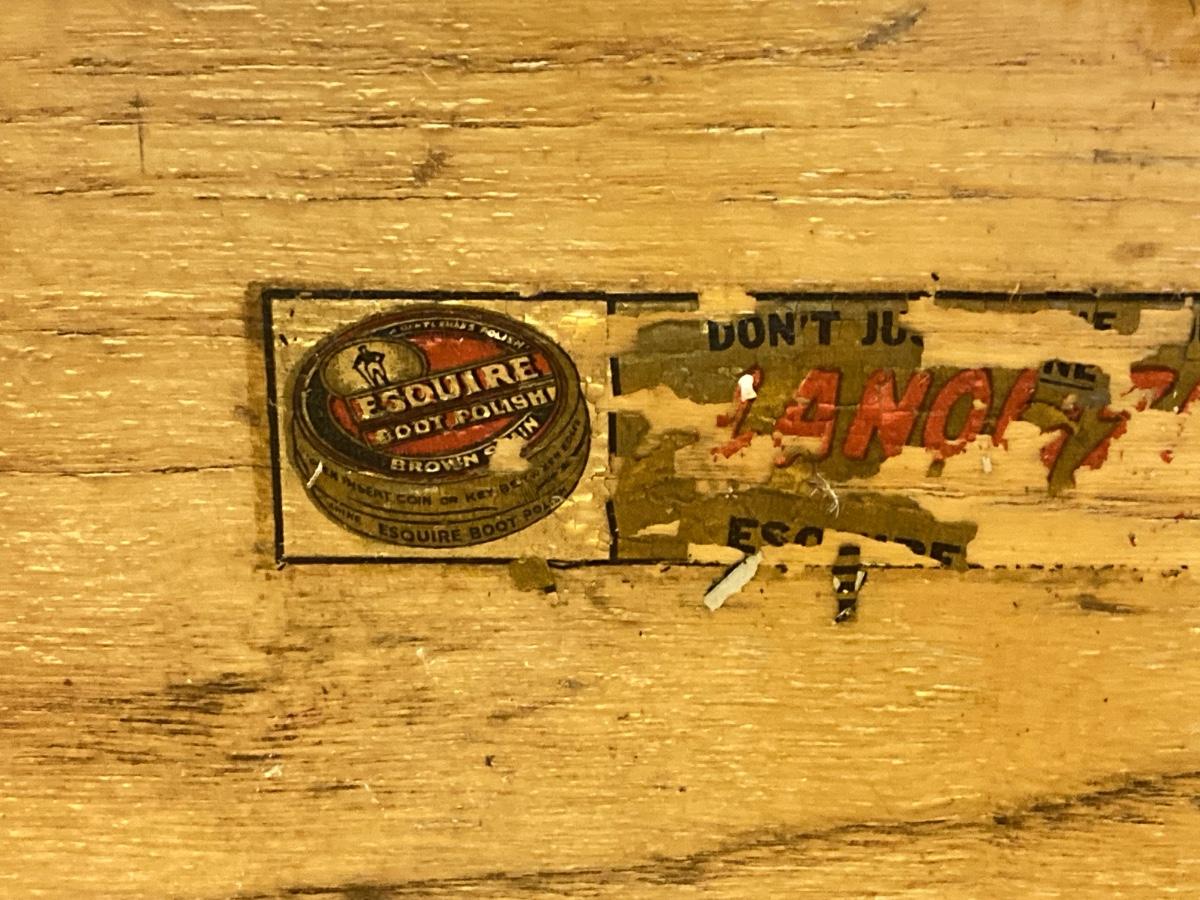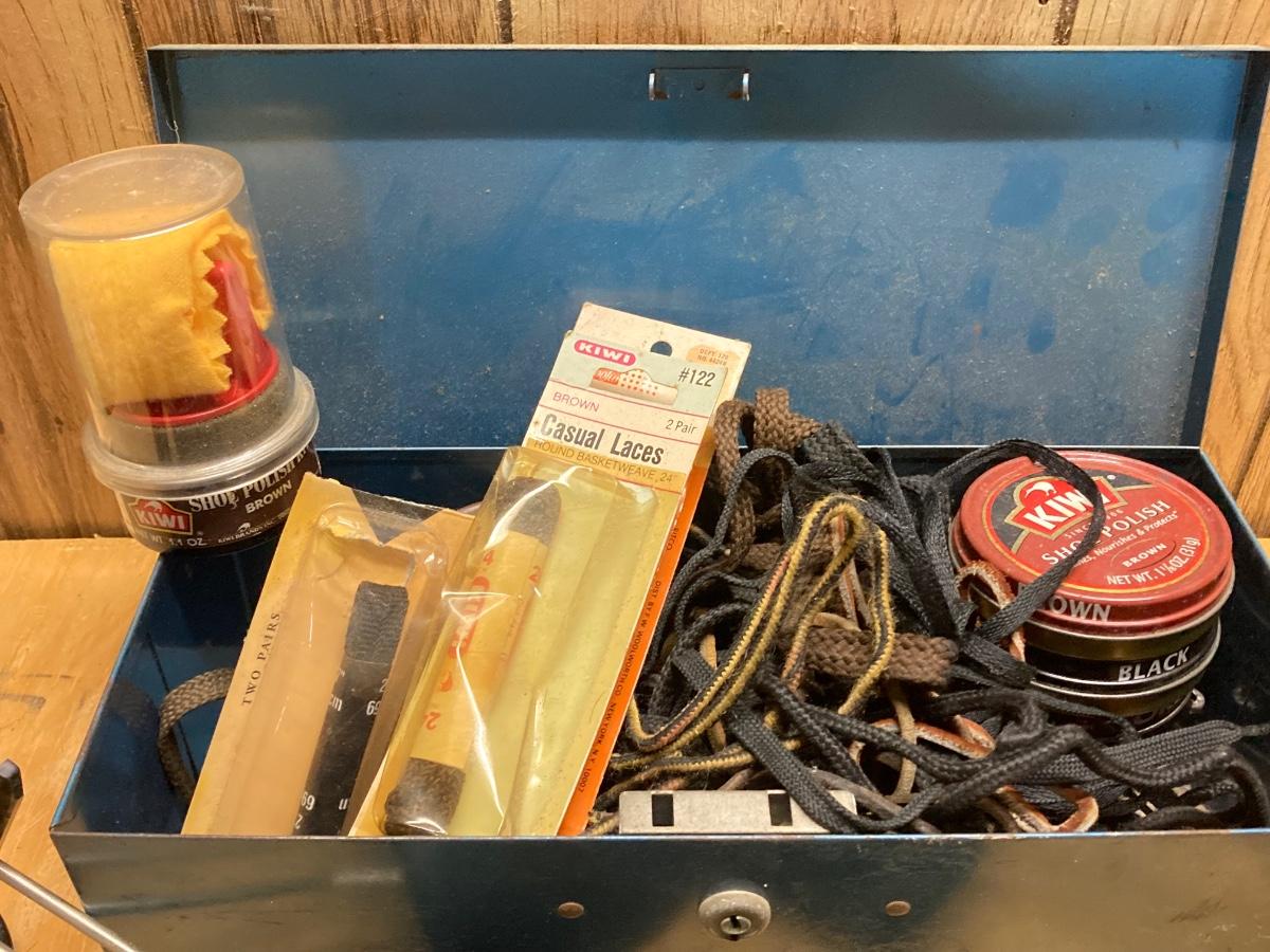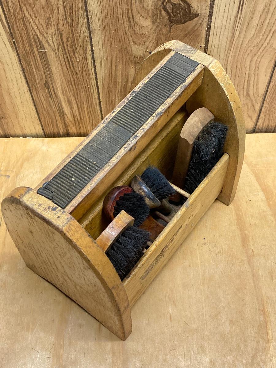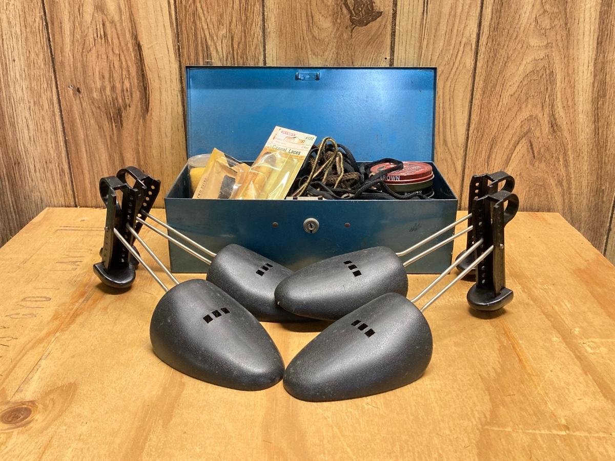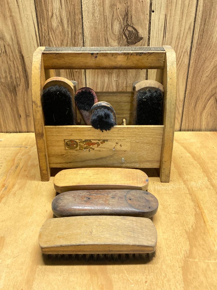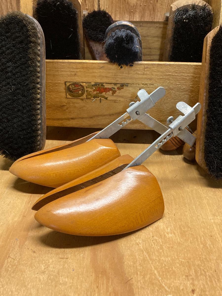 LOT 41: Vintage Esquire Shoe Shine Wood Box, Florsheim Wood Tree / Stretchers, Brushes, Laces and More