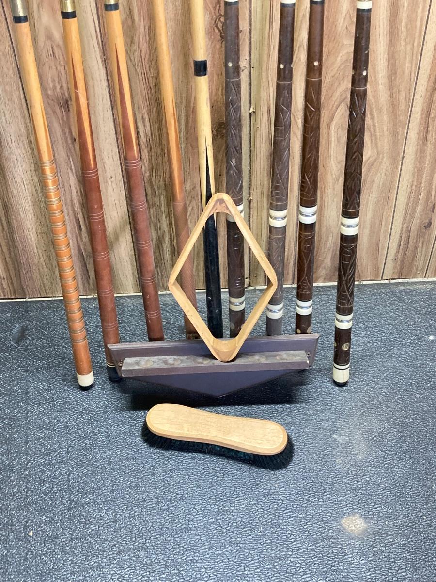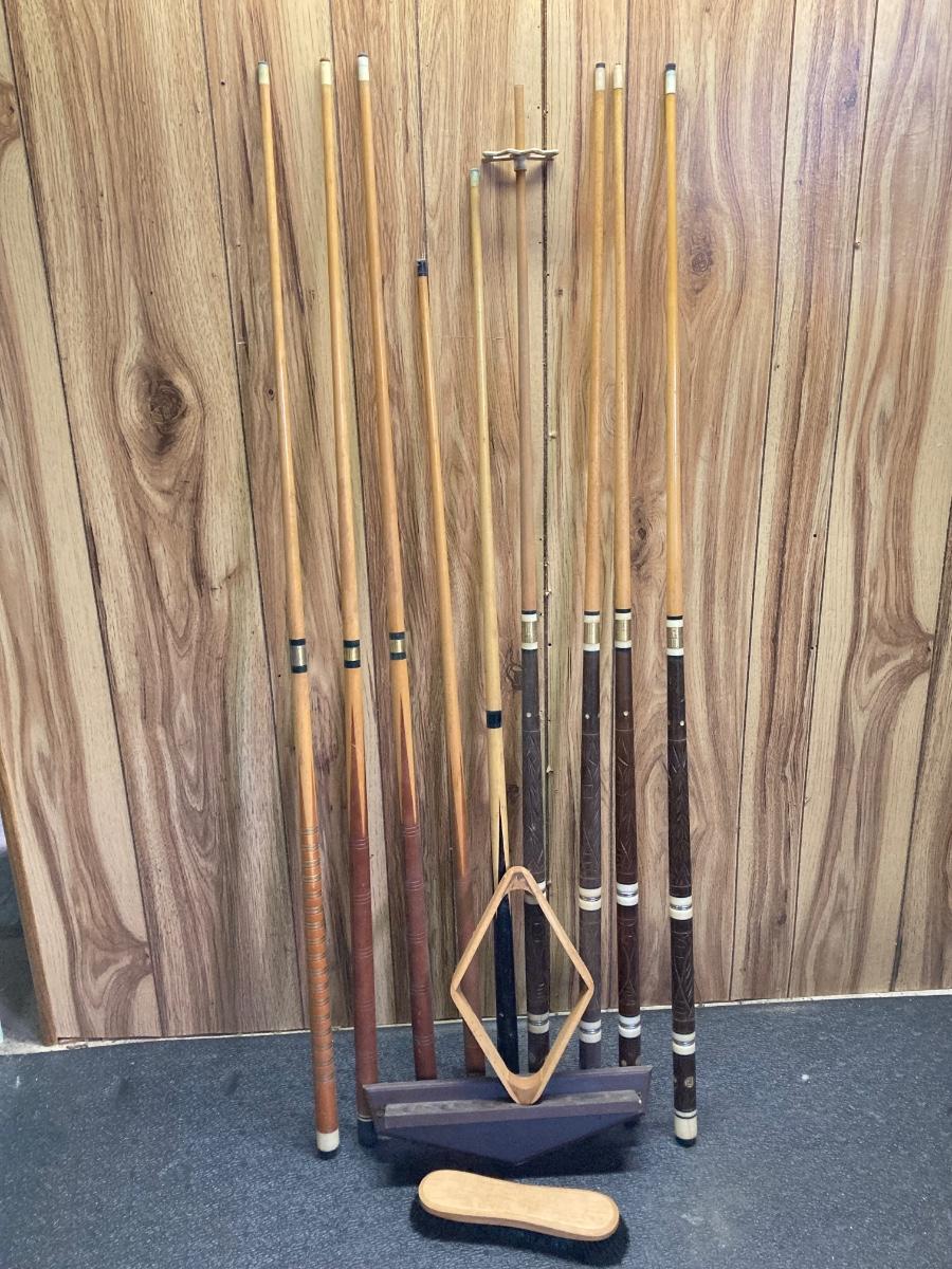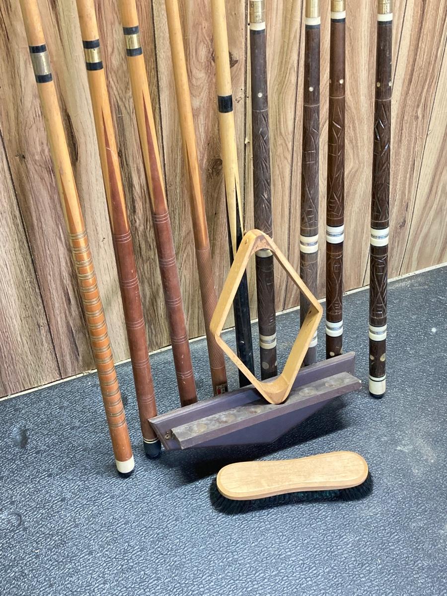 LOT 42: Vintage Billiards Collection - Pool Sticks, Ball Rack, Repair Kit and More