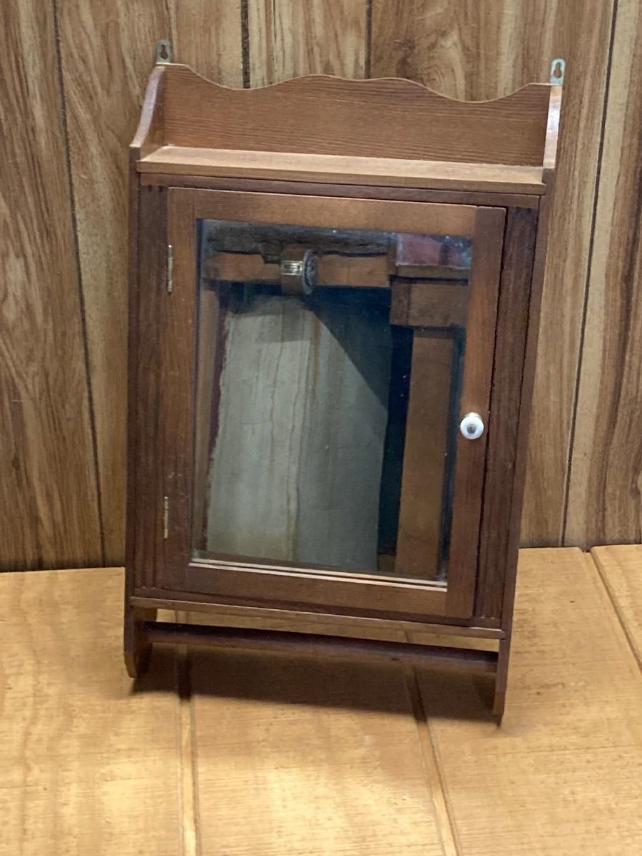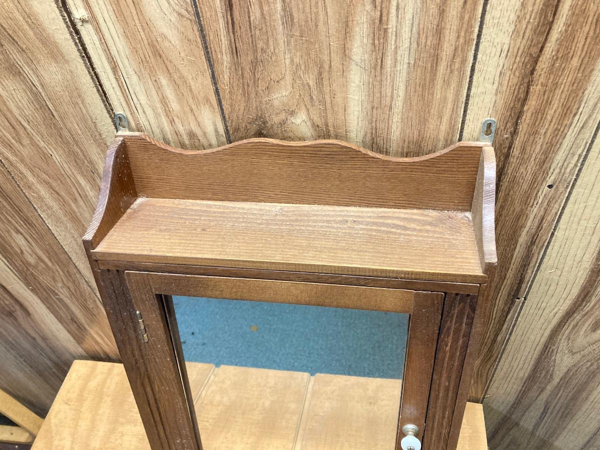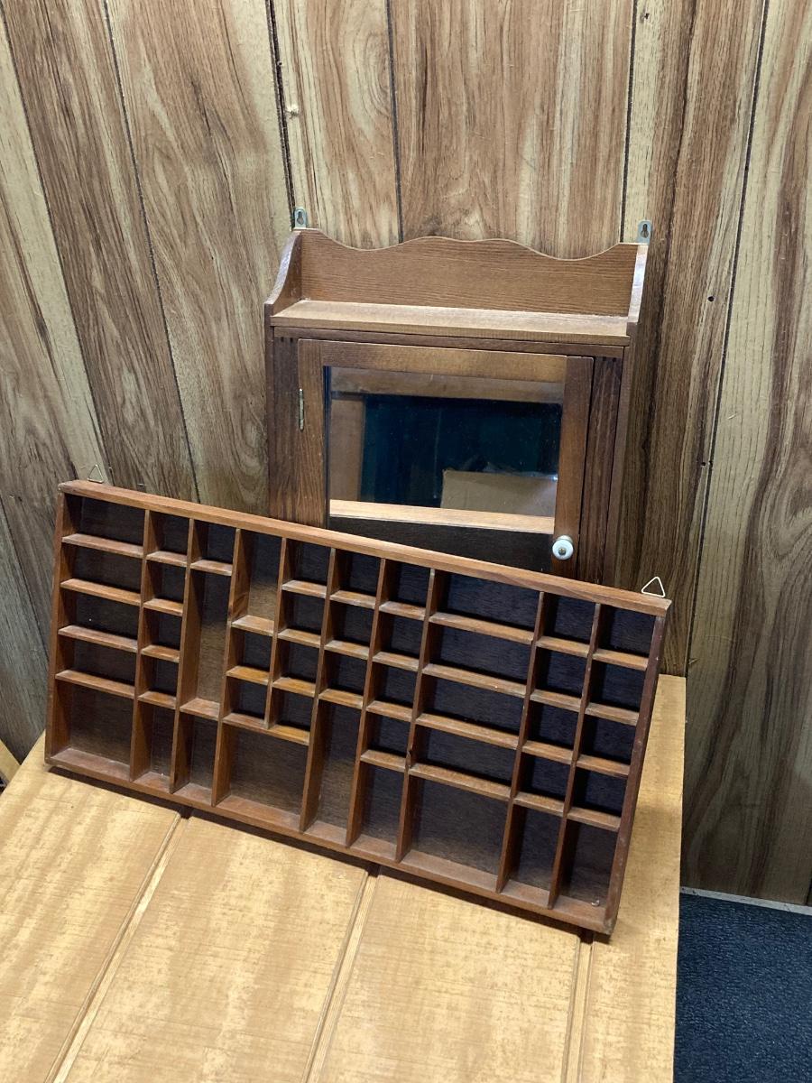 LOT 45: Vintage Wood Wall Mount Mirrored Cabinet and Wood Trinket Display Shelf