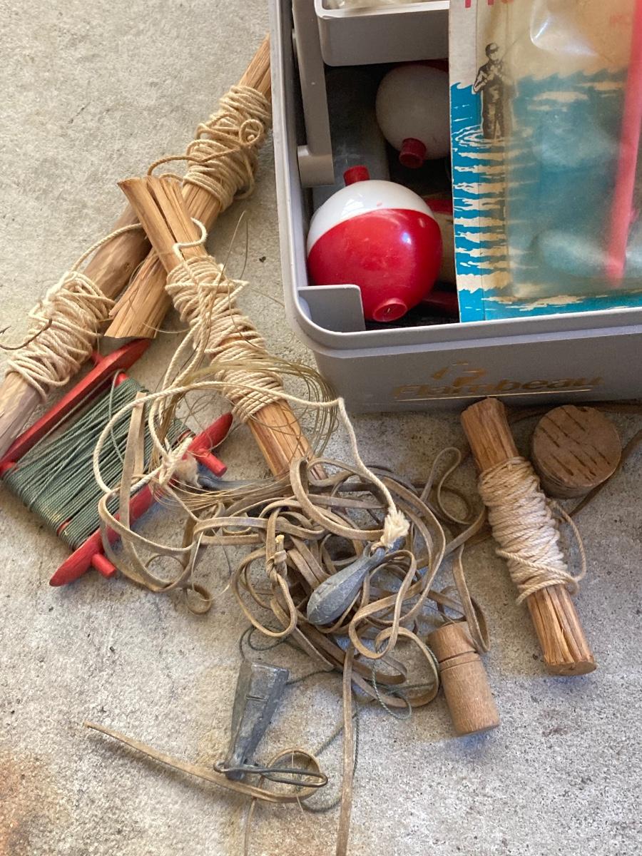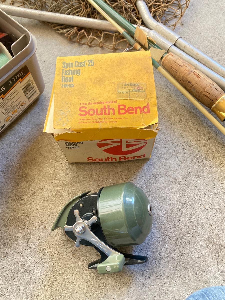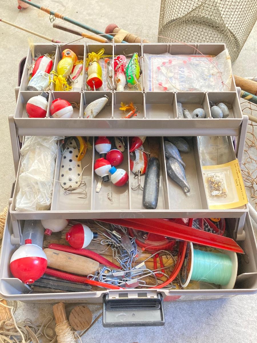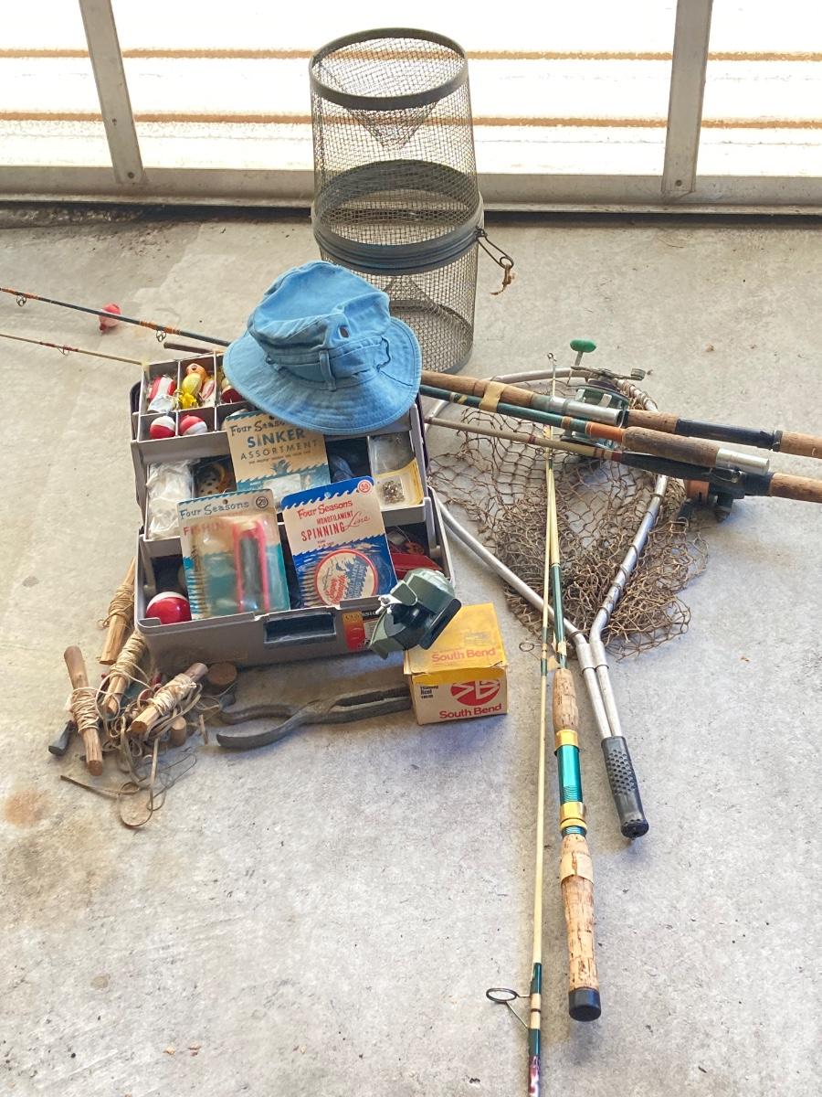 LOT 53: Fishing Collection - Tackle Box, South Bend Reel, Rods, Lures, Detty's Fish Gripper Tool, Minnow Catcher and More