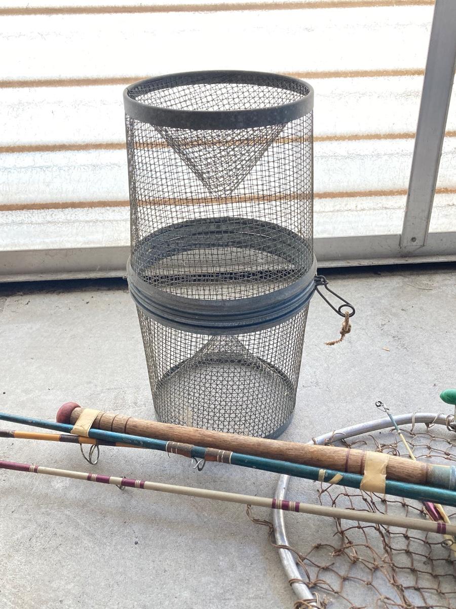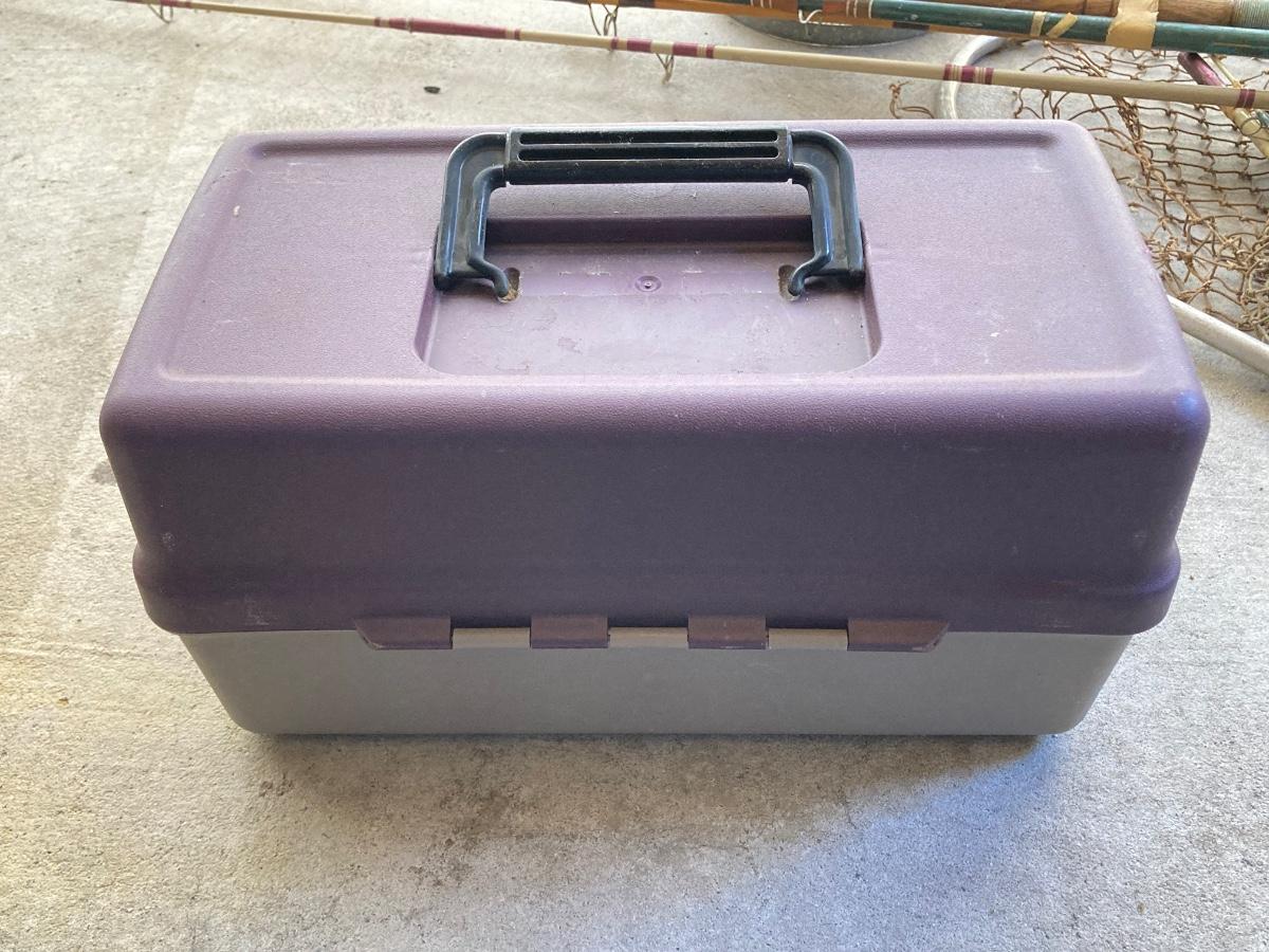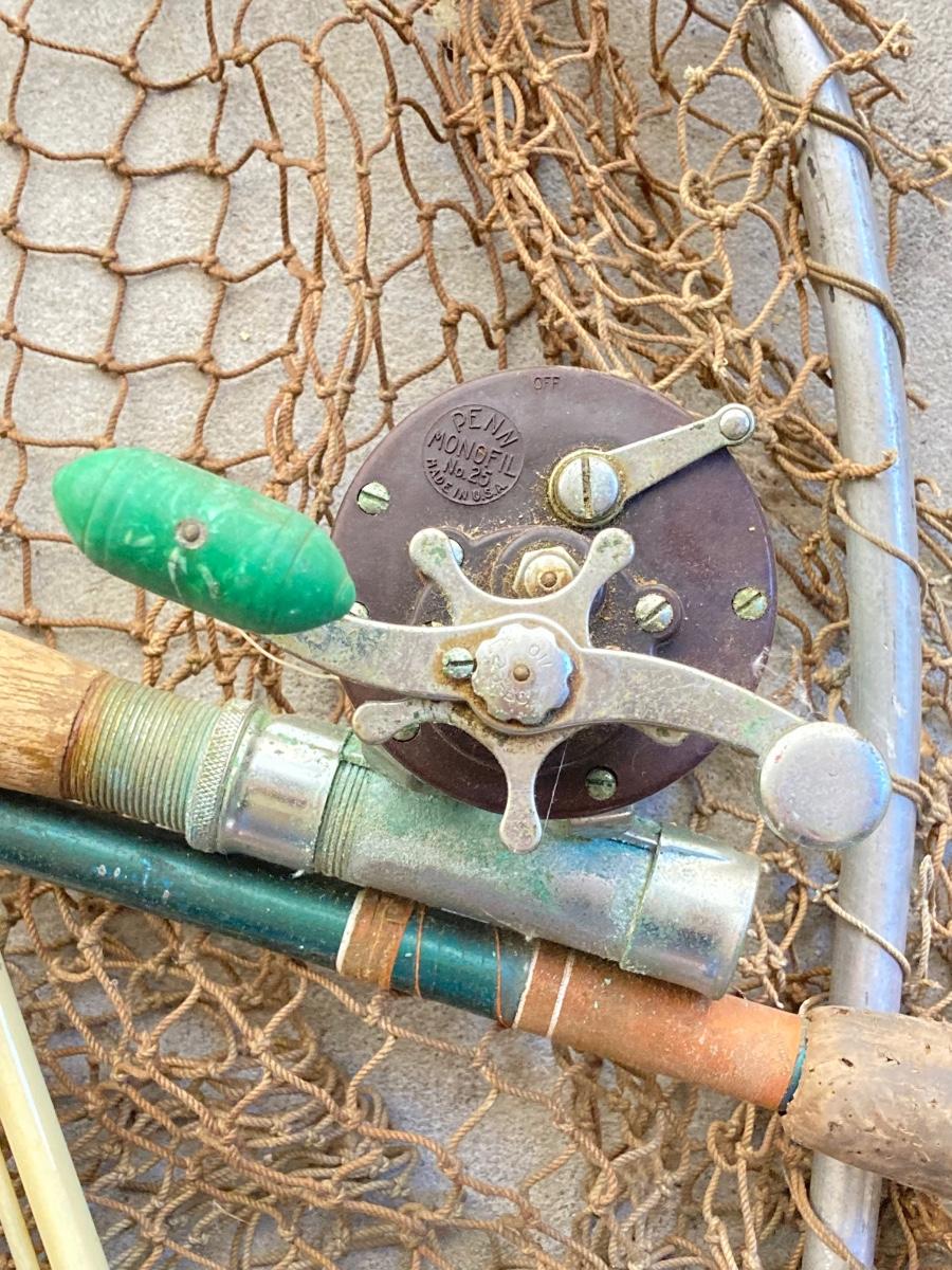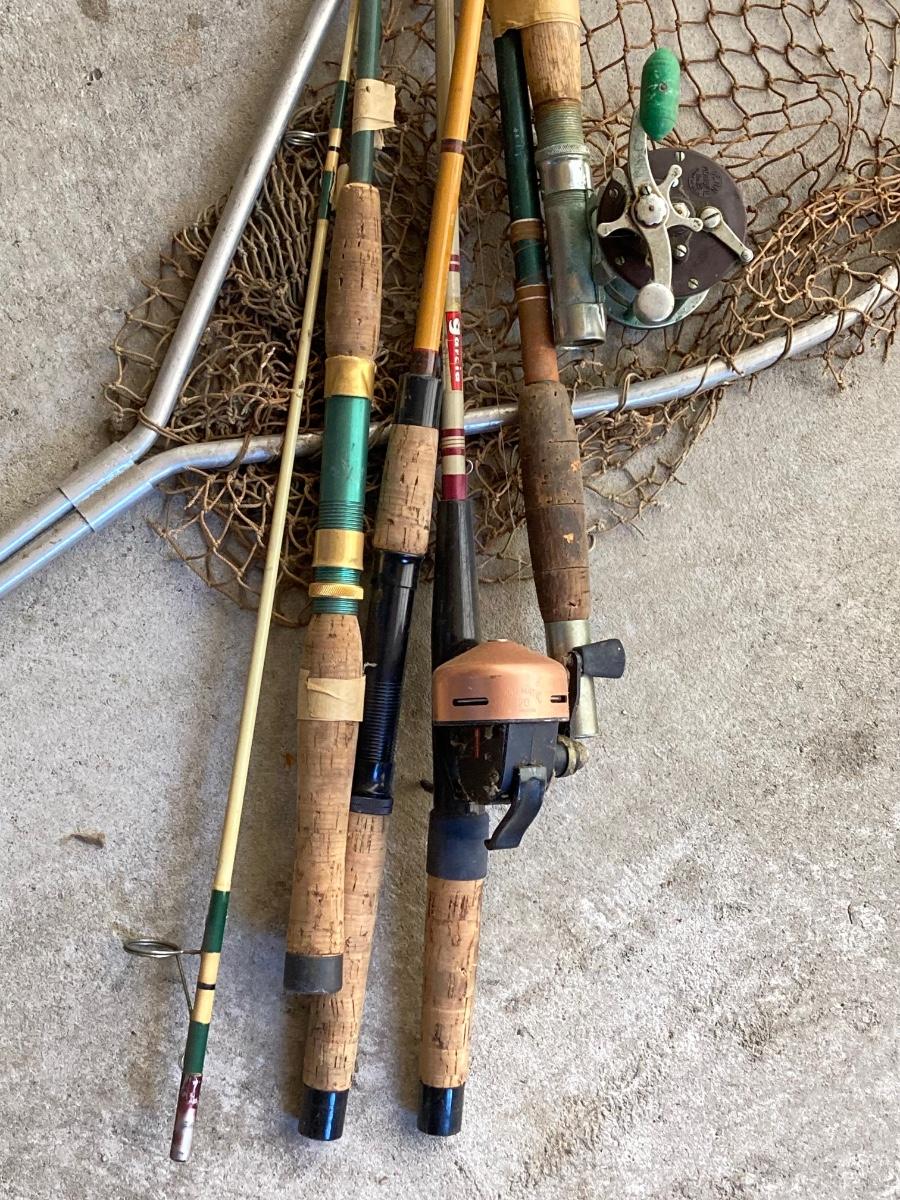 LOT 53: Fishing Collection - Tackle Box, South Bend Reel, Rods, Lures, Detty's Fish Gripper Tool, Minnow Catcher and More
