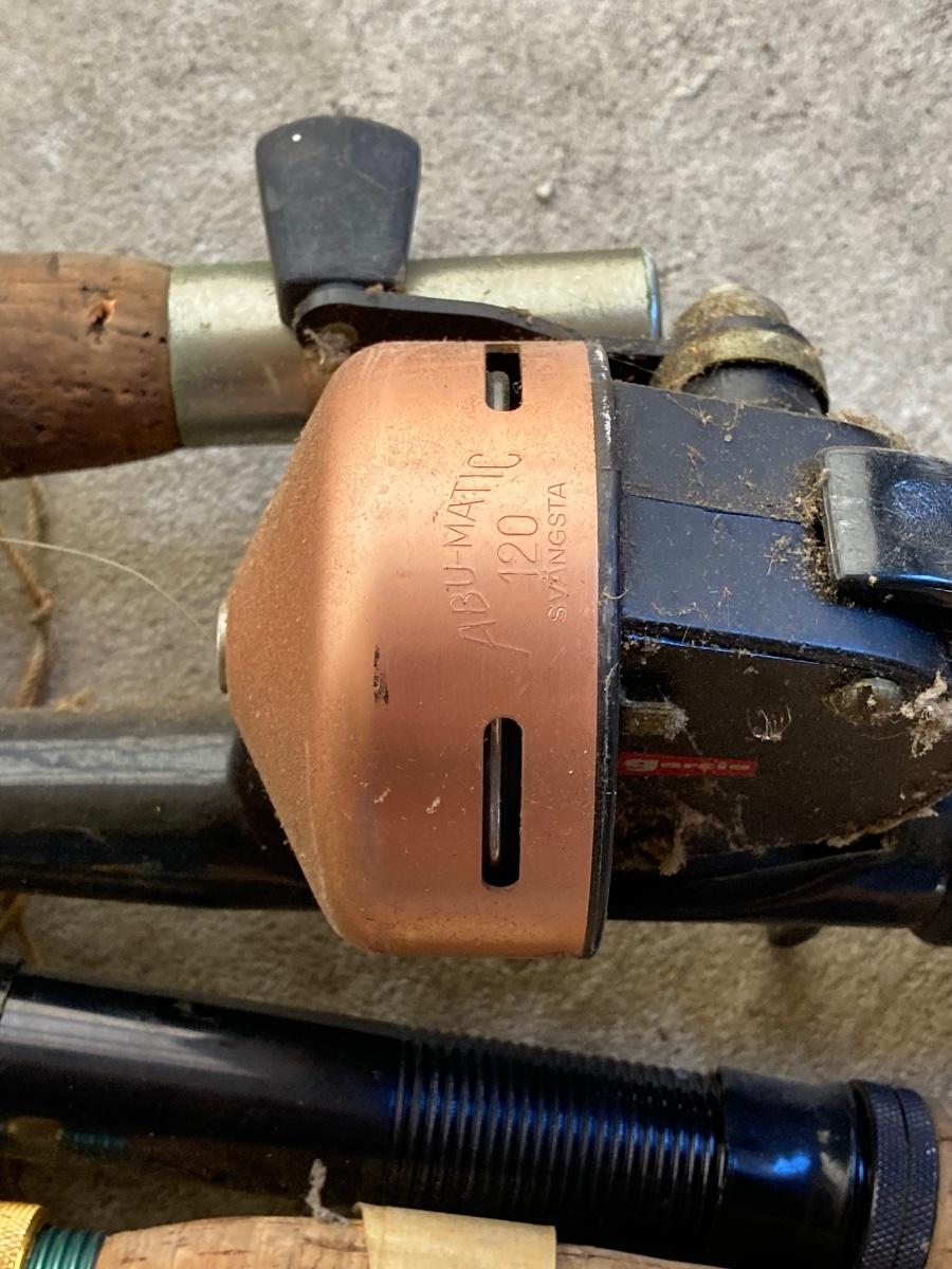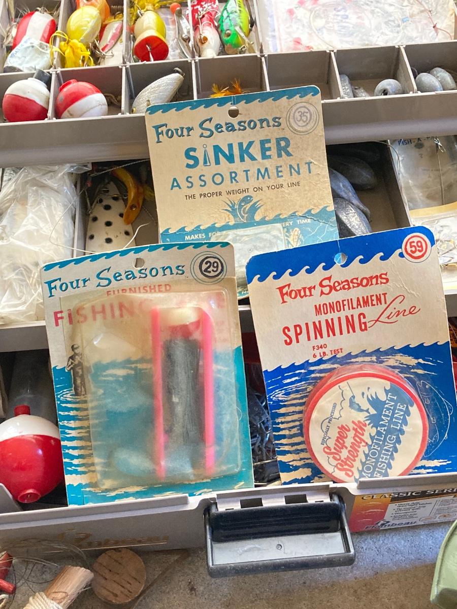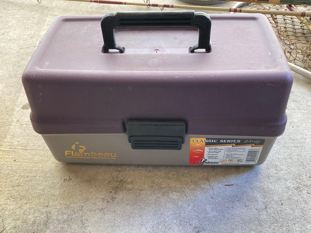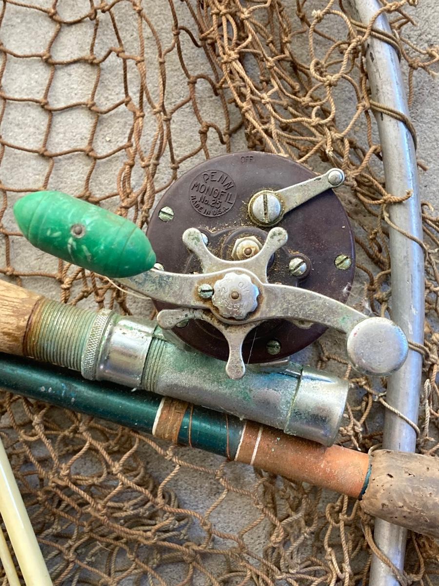 LOT 53: Fishing Collection - Tackle Box, South Bend Reel, Rods, Lures, Detty's Fish Gripper Tool, Minnow Catcher and More