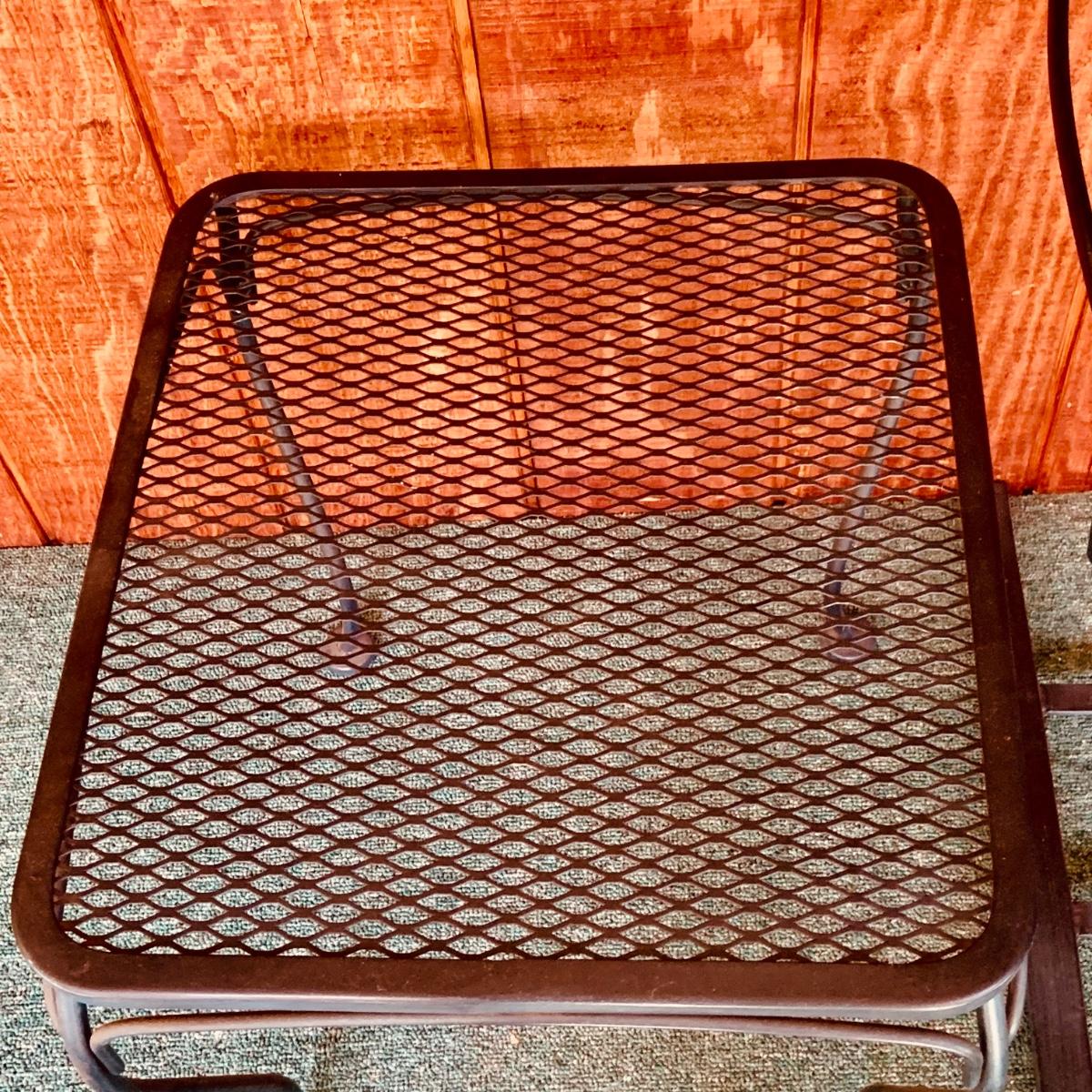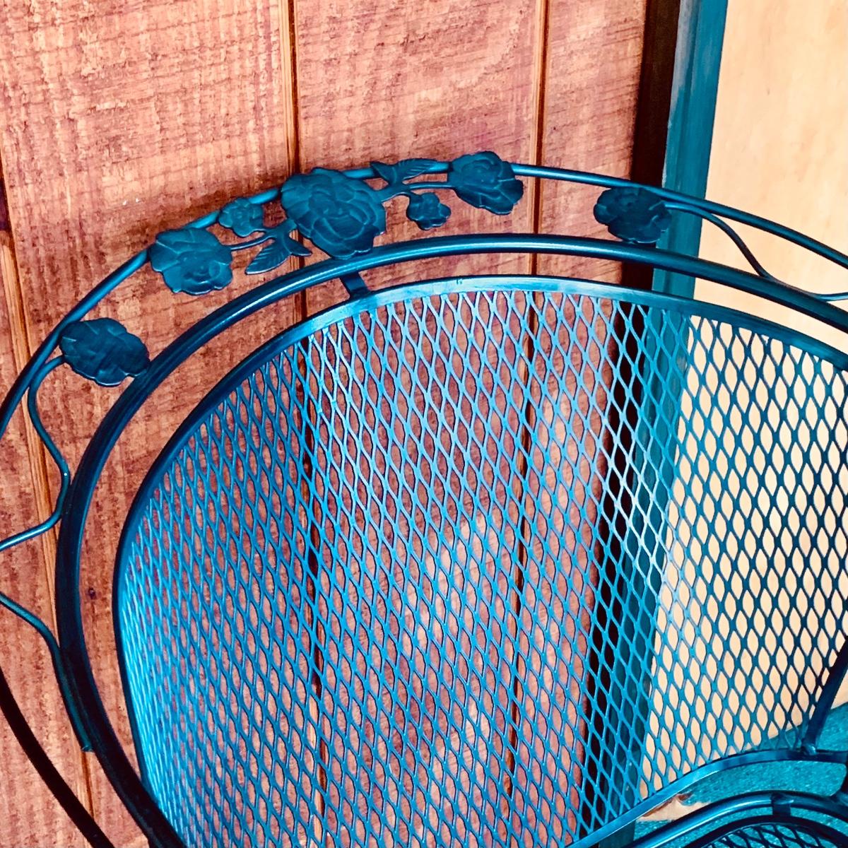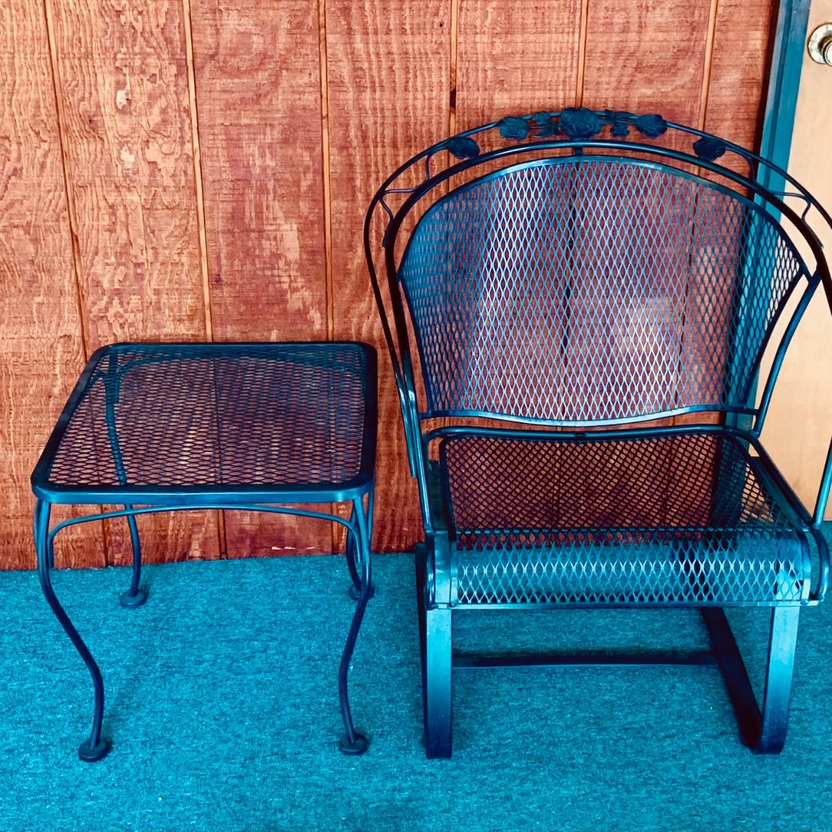 LOT:57: Vintage Mid-Century Green Carve Back Salterini Style Outdoor Chair with Cushion and Side Table