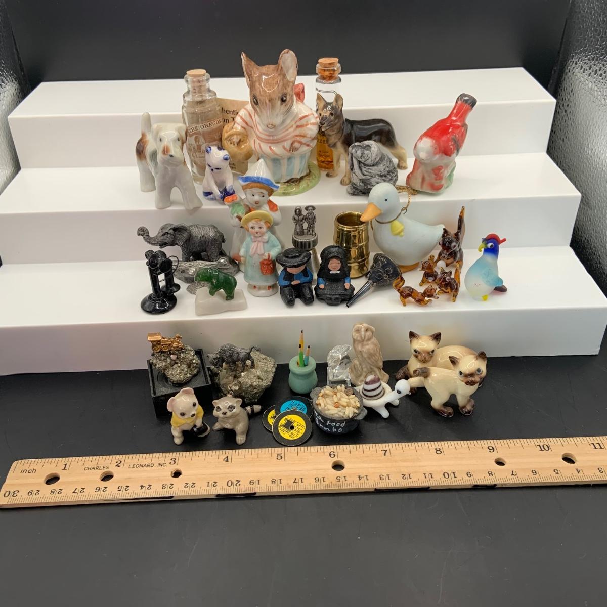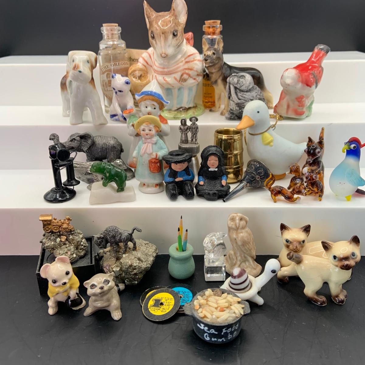 LOT:80: Varied Assortment of Miniature Collectables Including Cast Iron, Pulled Glass and Featuring Beatrix Potter's Mrs Tittlemouse by Beswick
