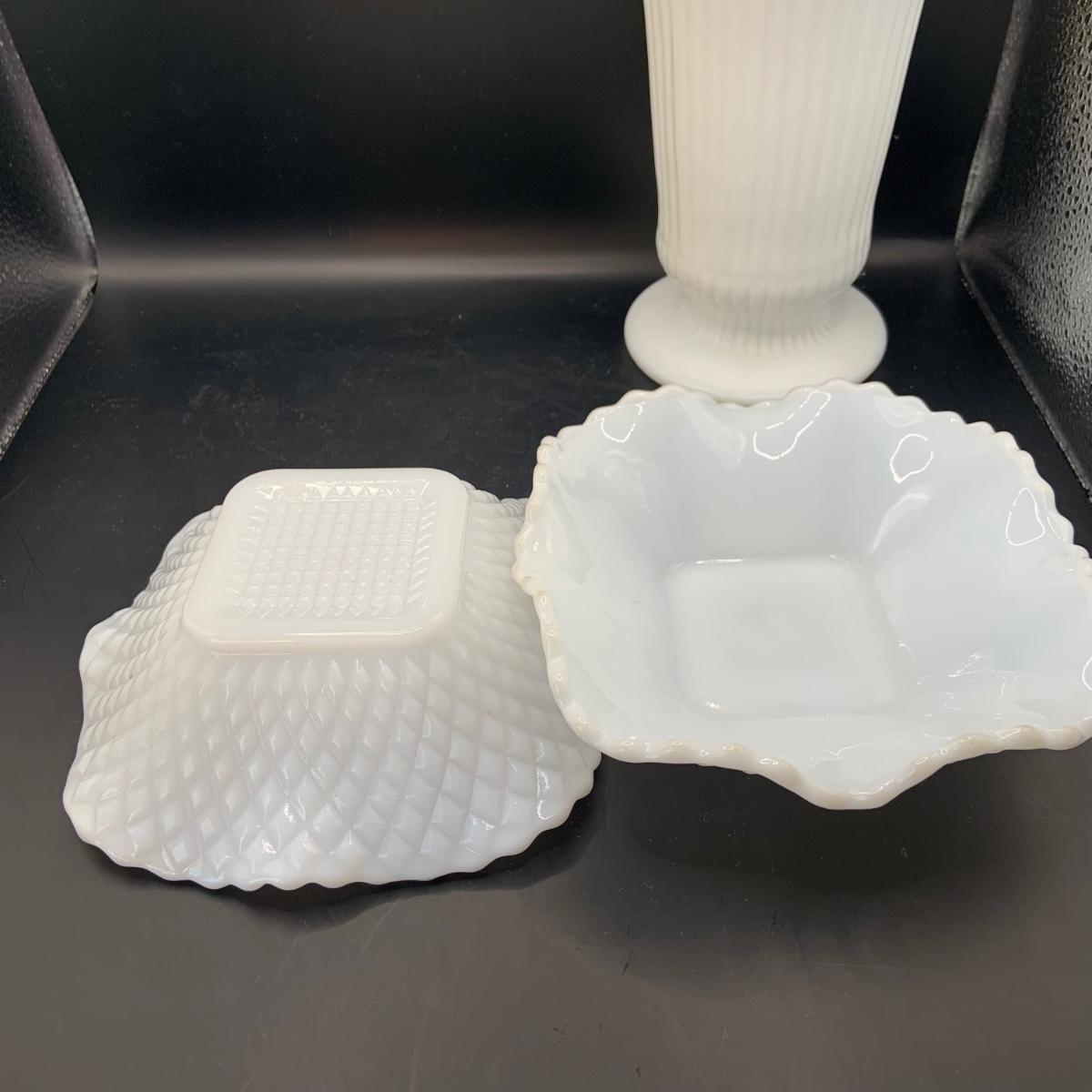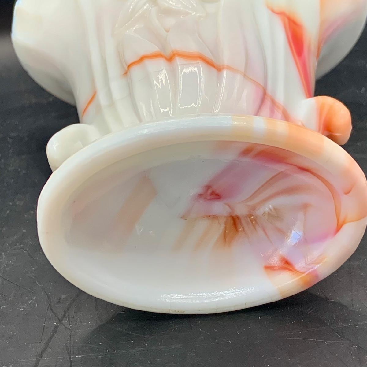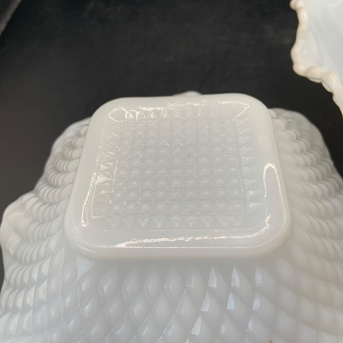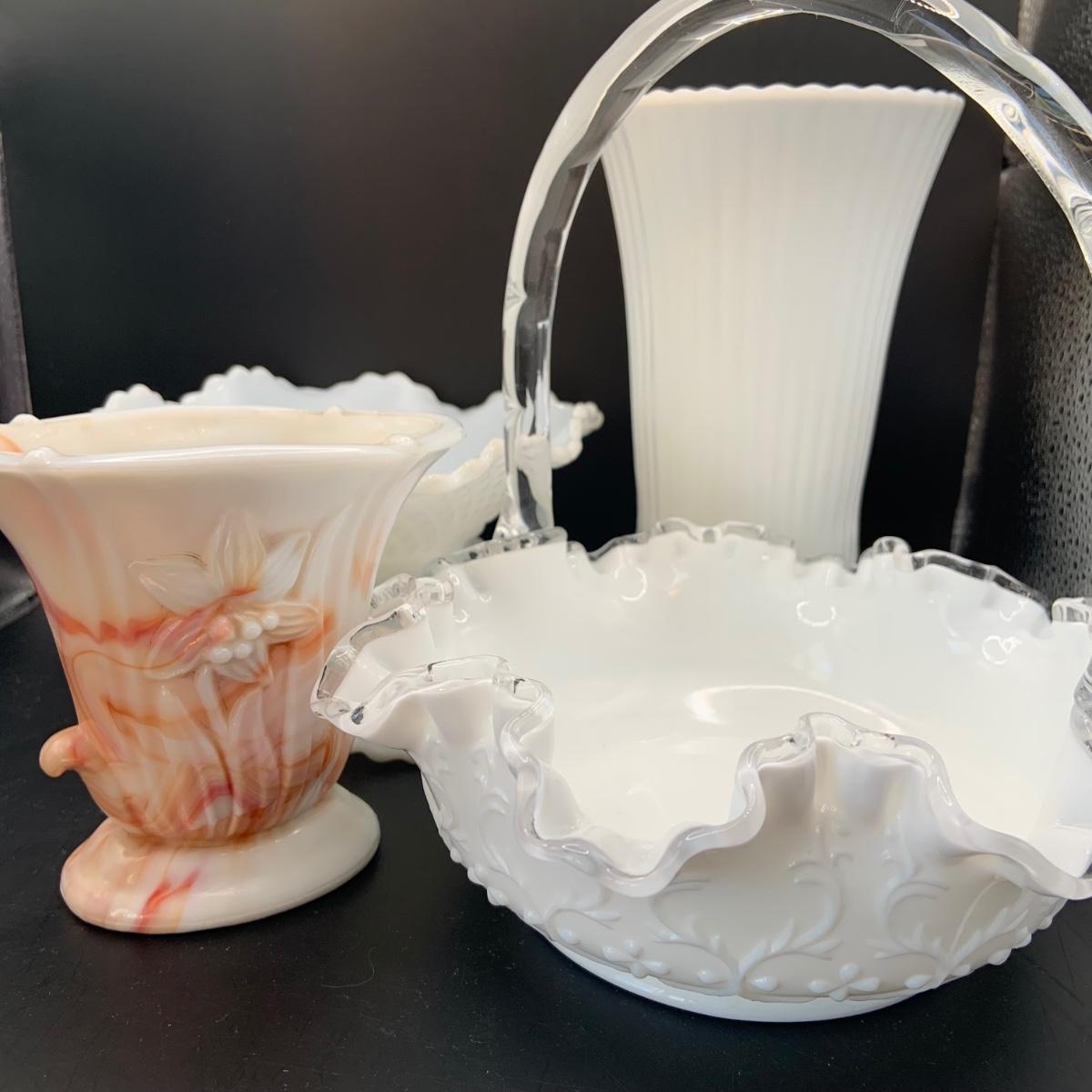 LOT:81: Alron Agate Slag Glass Orange Lily Vase, Fenton Silver Crest Ruffled Bride's Basket Brody Tall Flower Milk Glass Vase, 2 Square Diamond Cut Ruffled Milk Glass Nut Dishes,