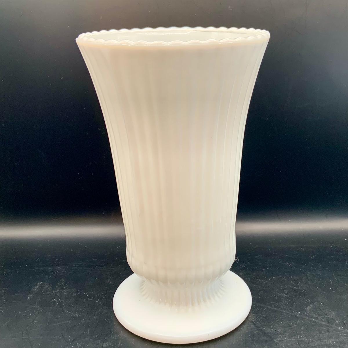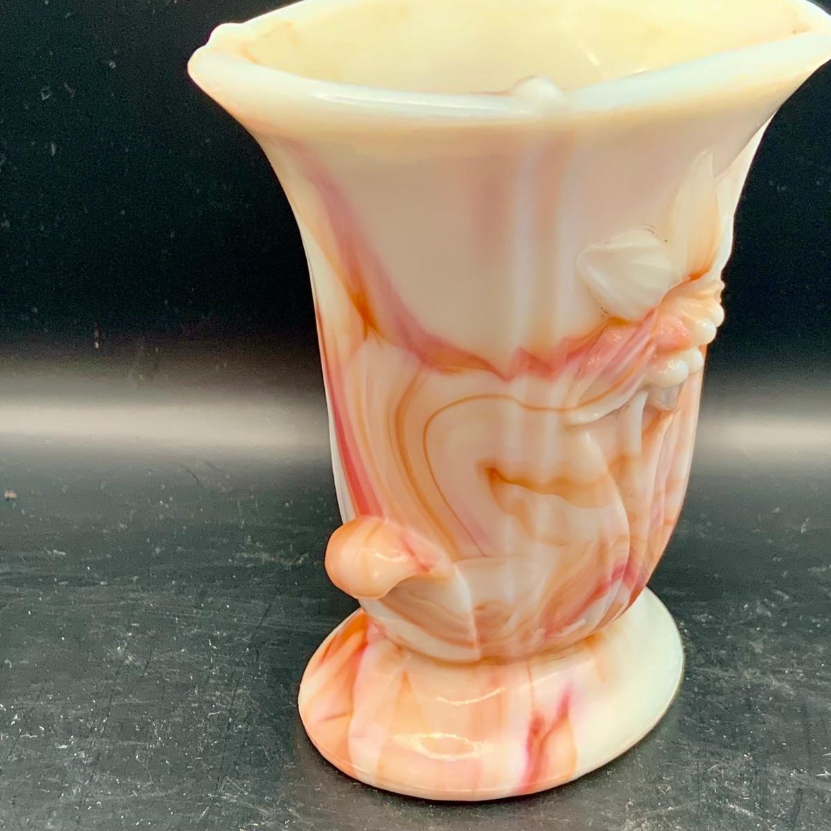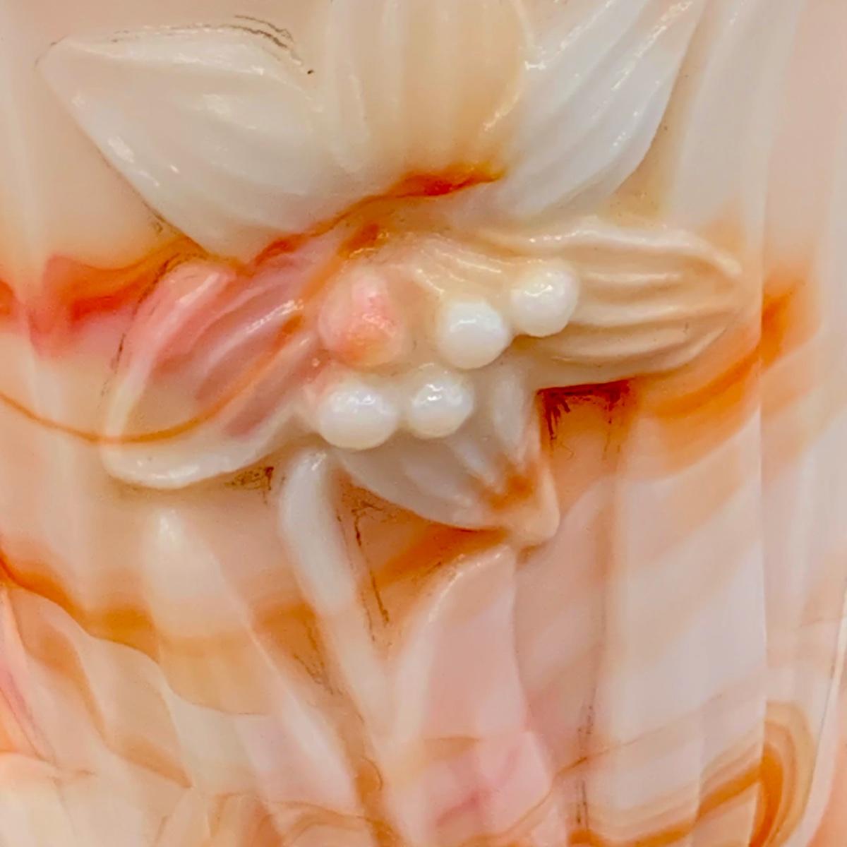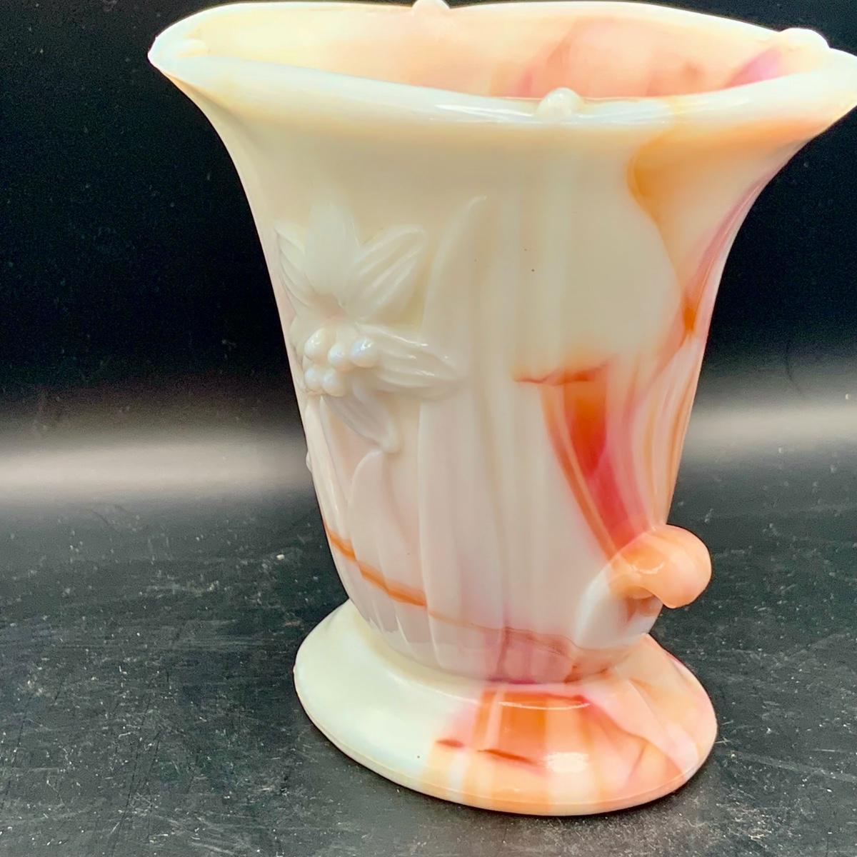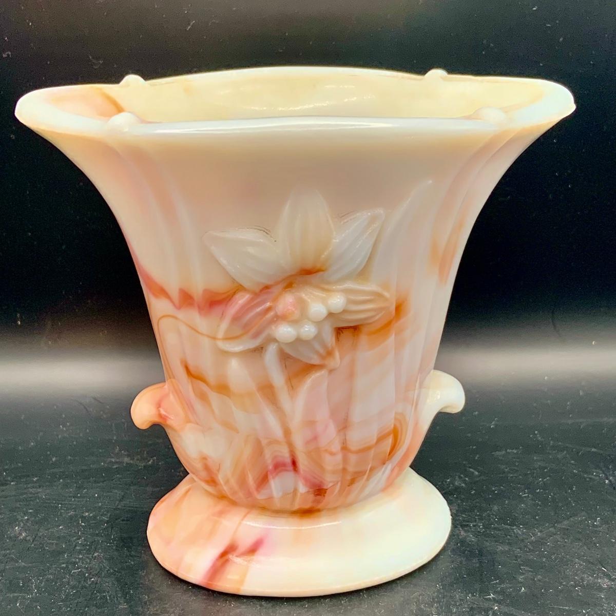 LOT:81: Alron Agate Slag Glass Orange Lily Vase, Fenton Silver Crest Ruffled Bride's Basket Brody Tall Flower Milk Glass Vase, 2 Square Diamond Cut Ruffled Milk Glass Nut Dishes,