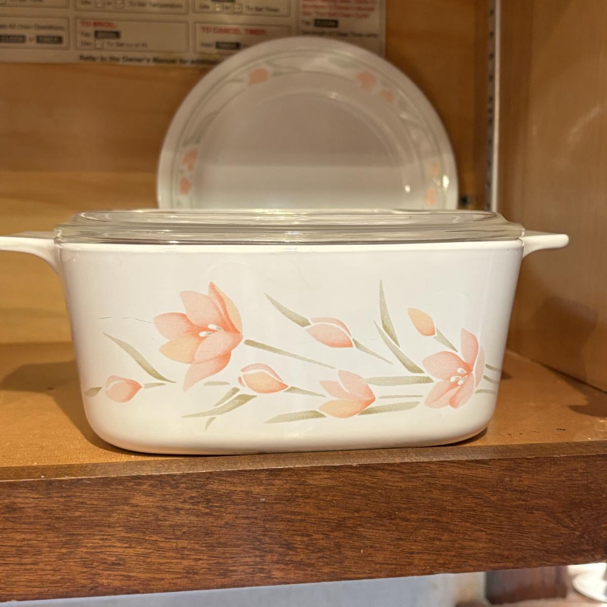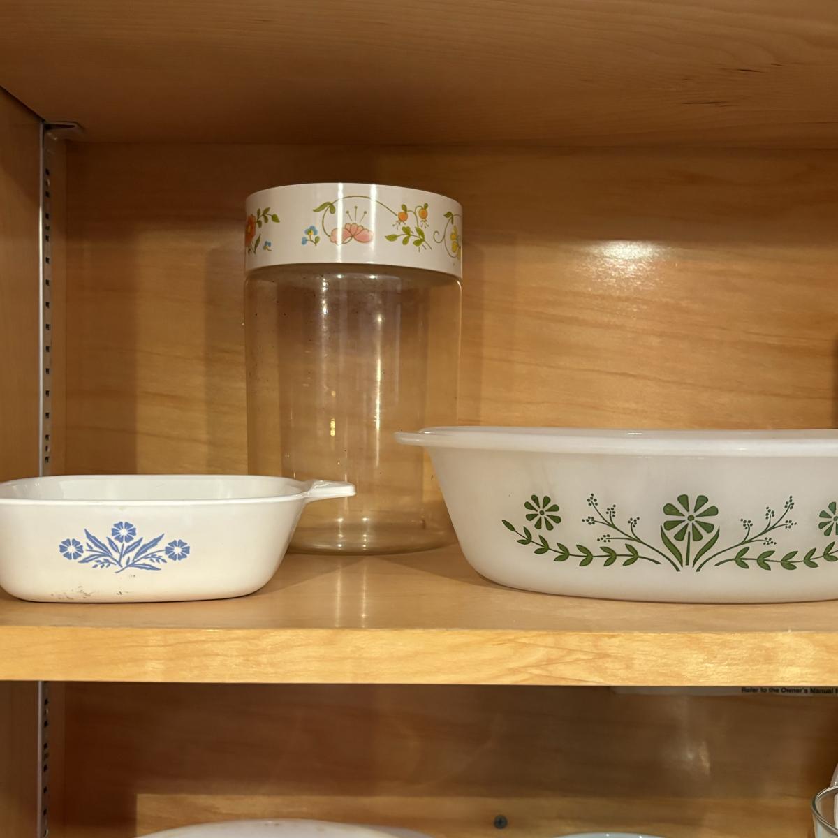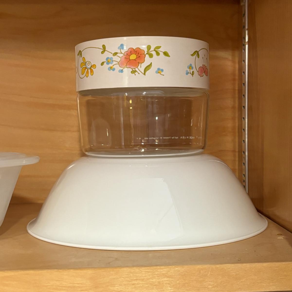 LOT 82: Pyrex, Glassbake, Corelle, Stack 'n Store Wildflower Canisters