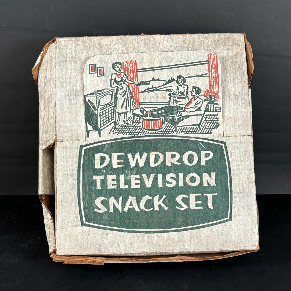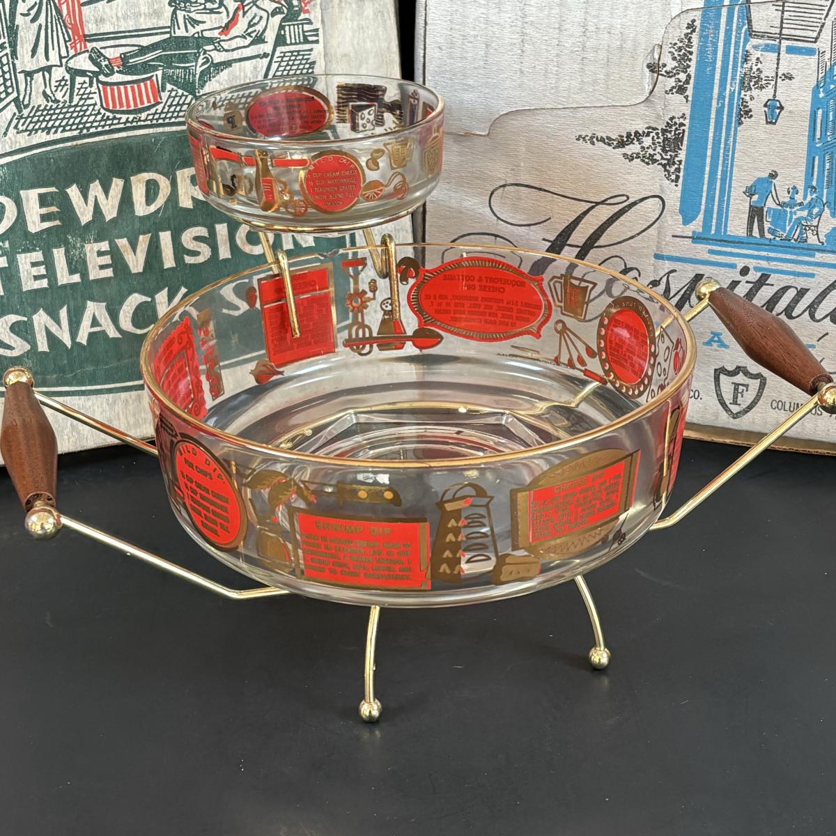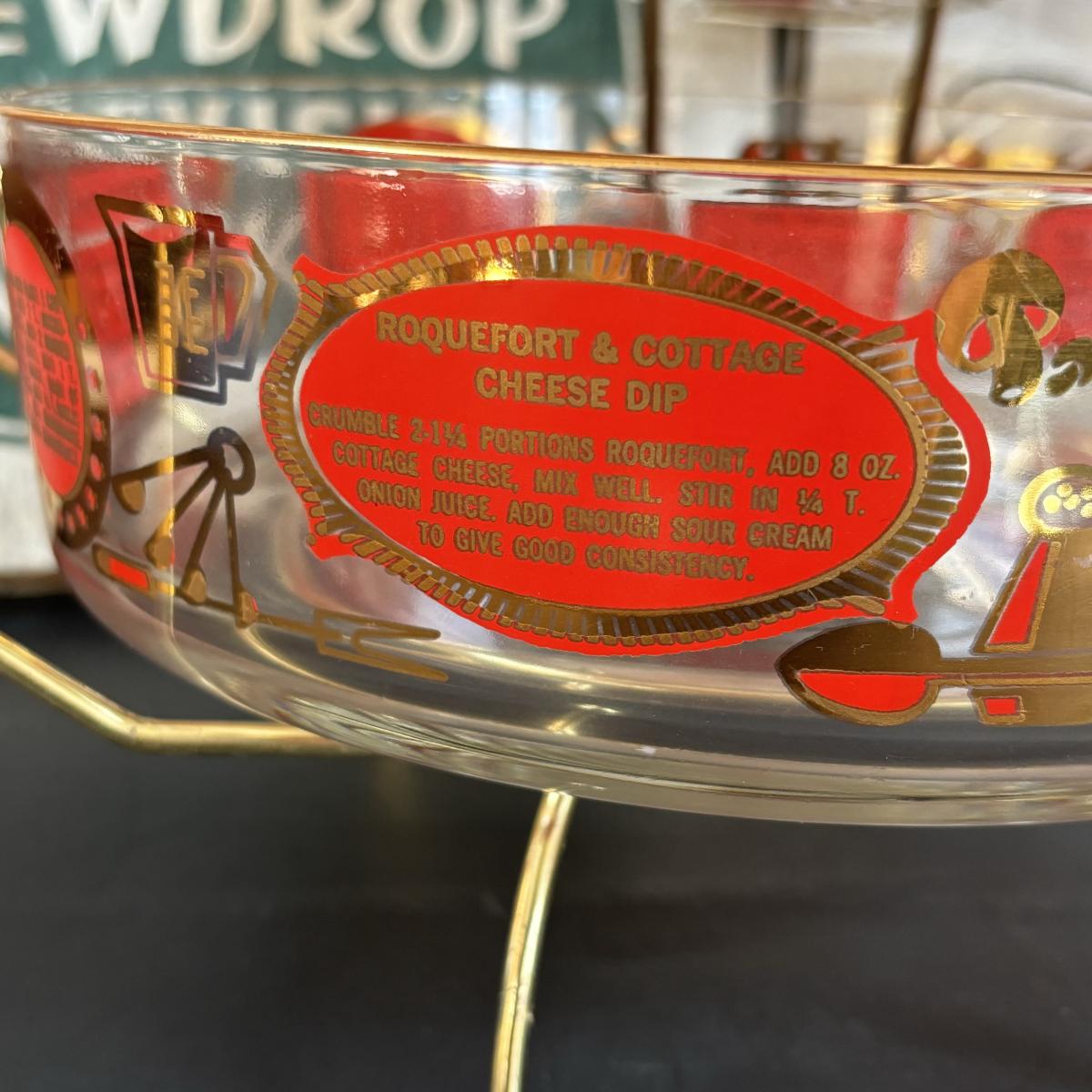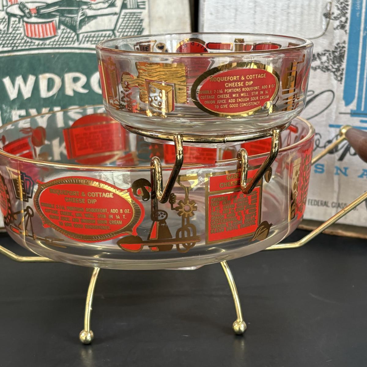 LOT 83: Vintage Red/Gold Chip & Dip Set, Dewdrop Television Snack Set & Federal Glass Hospitality Snack Set