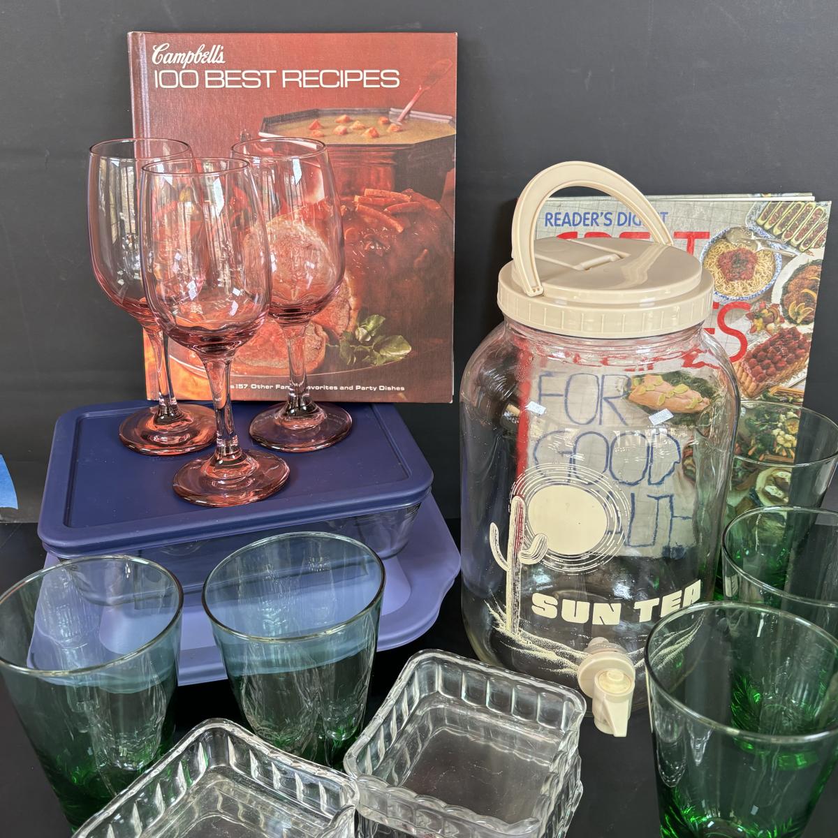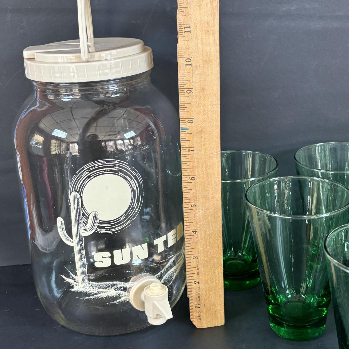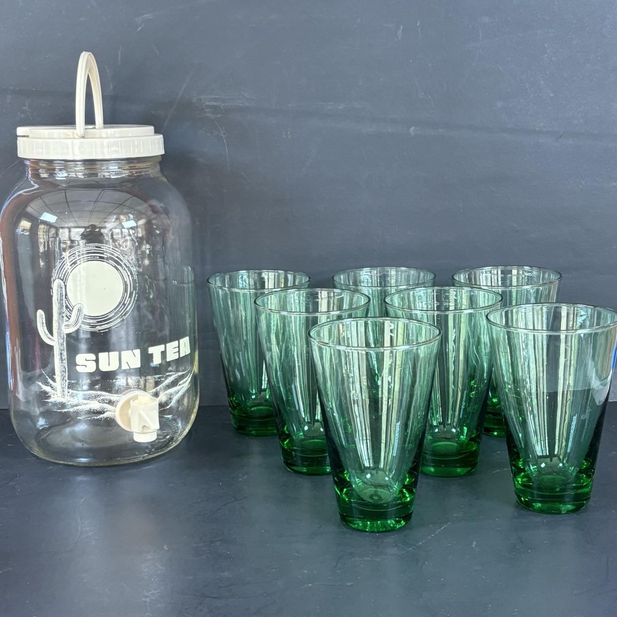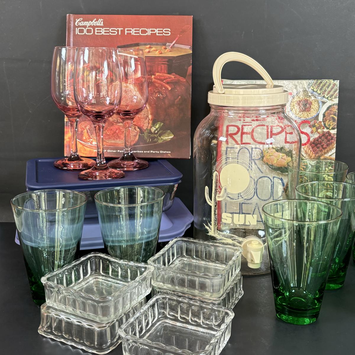 LOT 84: Vintage Sun Tea Glass Dispenser Picnic Jug, Green Flared Iced Tea Glasses, Pyrex Lidded Casseroles Dishes, Glass Snack Dishes & More