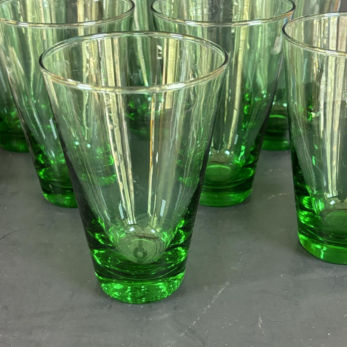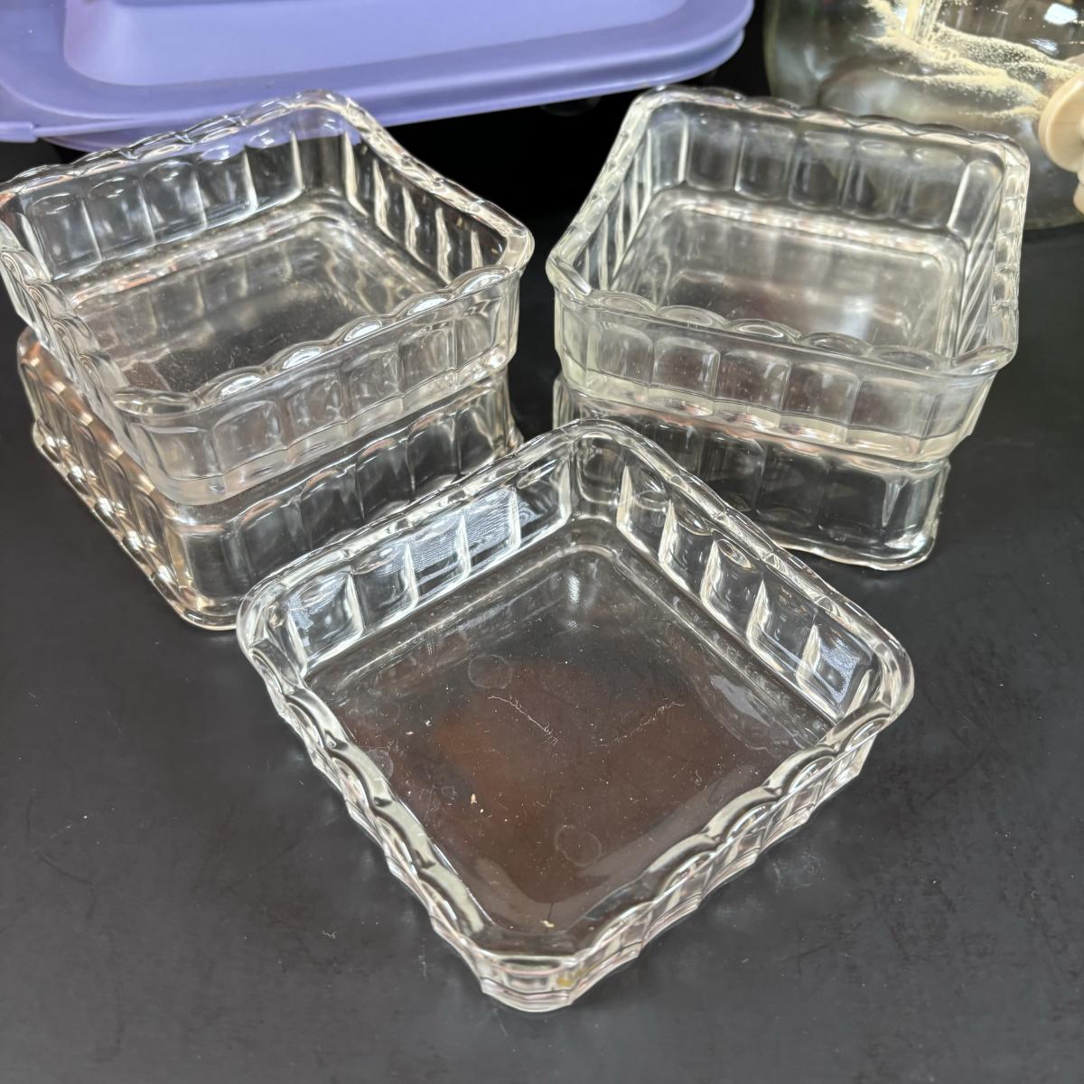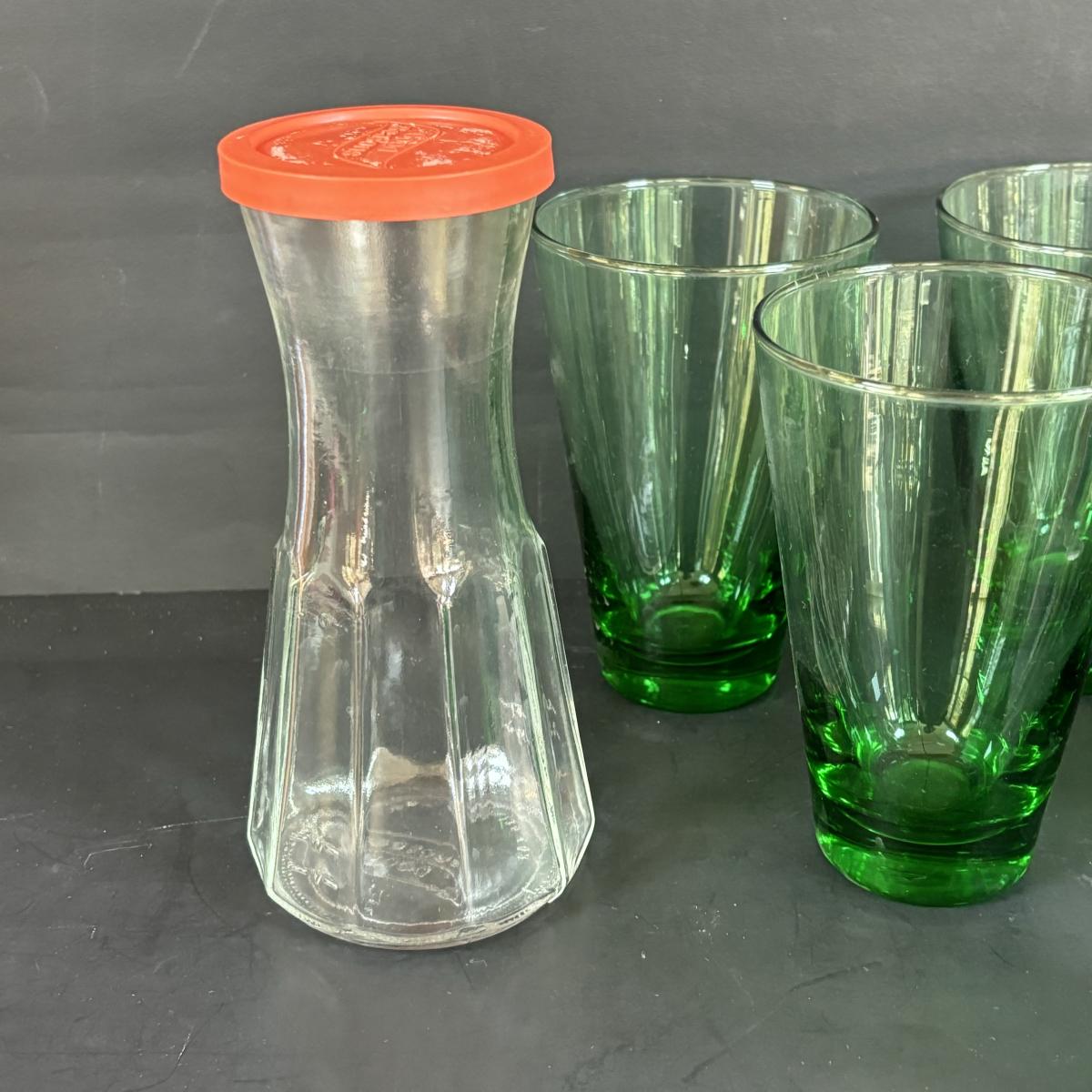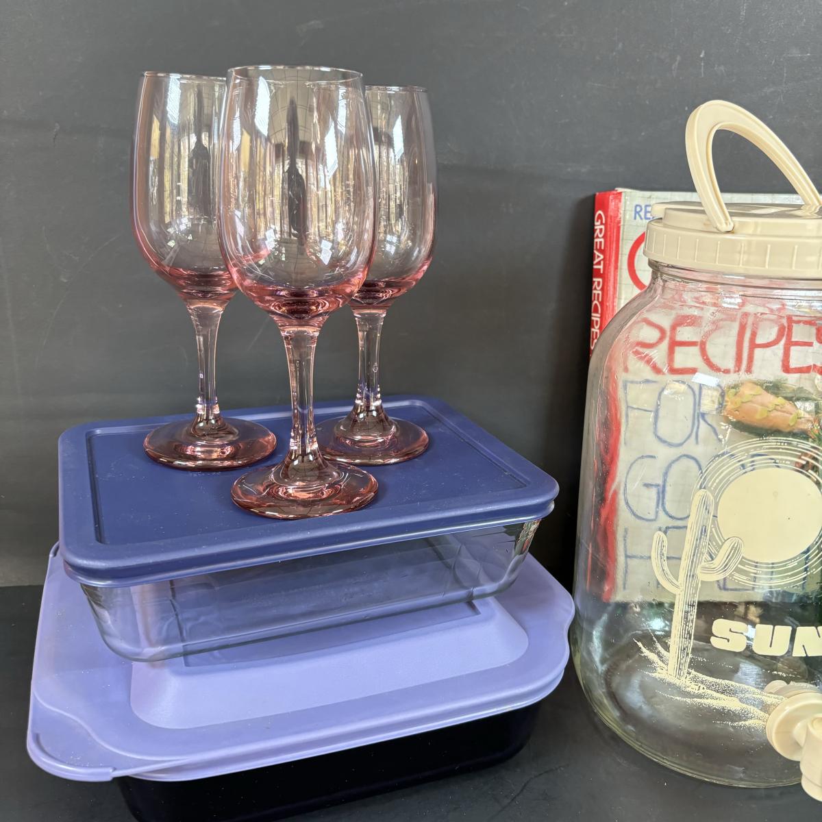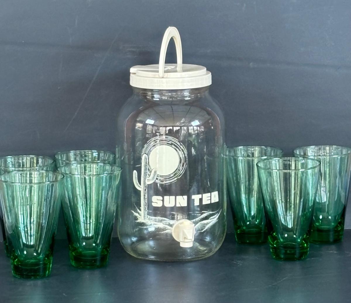 LOT 84: Vintage Sun Tea Glass Dispenser Picnic Jug, Green Flared Iced Tea Glasses, Pyrex Lidded Casseroles Dishes, Glass Snack Dishes & More