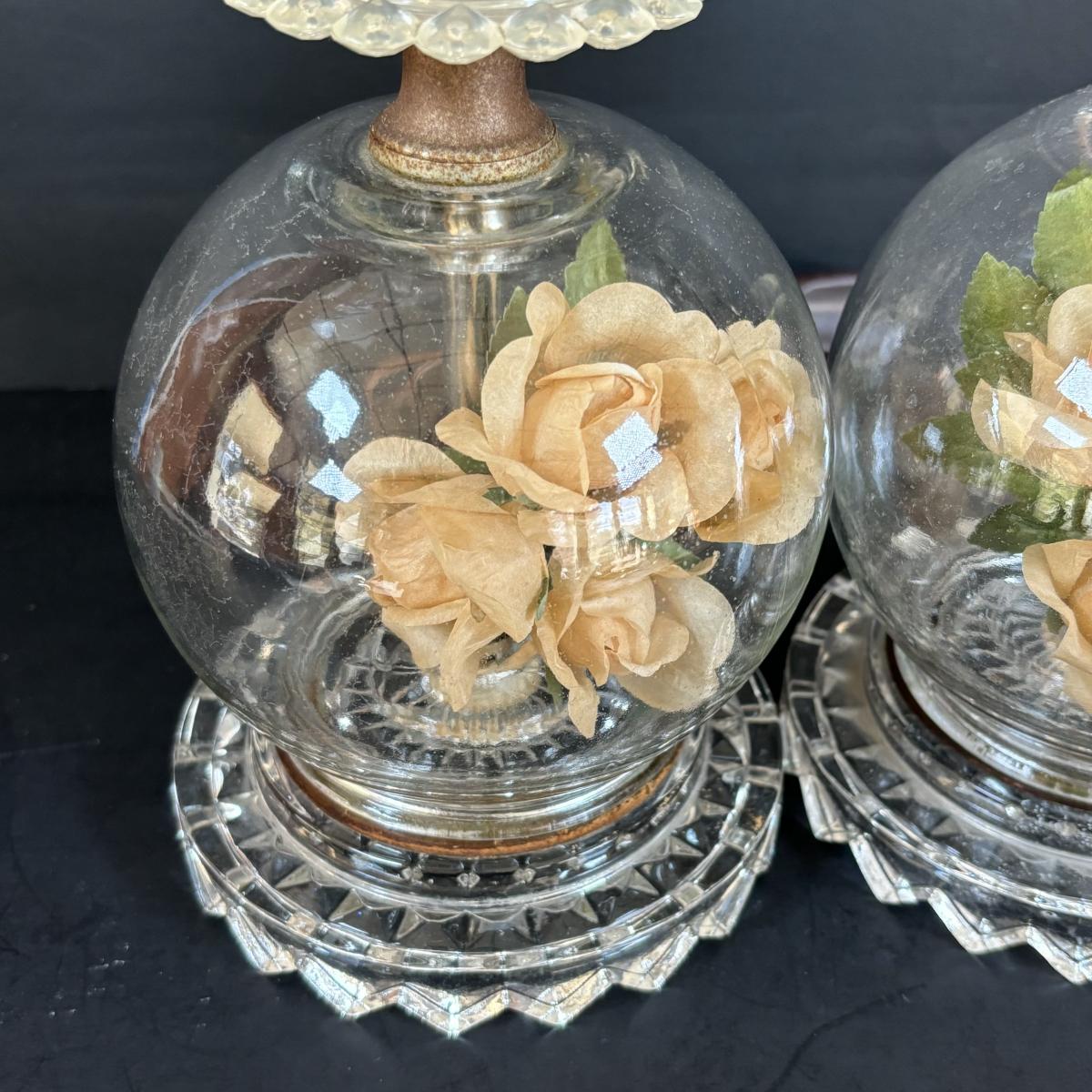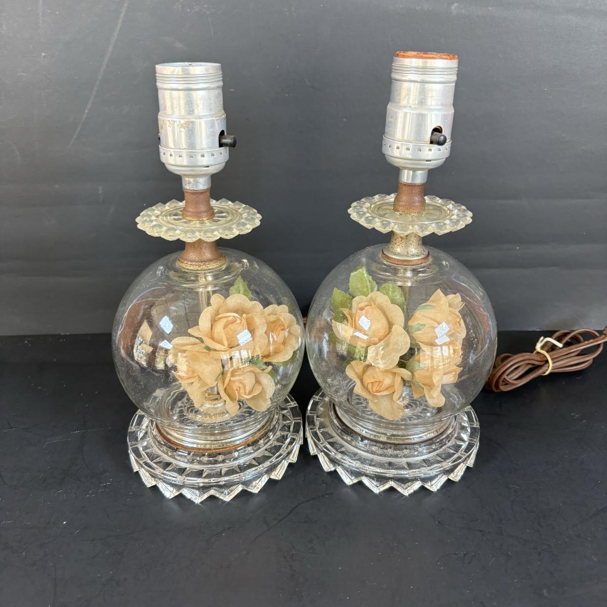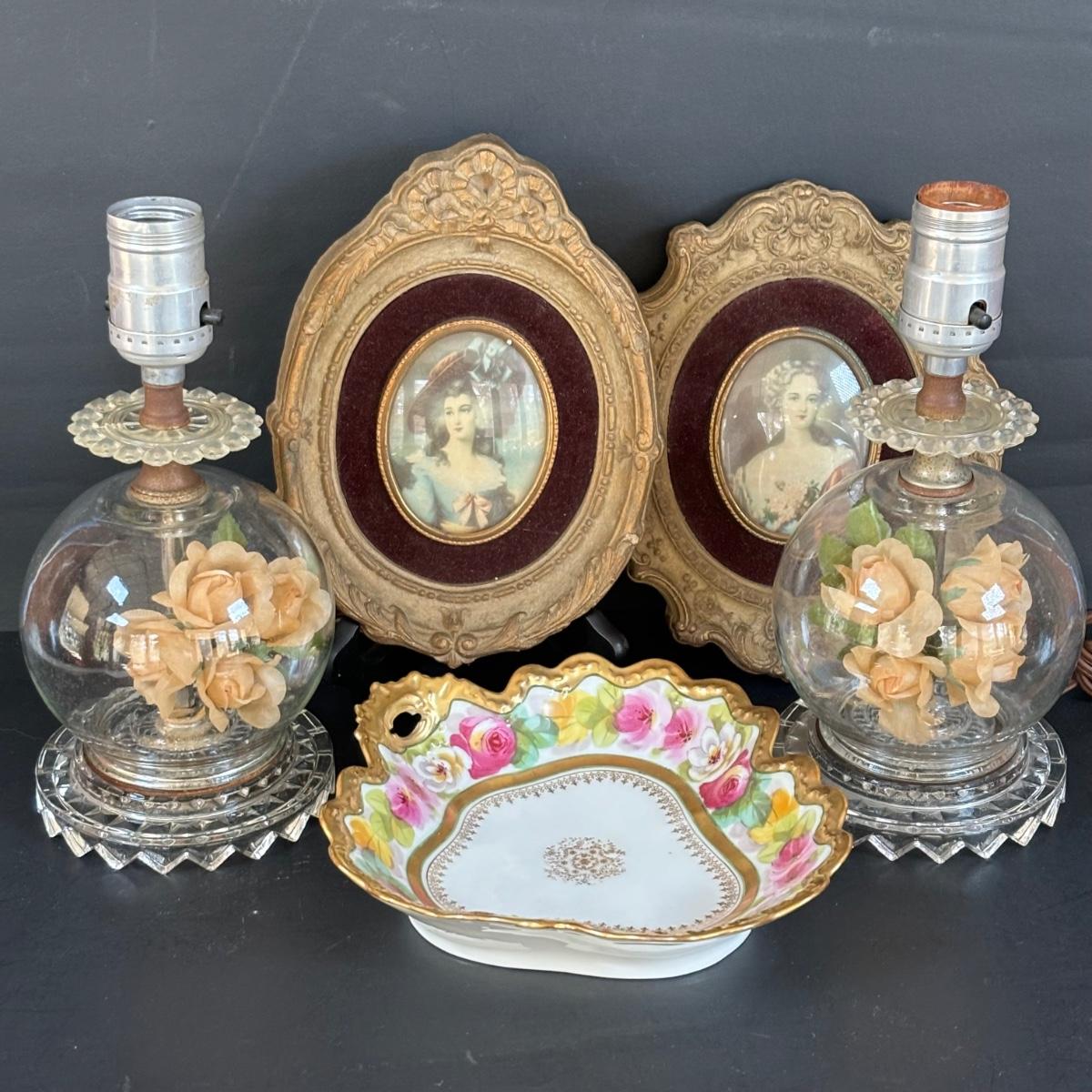 LOT 88: Vintage Cameo Creations Lady Dower & Lady Sheffield, Glass Boudoir Lamps w/Flower Globes Bases, & Limoges Trinket Tray