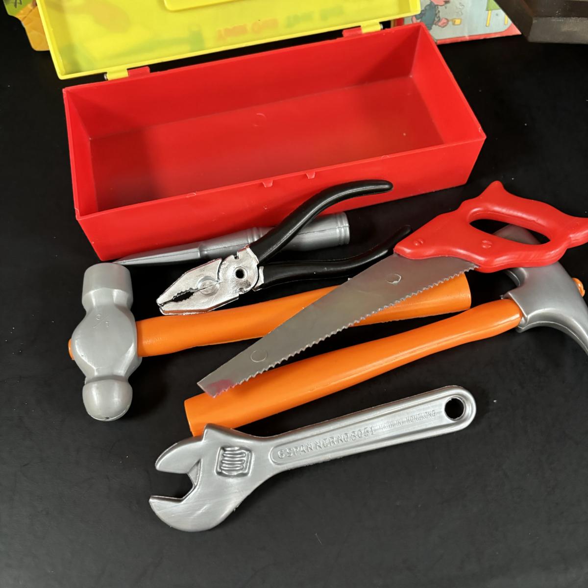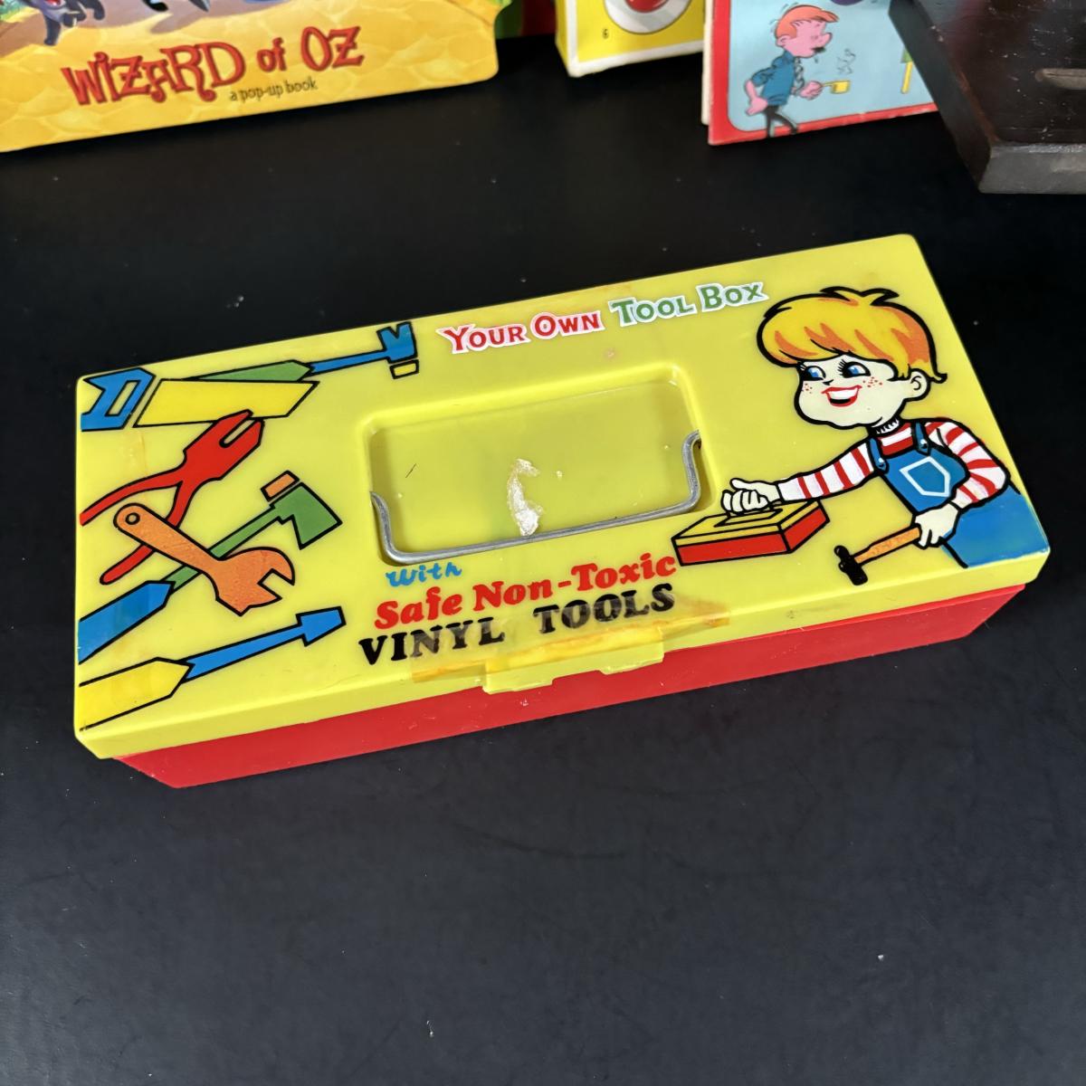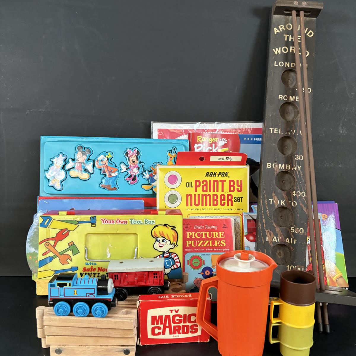 LOT 102: Vintage "Around the World" Hit the Spot Roller Game w/Steel Ball, Children's Tupperware, Your Own Toolbox w/Vinyl Tools, Thomas the Tank Engine Car/Track & More