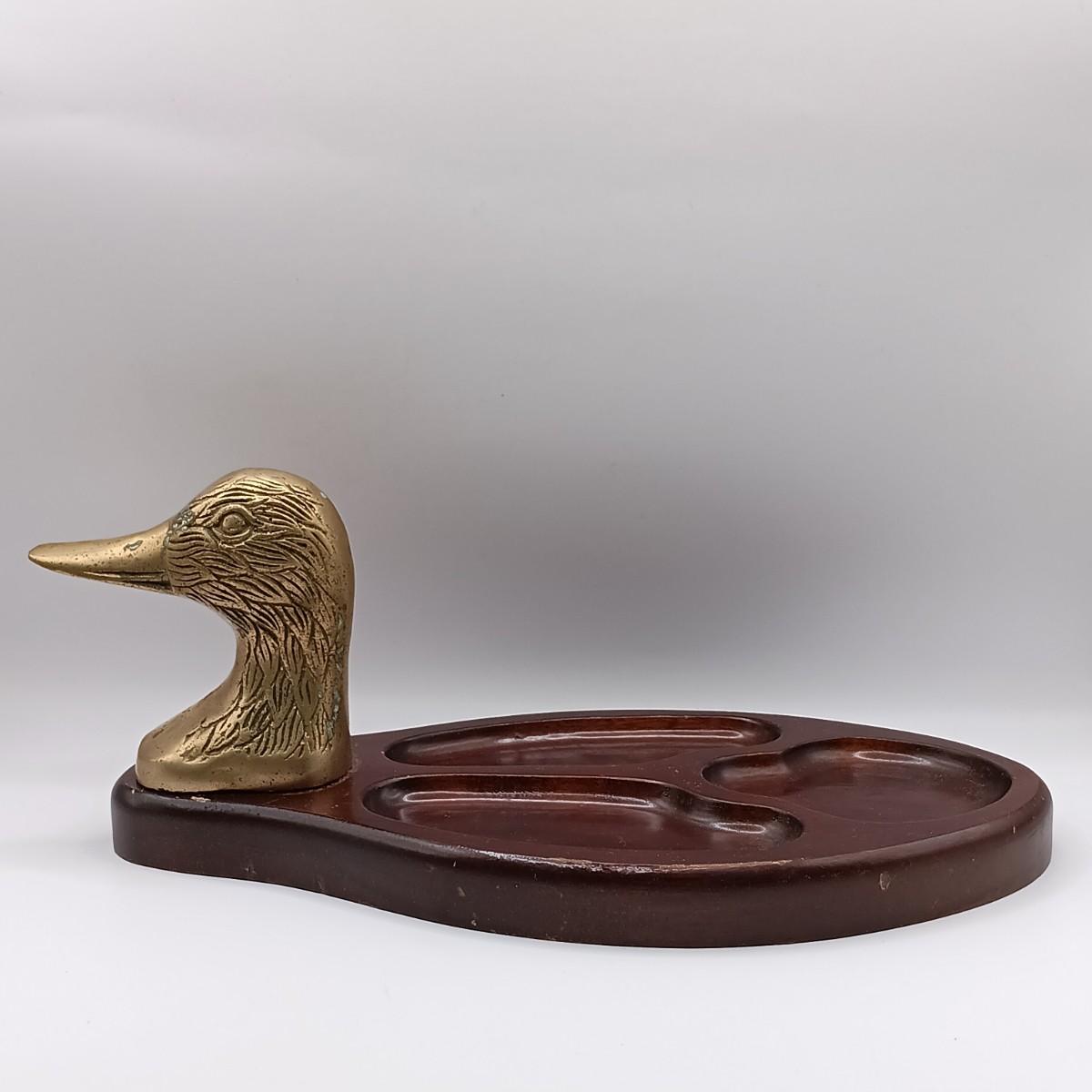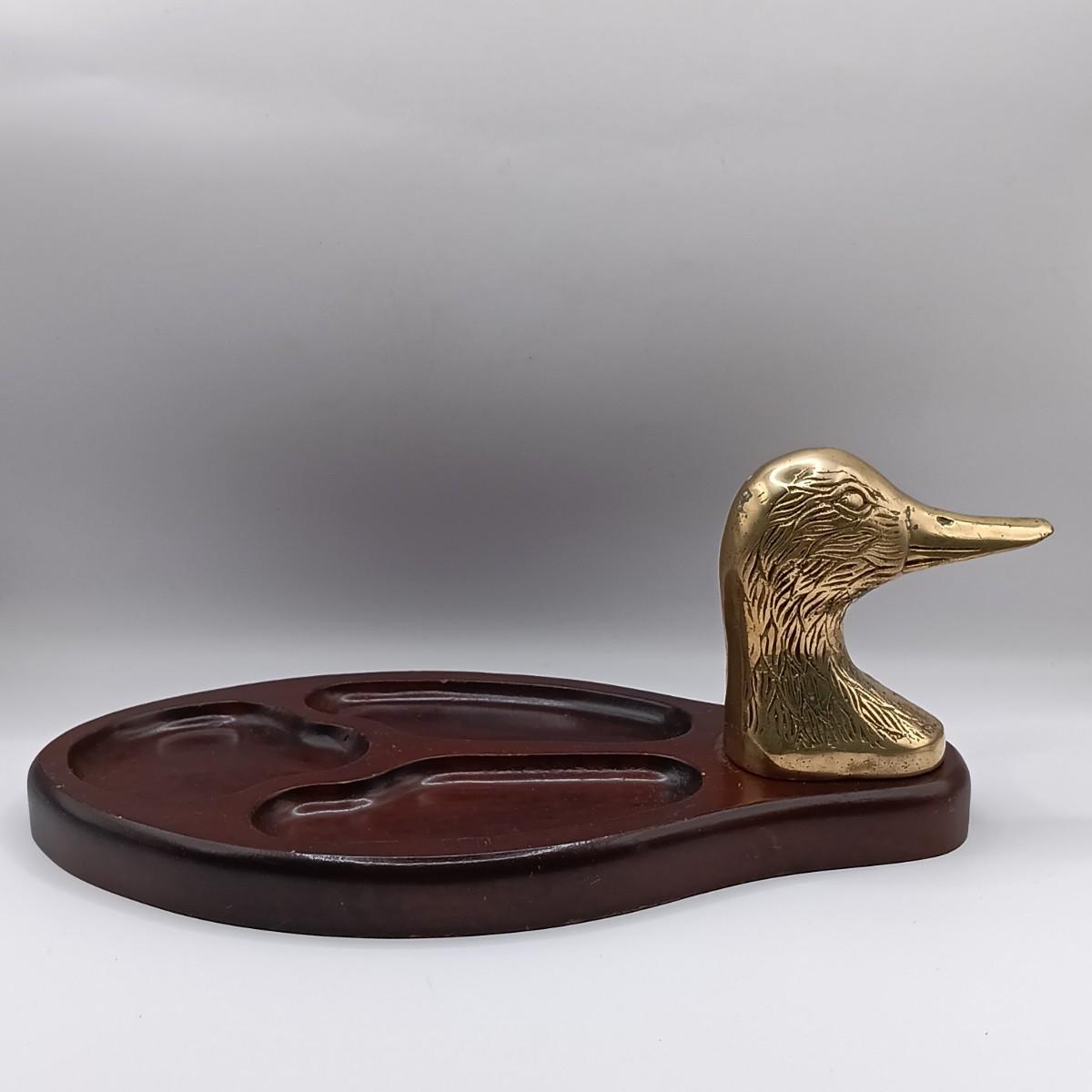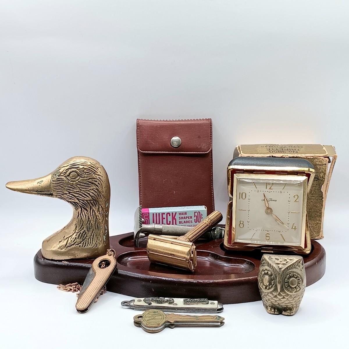 LOT 108: Wood Valet with Brass Duck Head, 1930s Gillette Oxford Safety Razor, Small Brass Owl Figurine & More