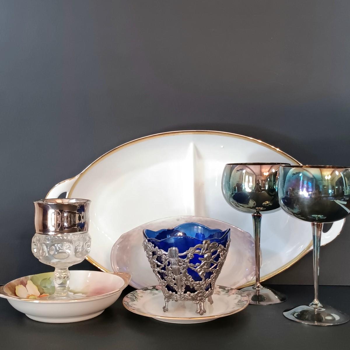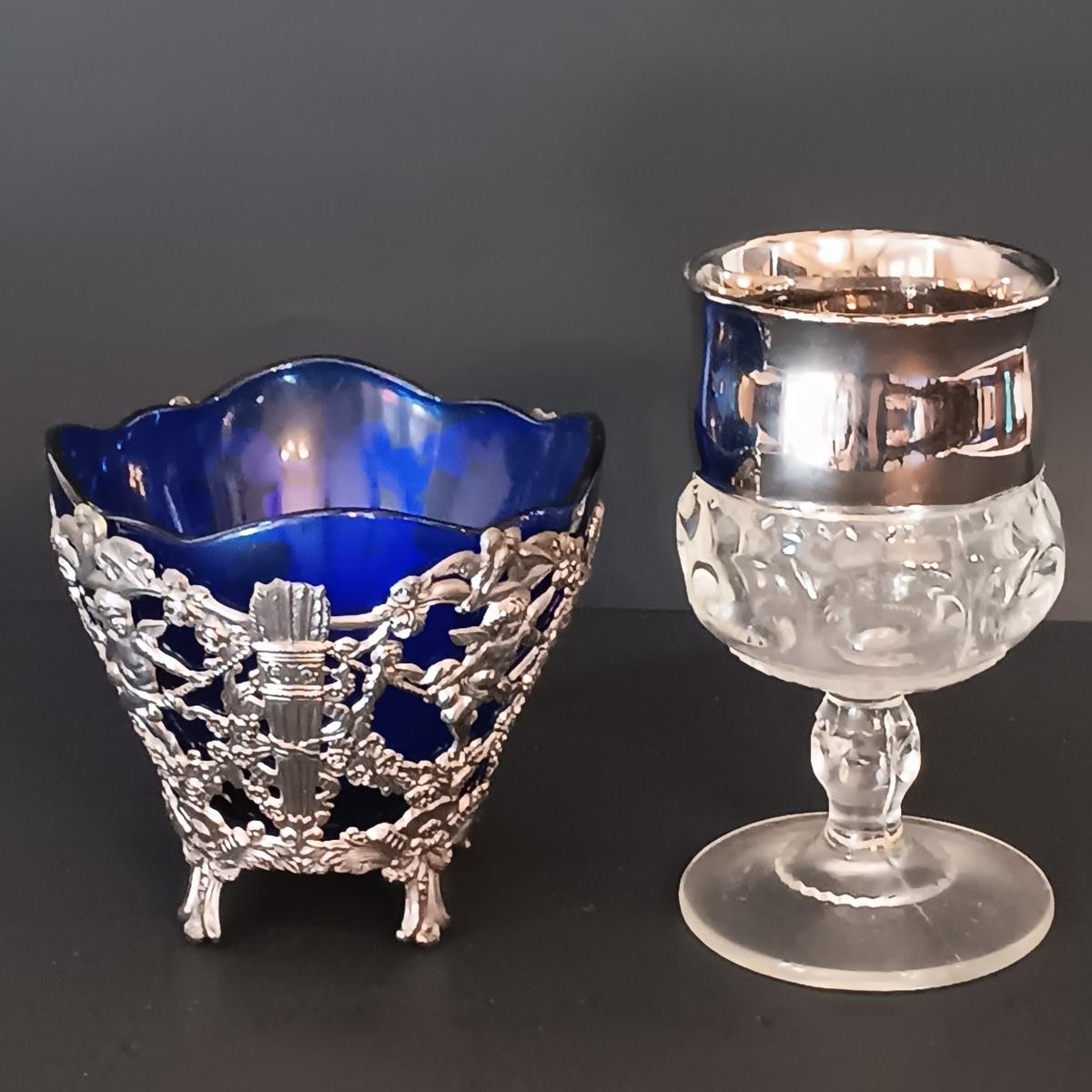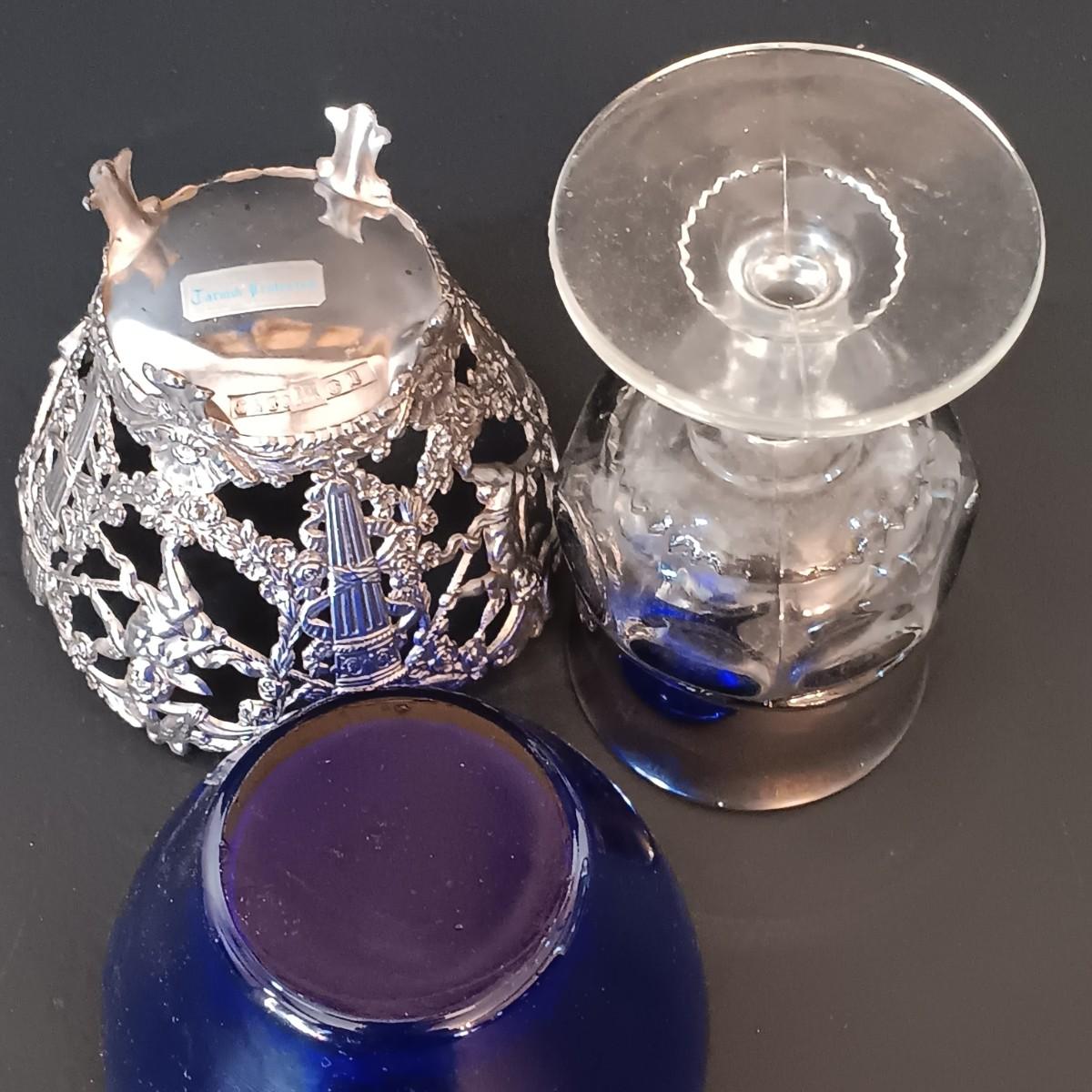 LOT 118: Bellini Brazil Metal Wine Glasses, Cobalt Blue Bowl in Ornate Footed Holder, Lenox Prairie Blossoms Plate & More