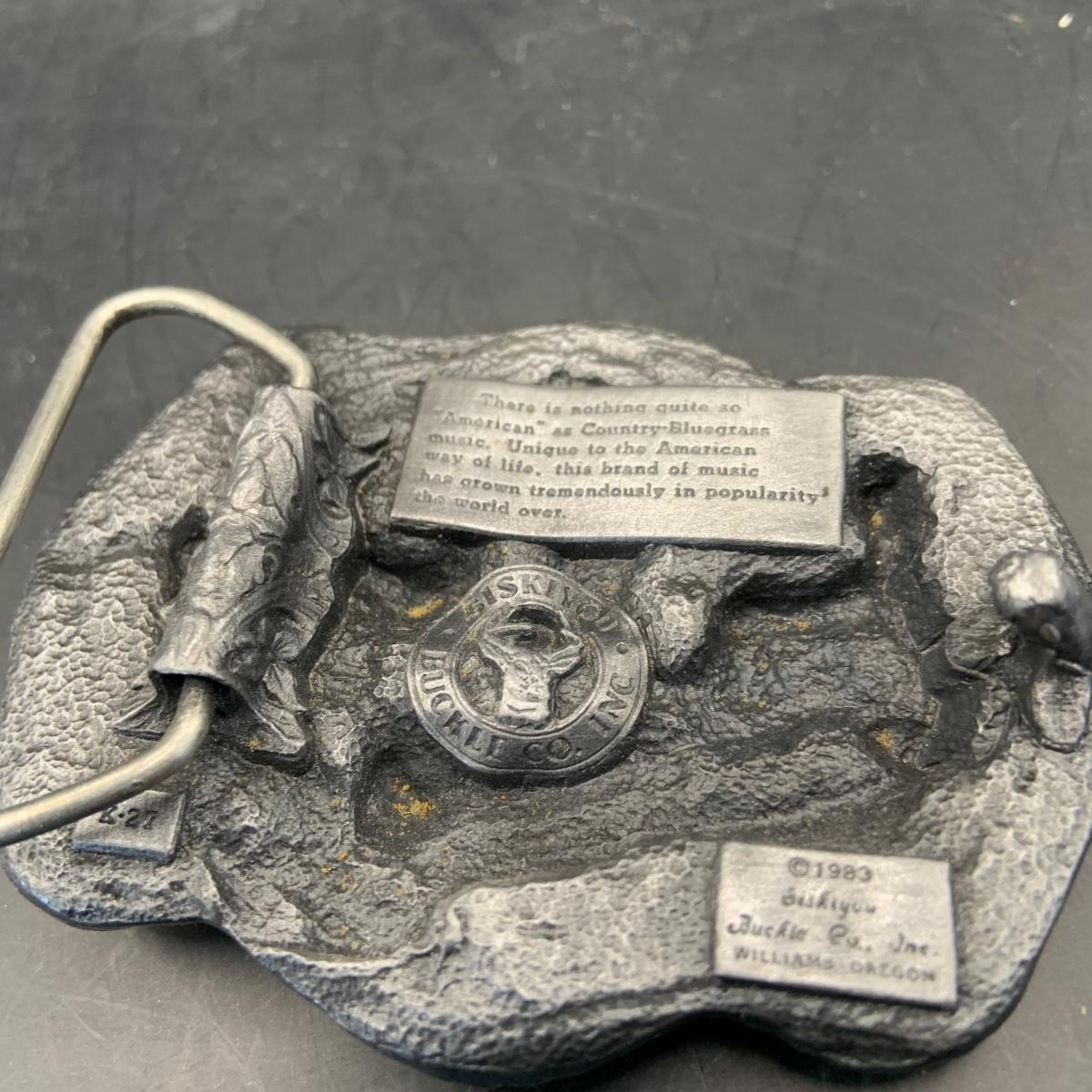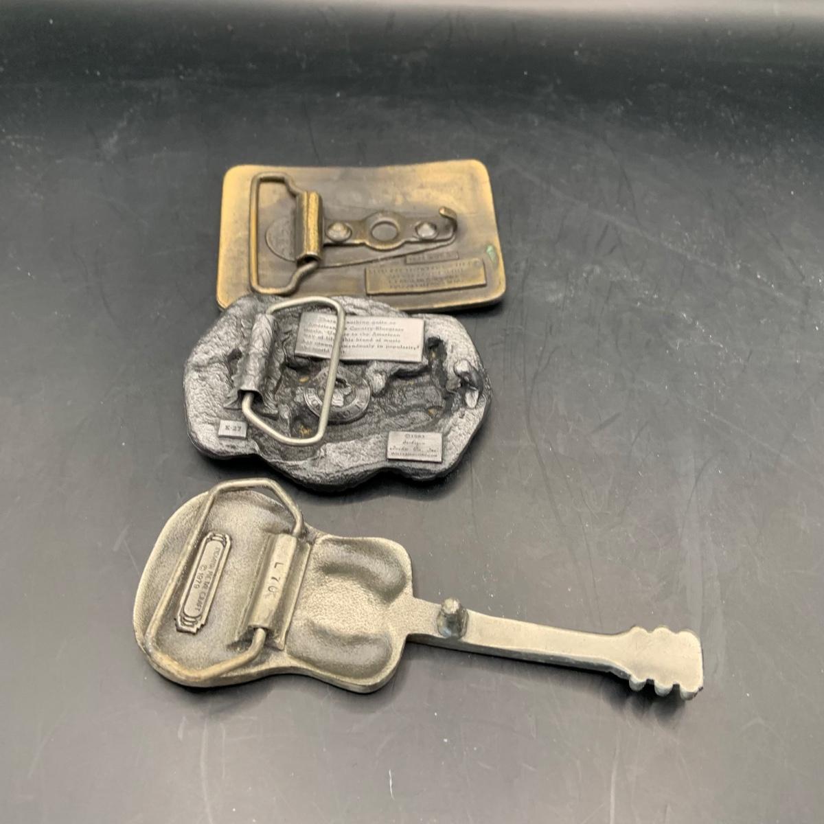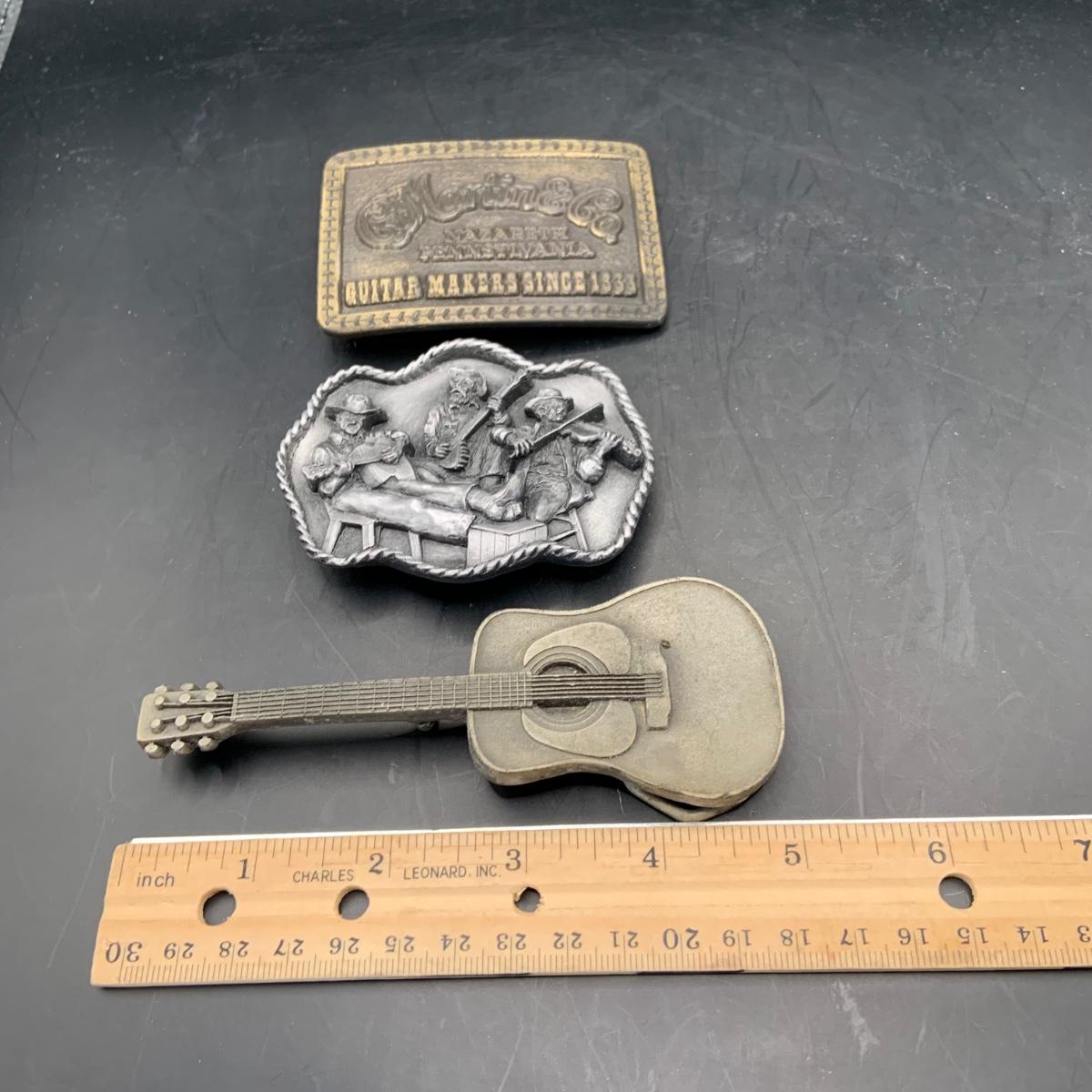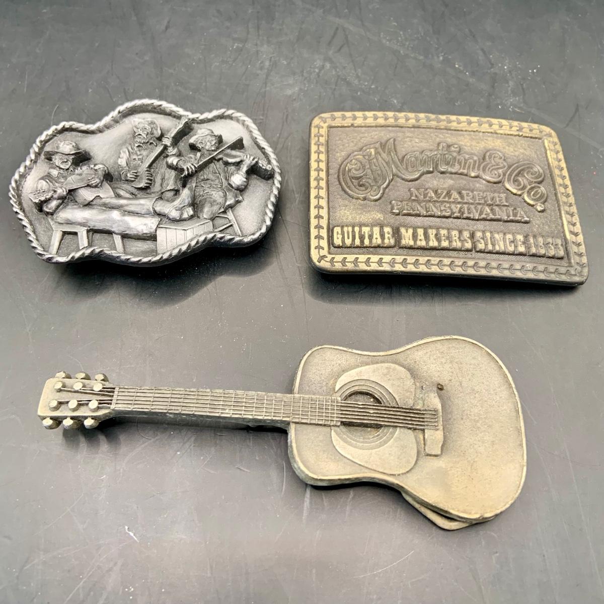LOT:136:Set of 3 Vintage Belt Buckles - 1982 Siskiyou Blue Grass Music Buckle, Martin Guitar 1975 Buckle and 1979 Indiana Metal Craft Guitar Buckle