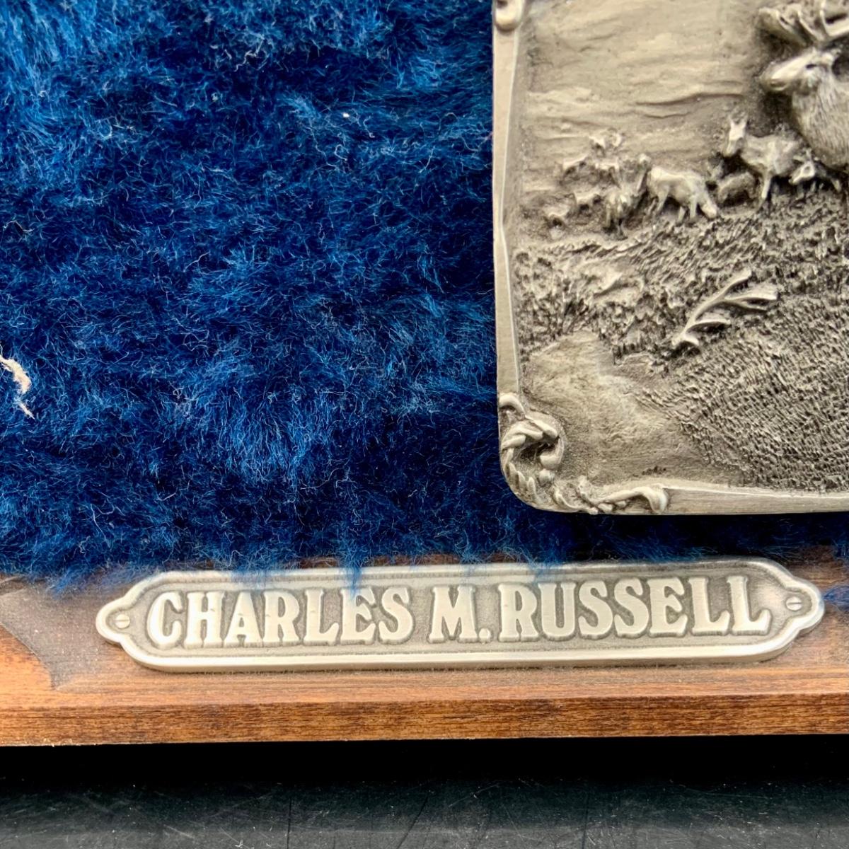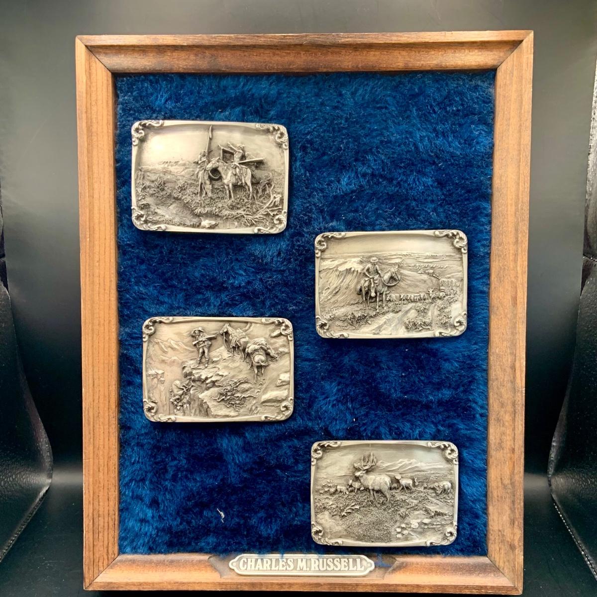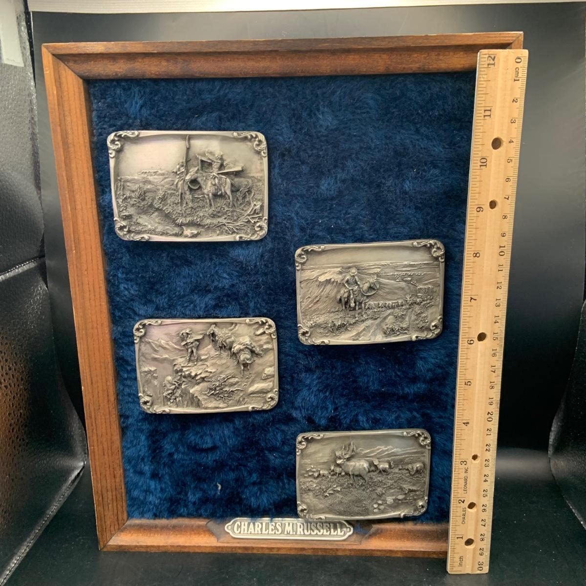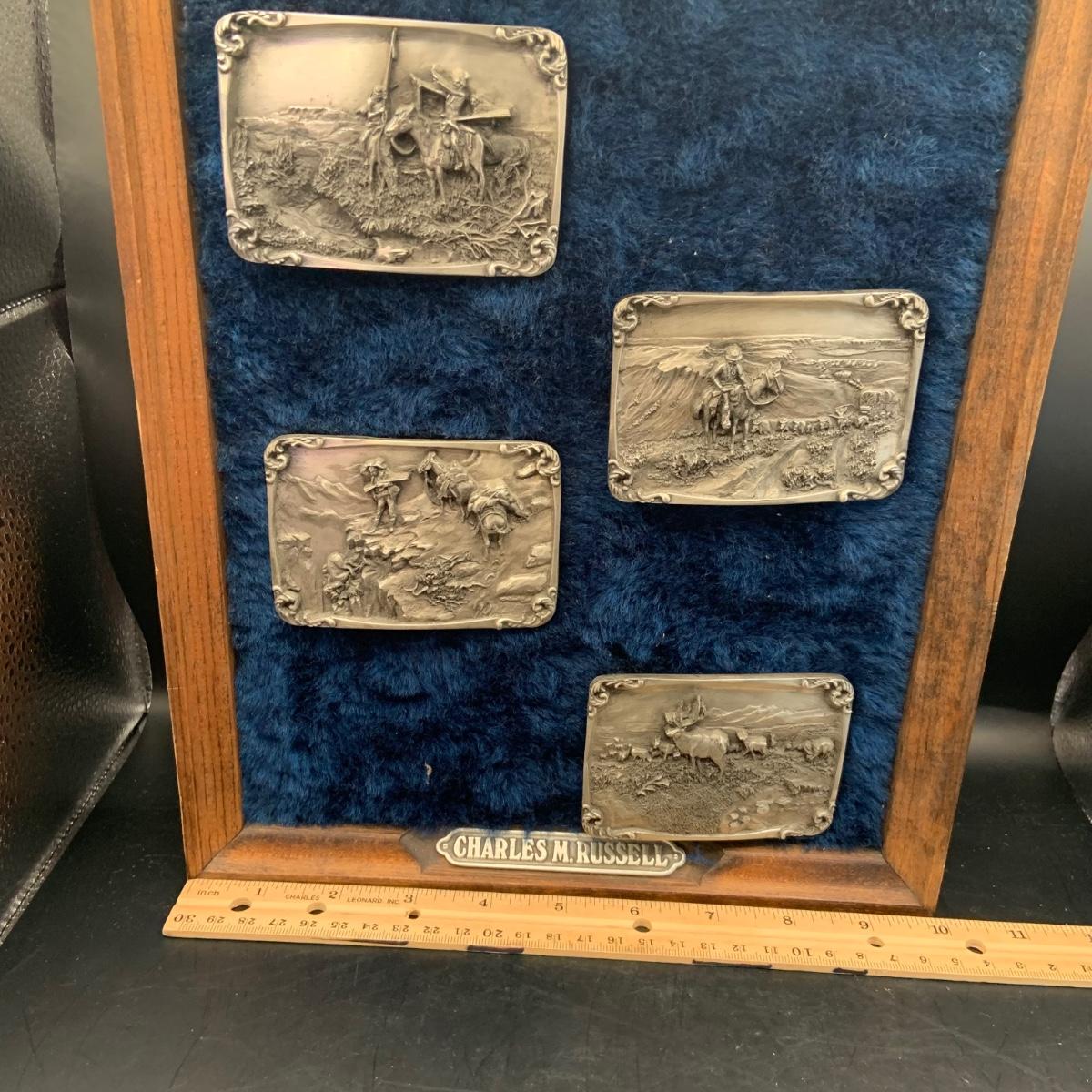 LOT:139:Collection Display of 4 Mounted Buckles - Charles M. Russell Limited Edition By Siskiyou Buckle Co