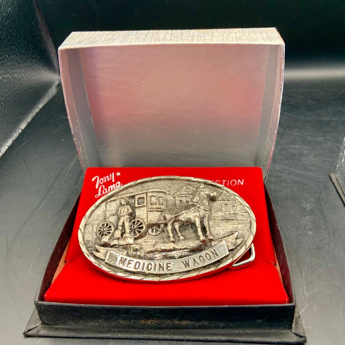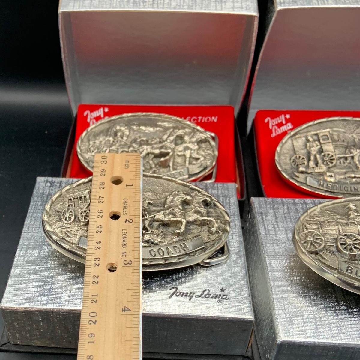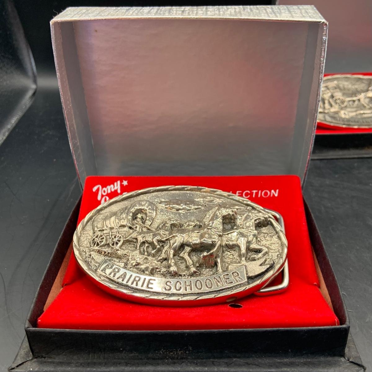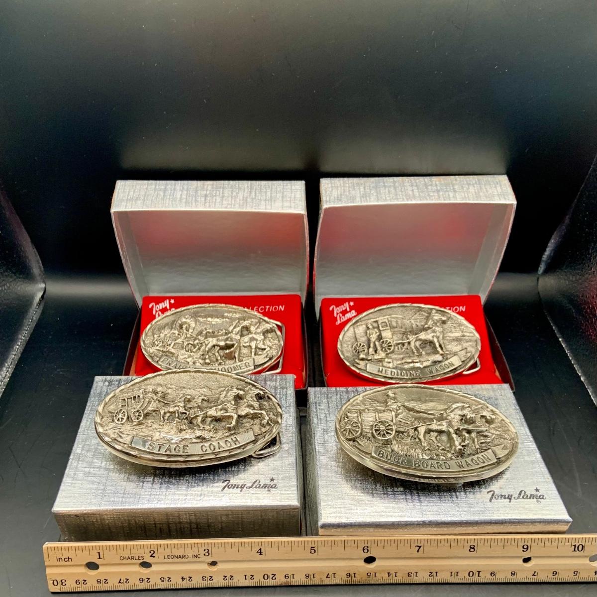 LOT:142:Tony Lama First Edition Limited Series of 4 Brass Belt Buckles - Wagon Wheels- Includes Medicine Wagon, Prairie Schooner, Buck Board Wagon and Stage Coach In Original Boxes