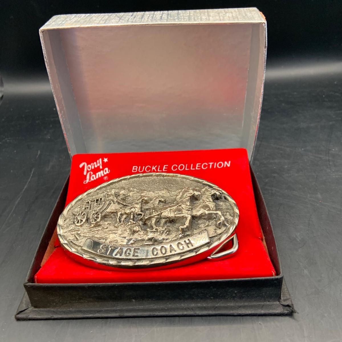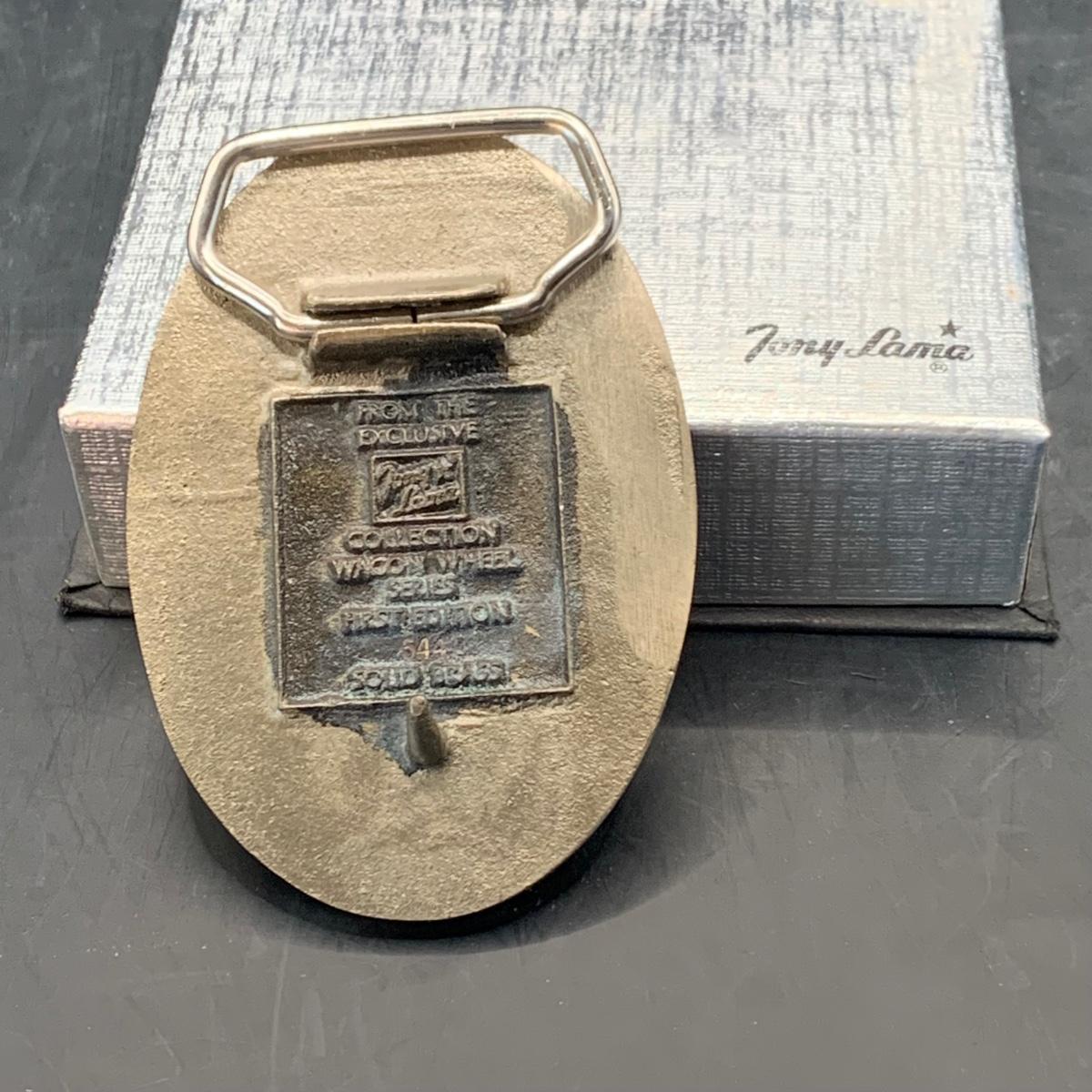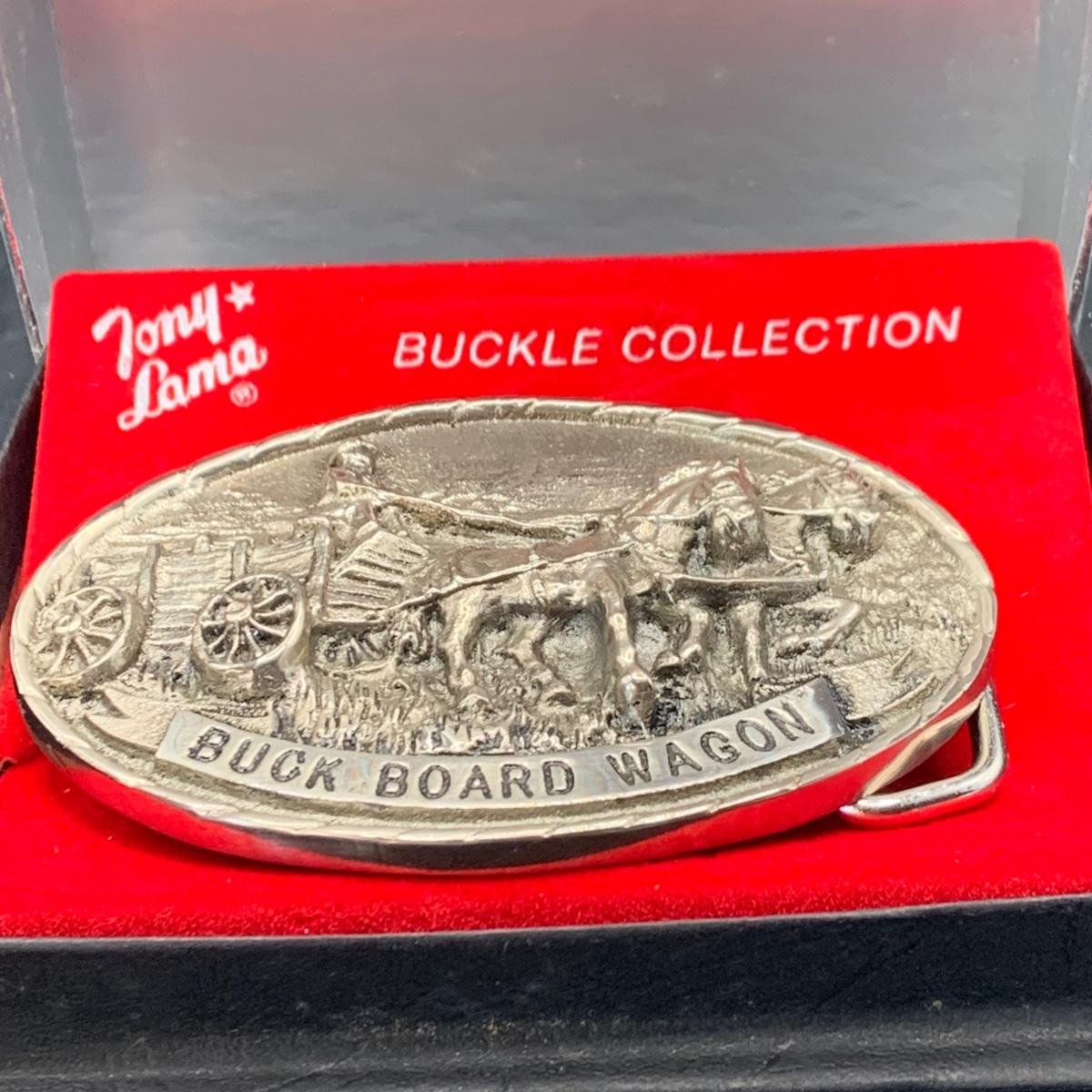 LOT:142:Tony Lama First Edition Limited Series of 4 Brass Belt Buckles - Wagon Wheels- Includes Medicine Wagon, Prairie Schooner, Buck Board Wagon and Stage Coach In Original Boxes