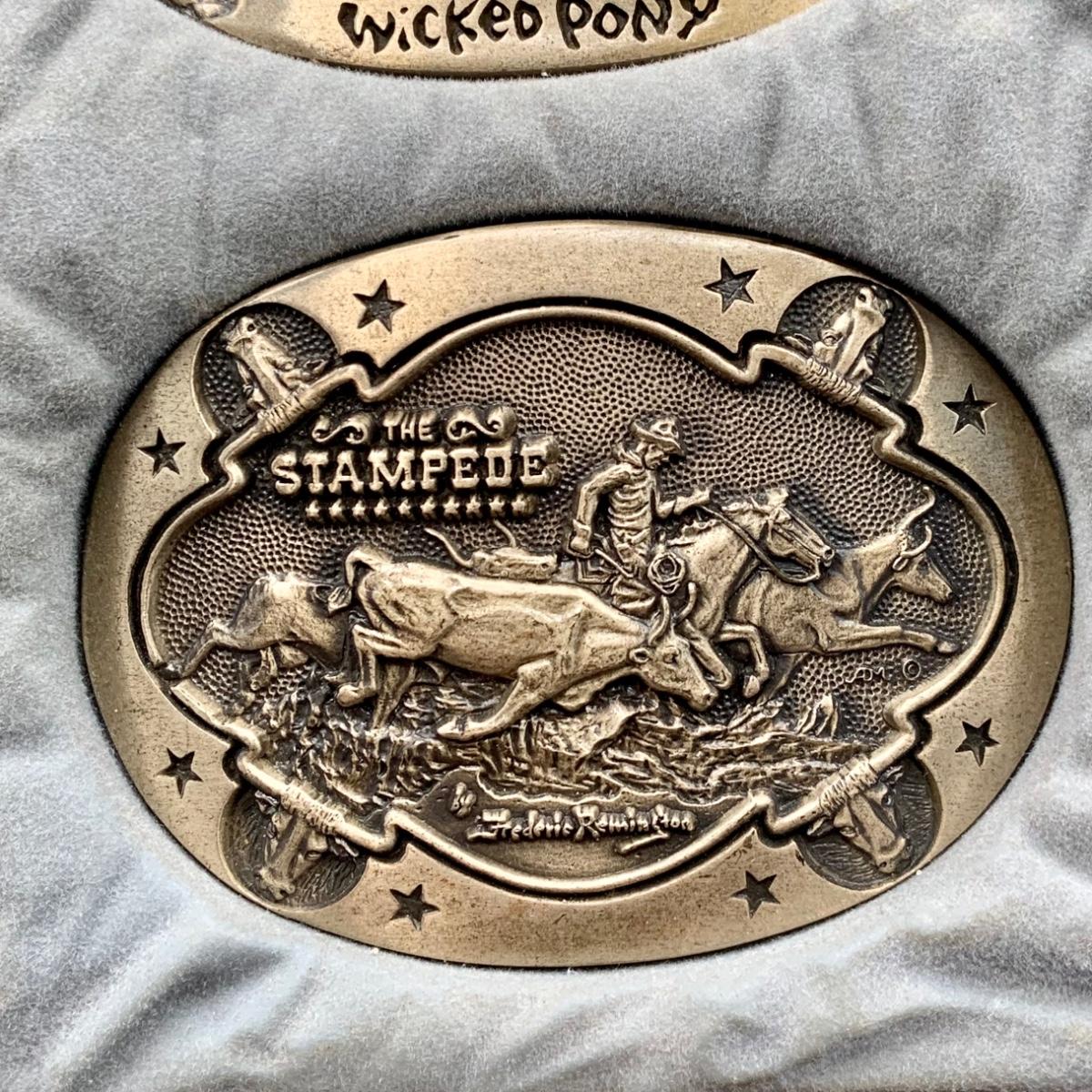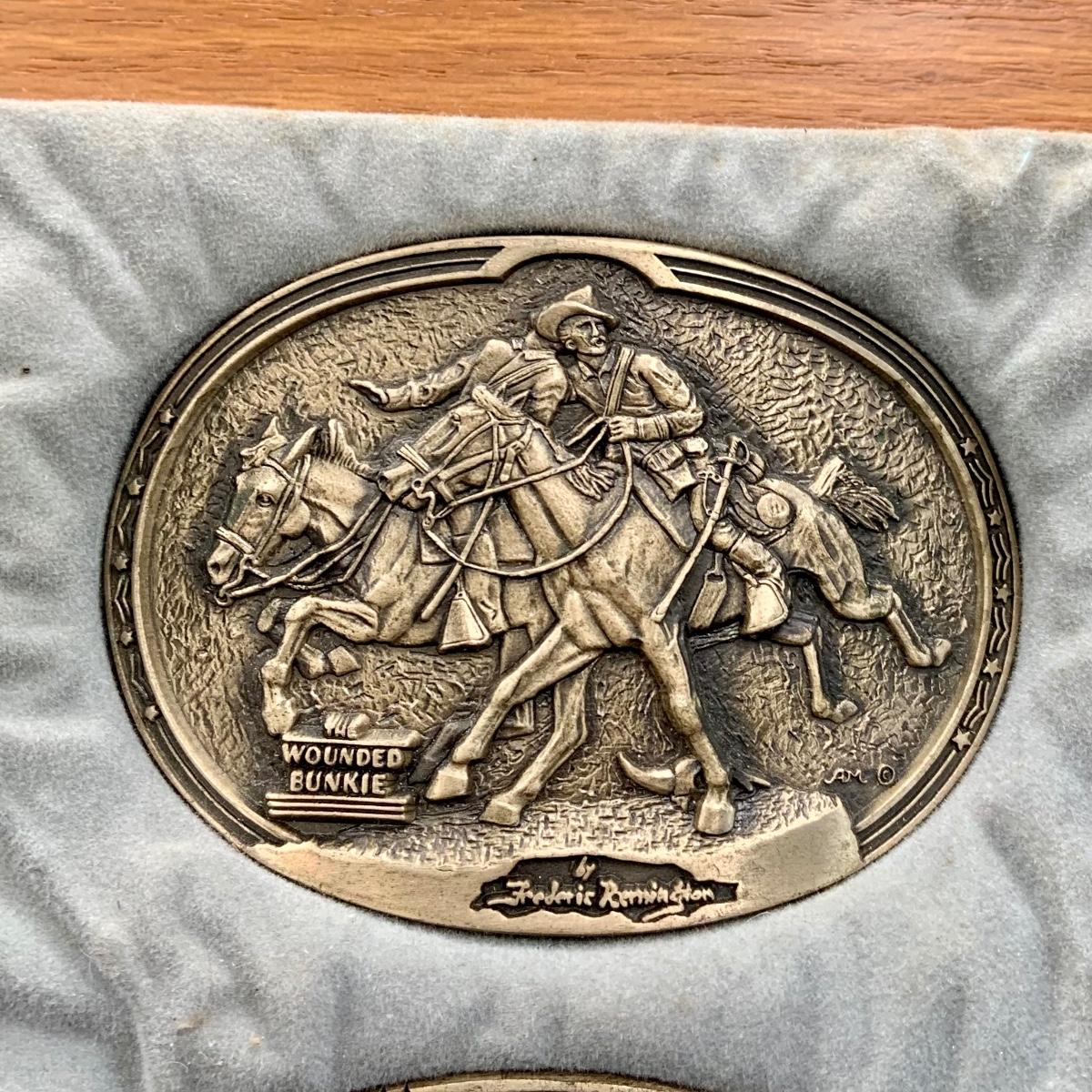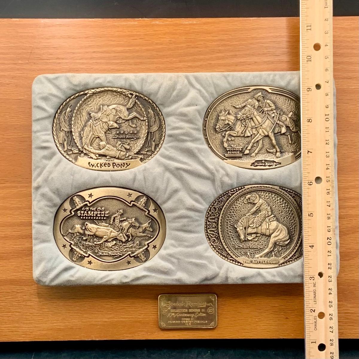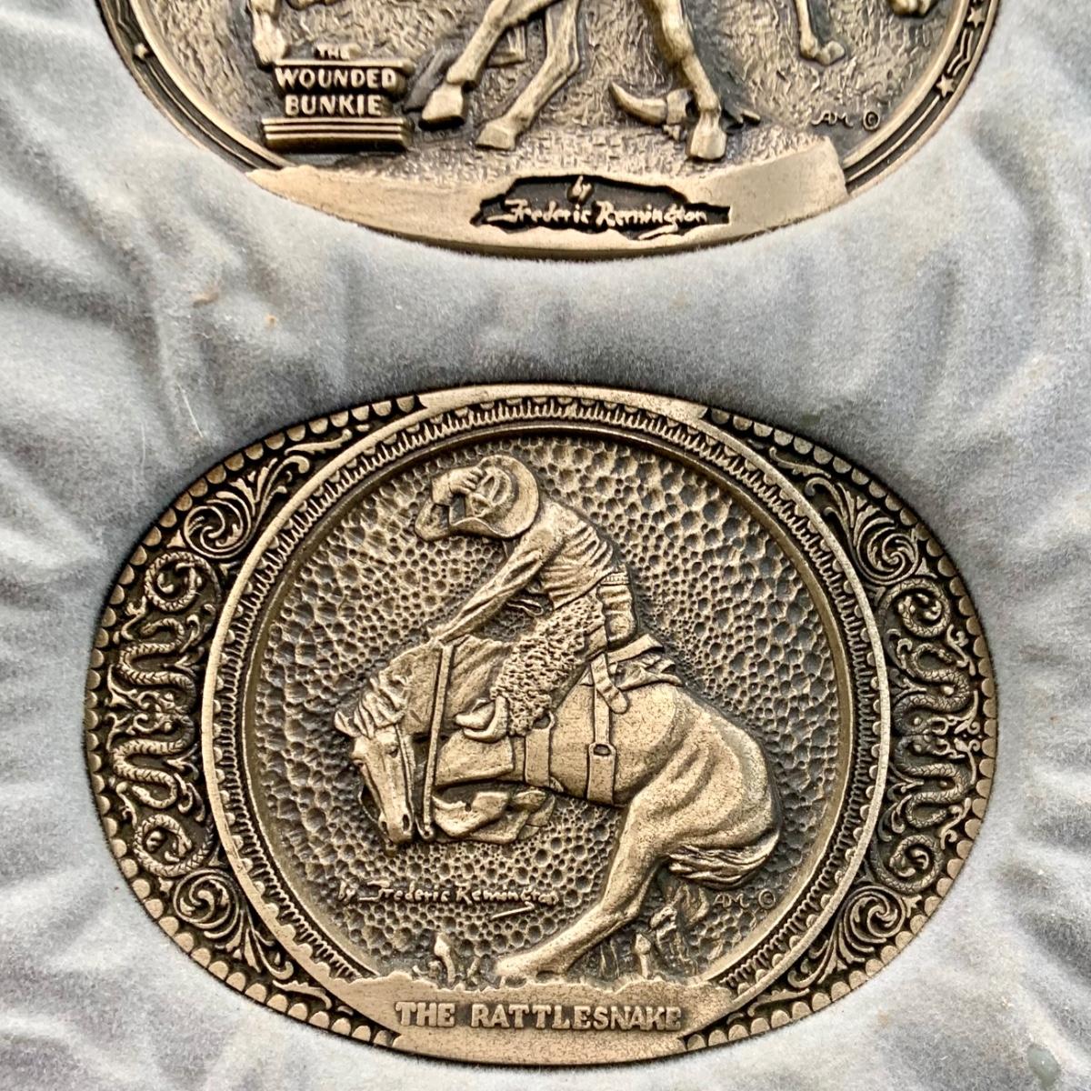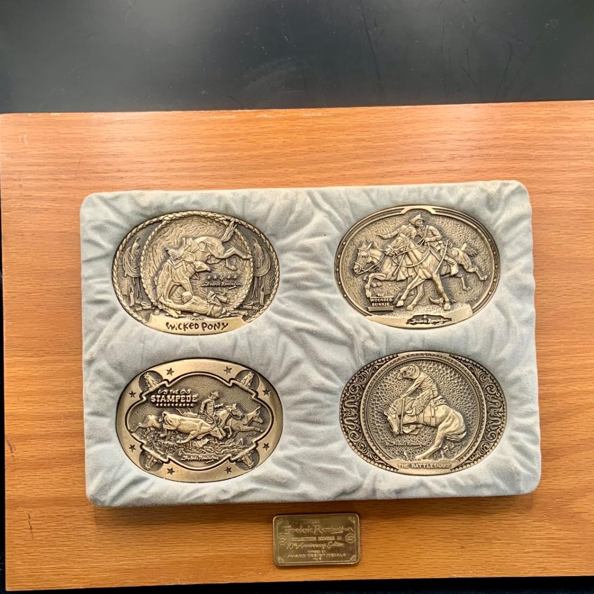 LOT:144:Collection of 4 Mounted Frederic Remington 10th Anniversary Western Belt Buckles - Wicked Pony, Wounded Bunkie, The Stampede and Rattlesnake