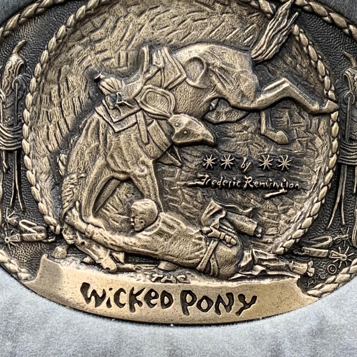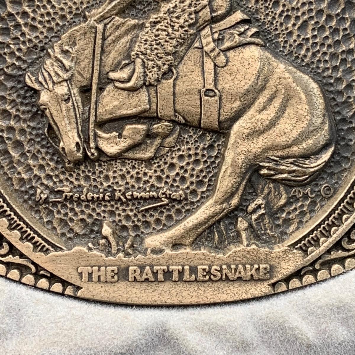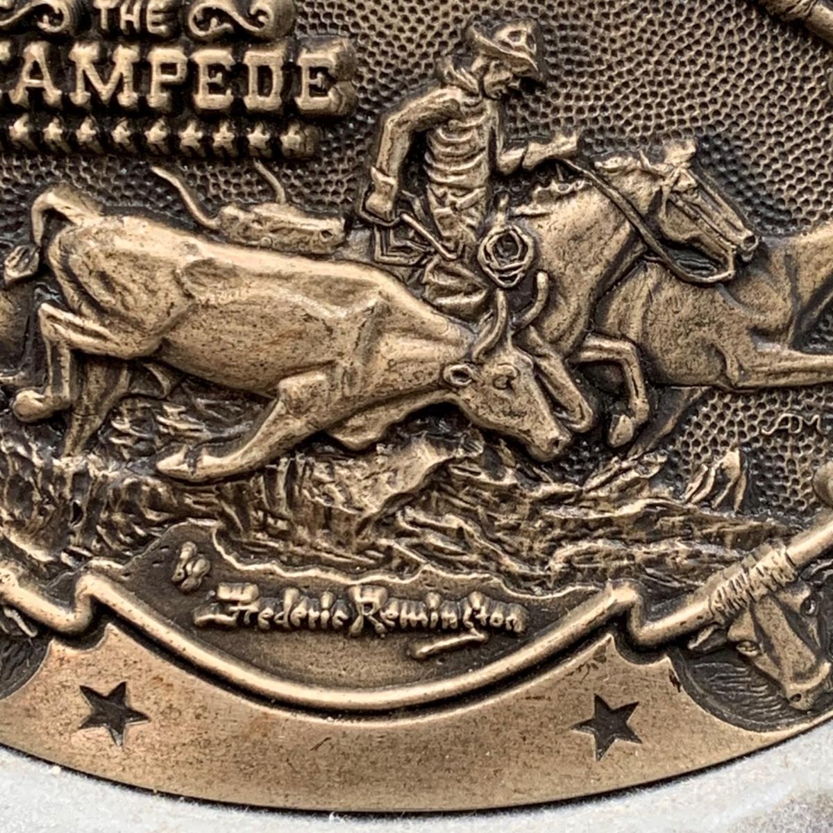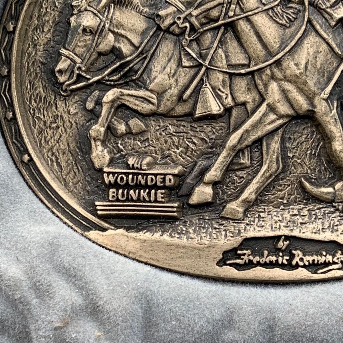 LOT:144:Collection of 4 Mounted Frederic Remington 10th Anniversary Western Belt Buckles - Wicked Pony, Wounded Bunkie, The Stampede and Rattlesnake