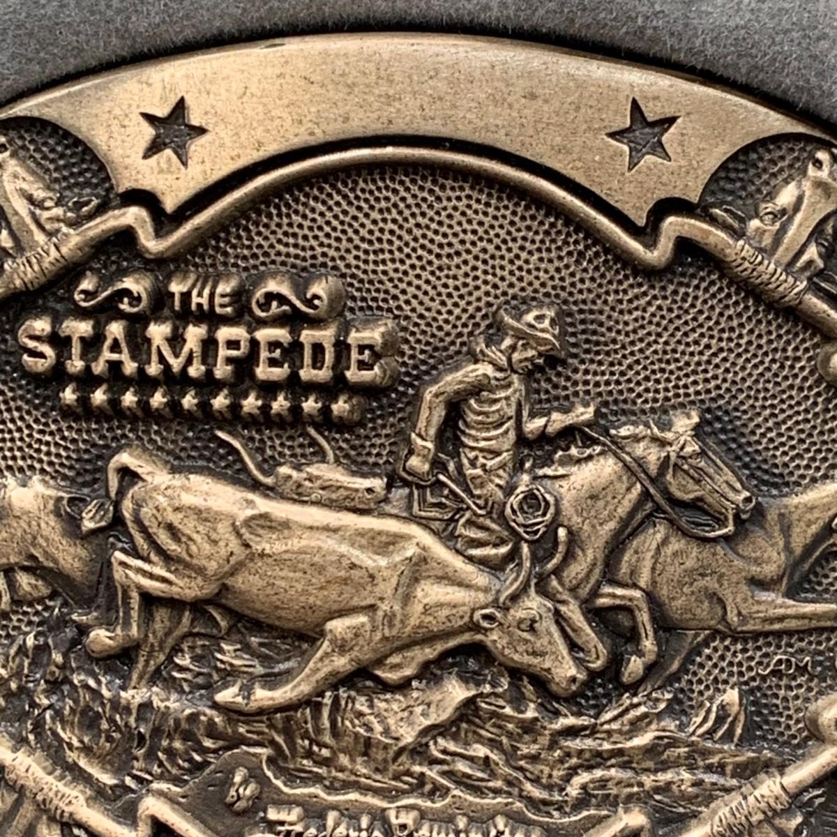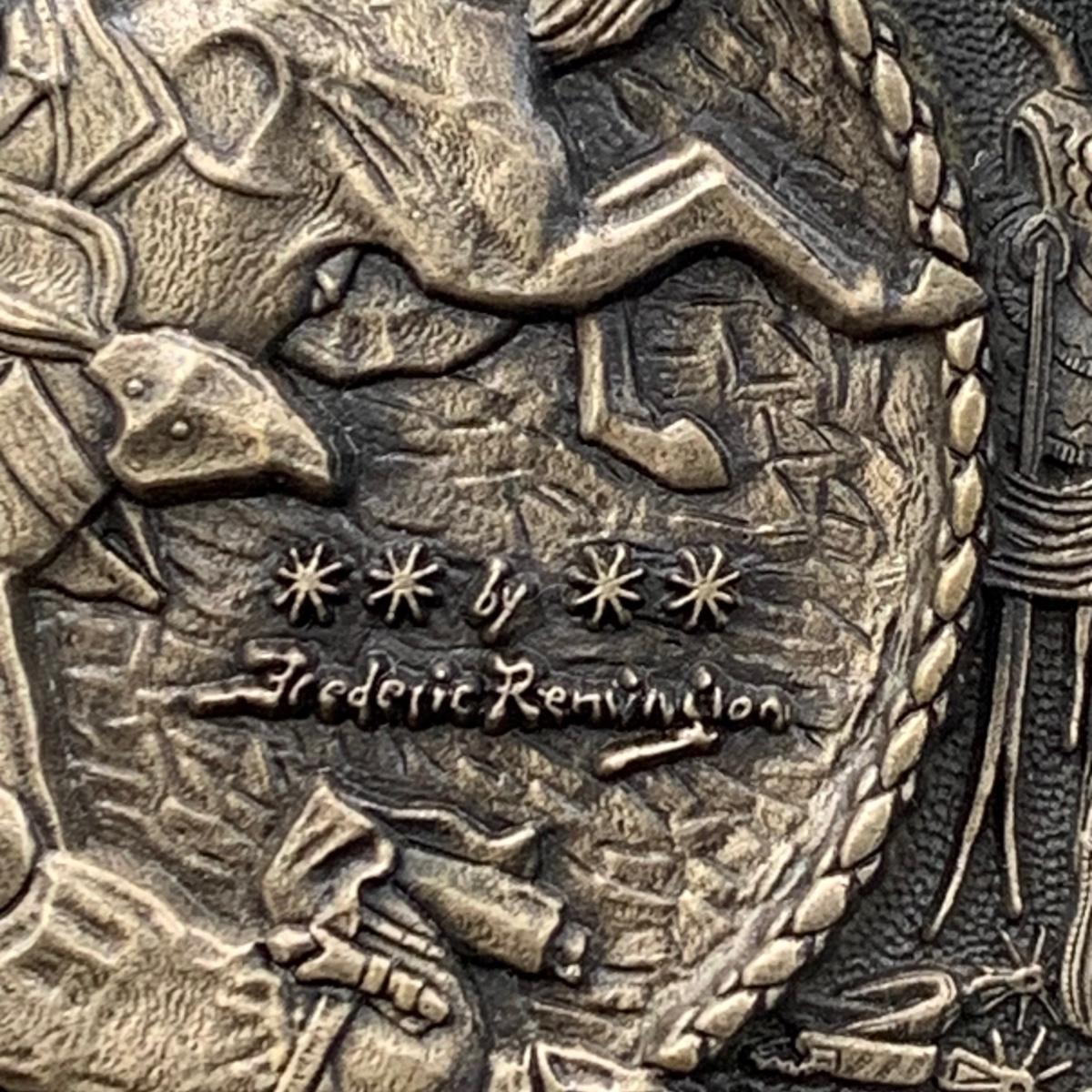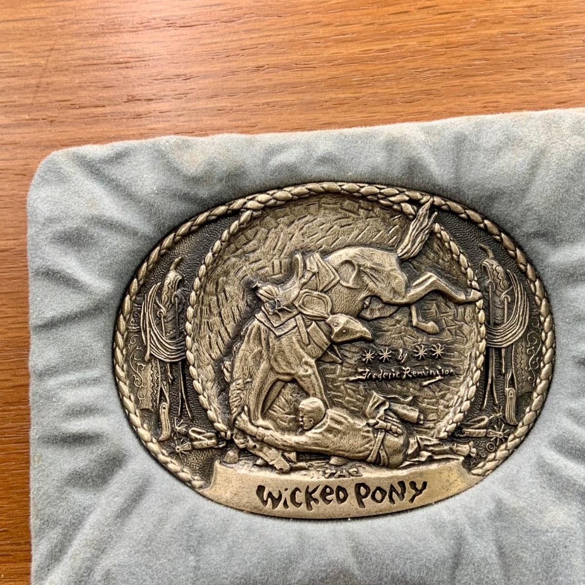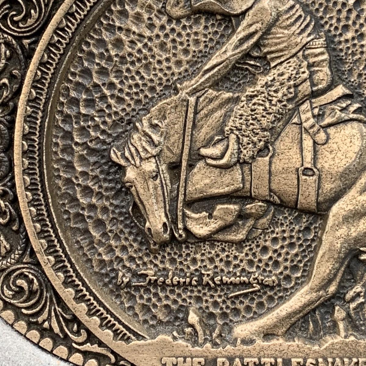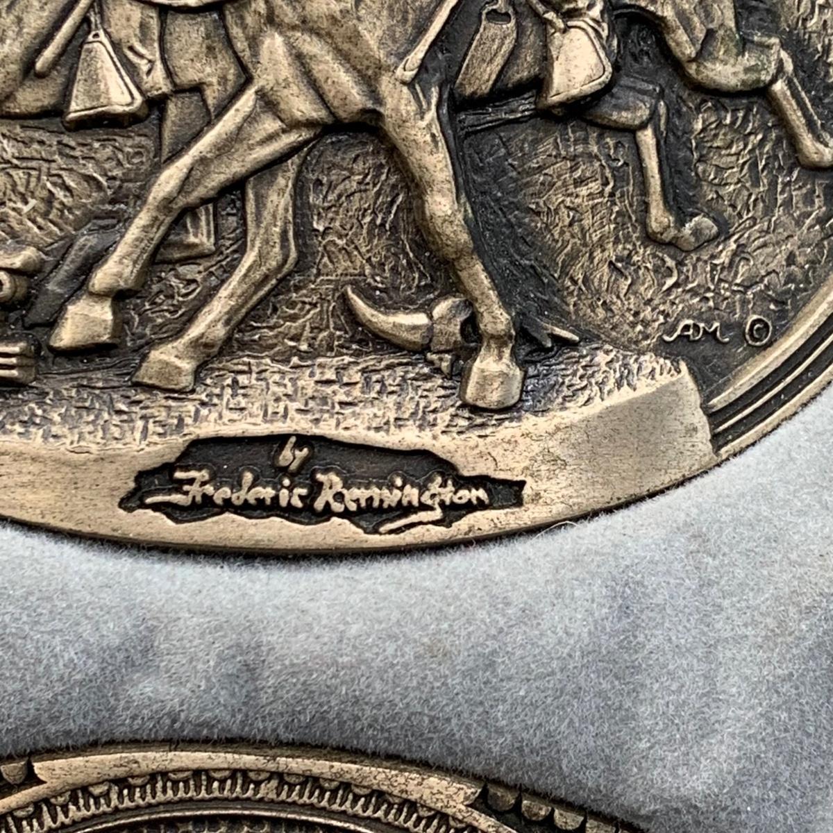 LOT:144:Collection of 4 Mounted Frederic Remington 10th Anniversary Western Belt Buckles - Wicked Pony, Wounded Bunkie, The Stampede and Rattlesnake