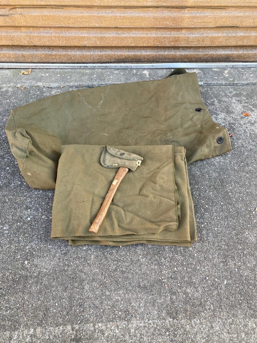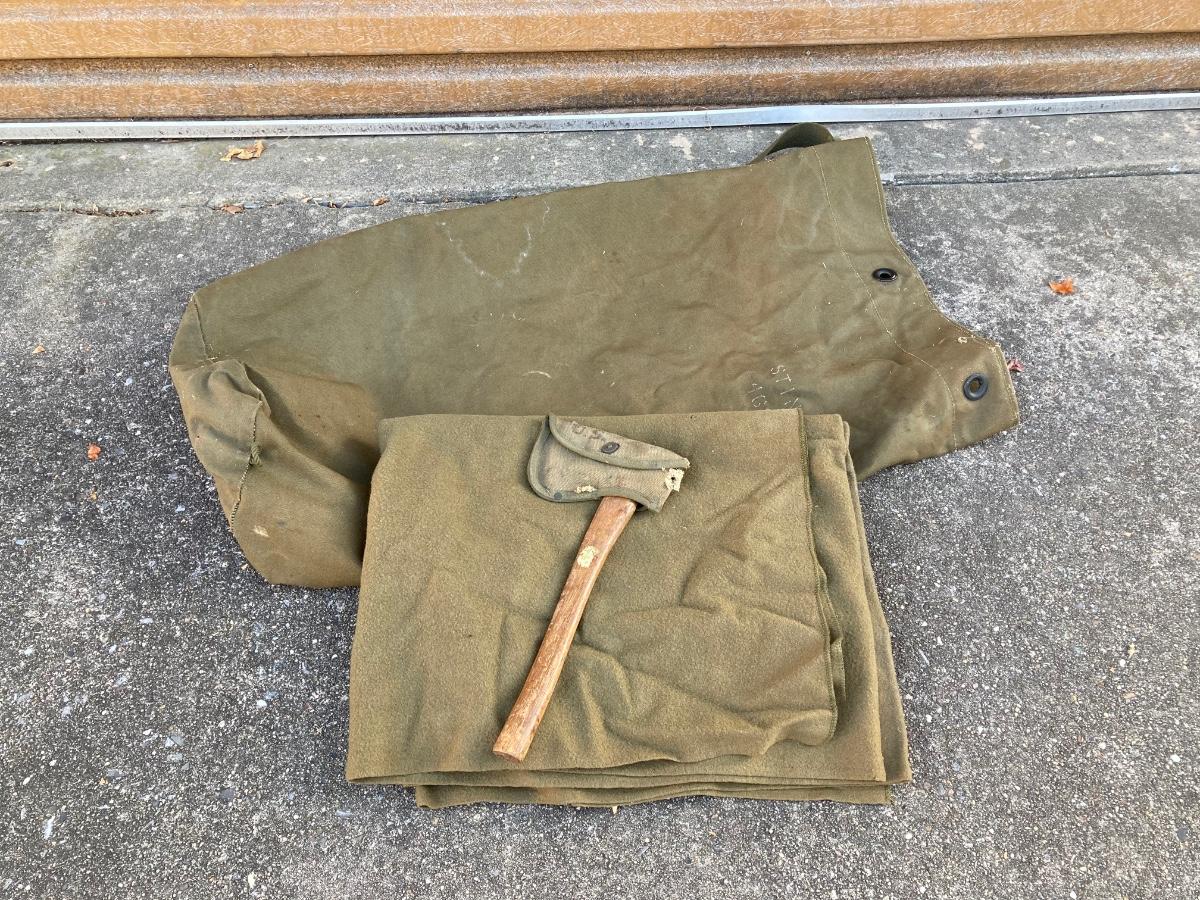 LOT 168: Military Collection - Olive Duffle Bag, Axe and Blanket