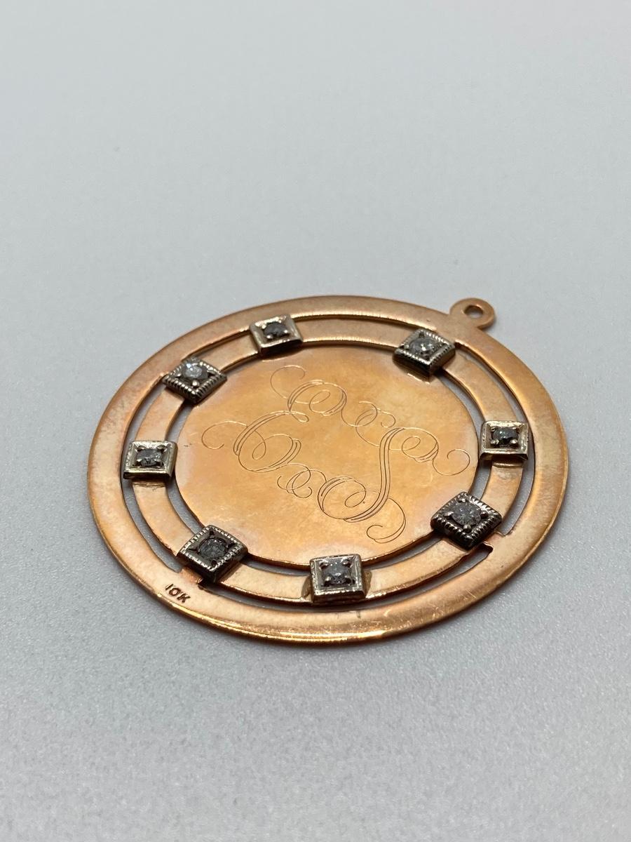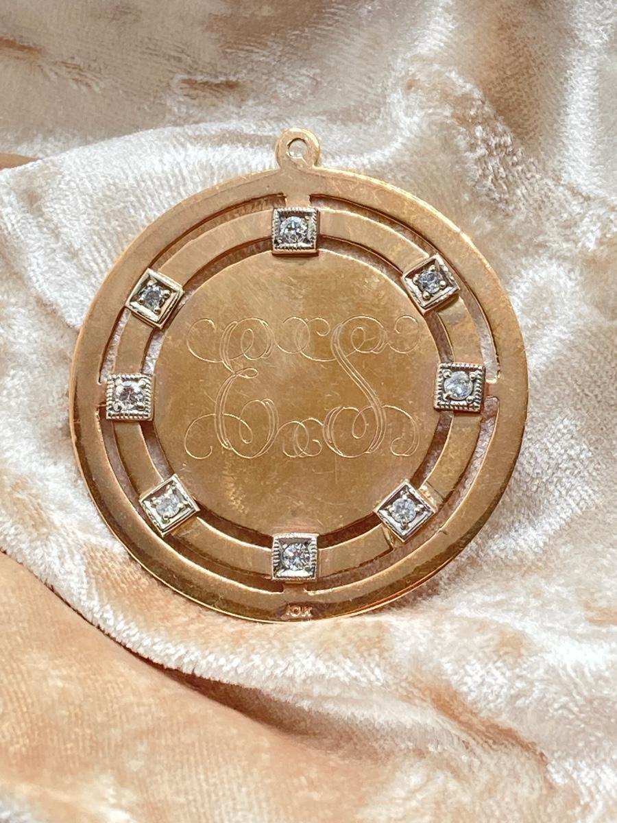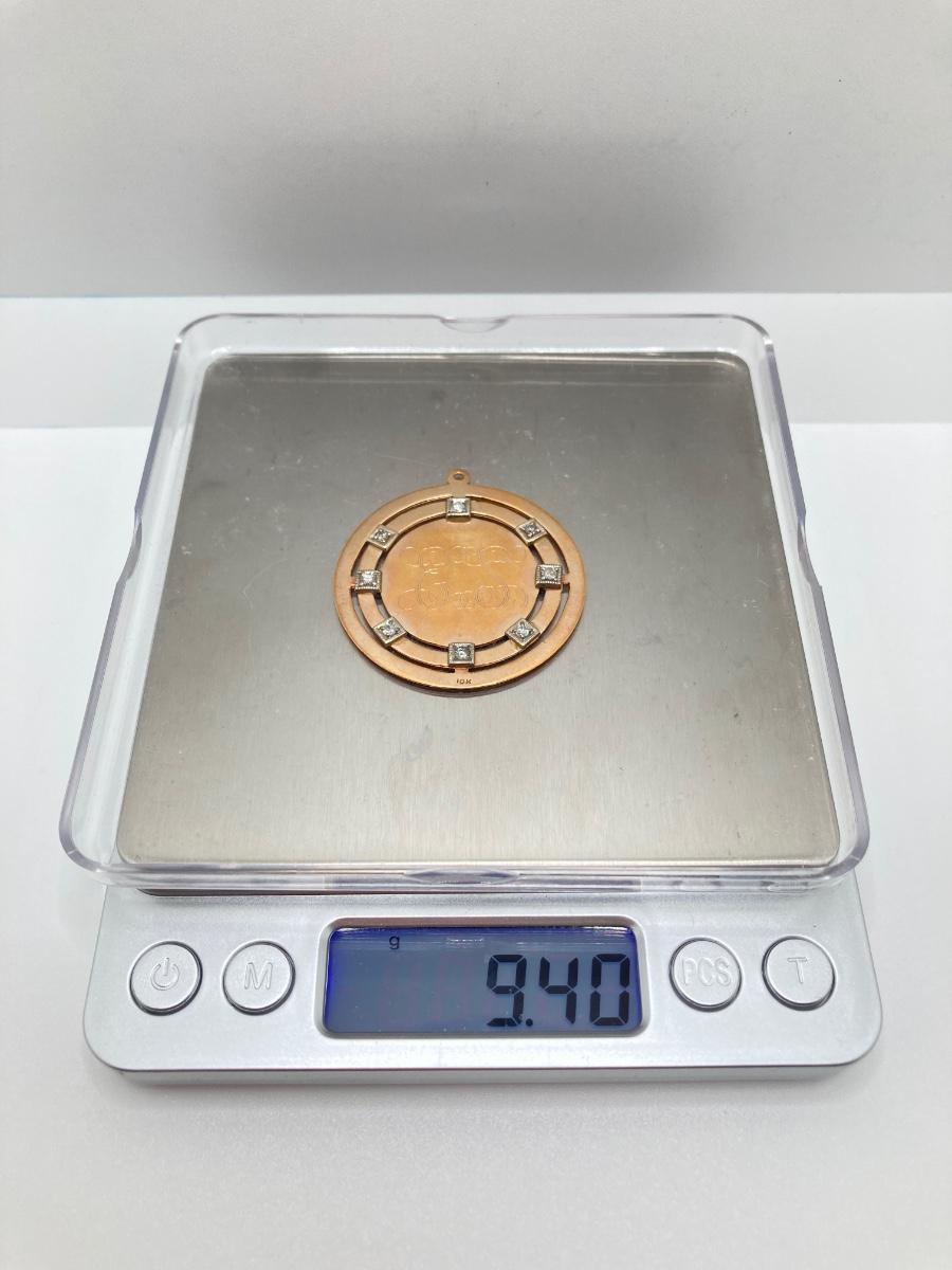 LOT 173: Gold Personalized Humanity Pendant with Clear Stones - 10KT, TW 9.40g