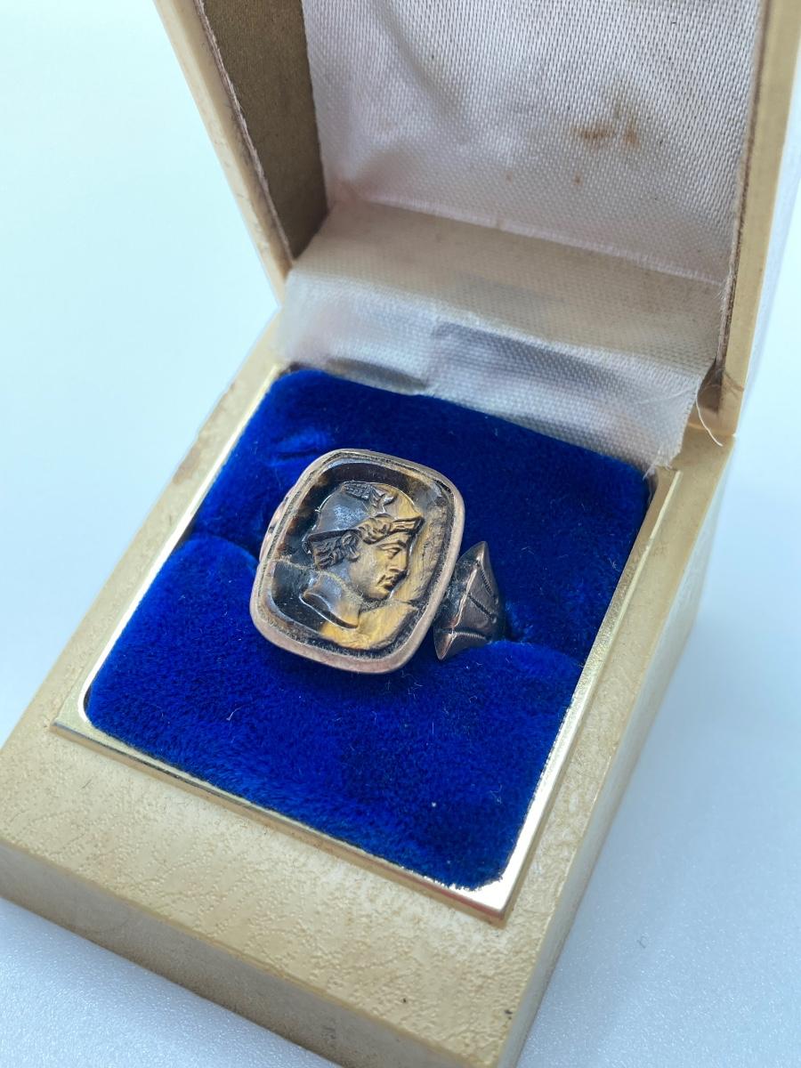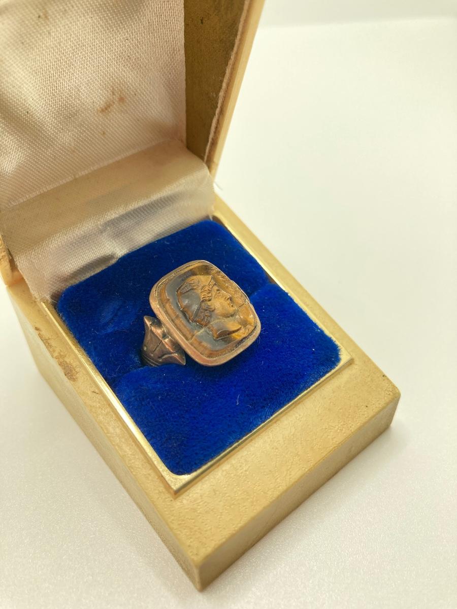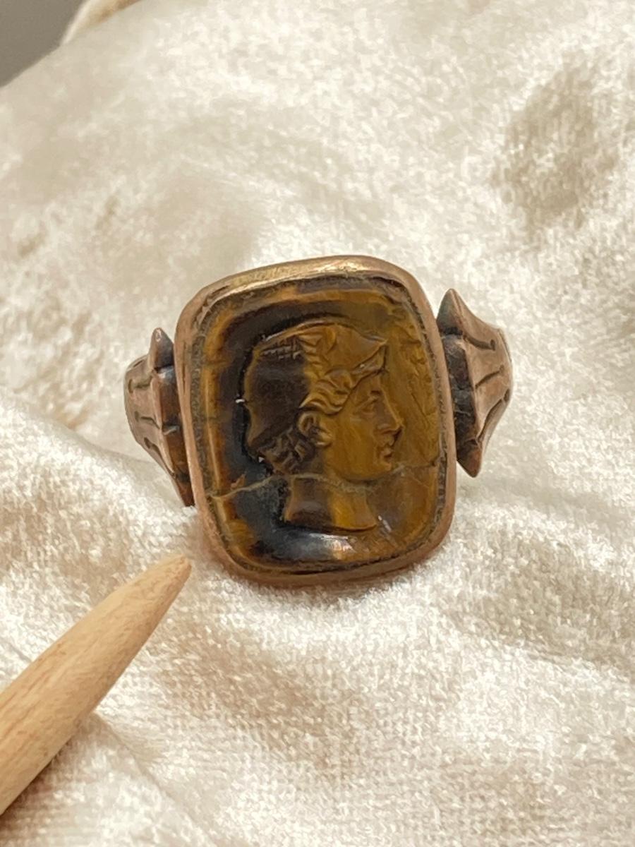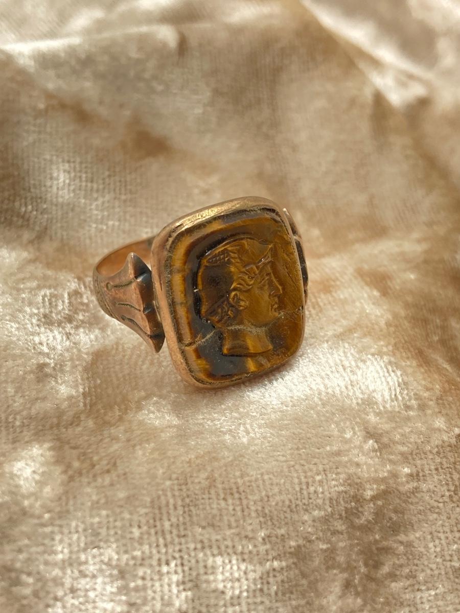 LOT 182: Vintage Tiger's Eye Intaglio Ring Hermes Relief - 10KT, TW 4.30g, Sz 9.75