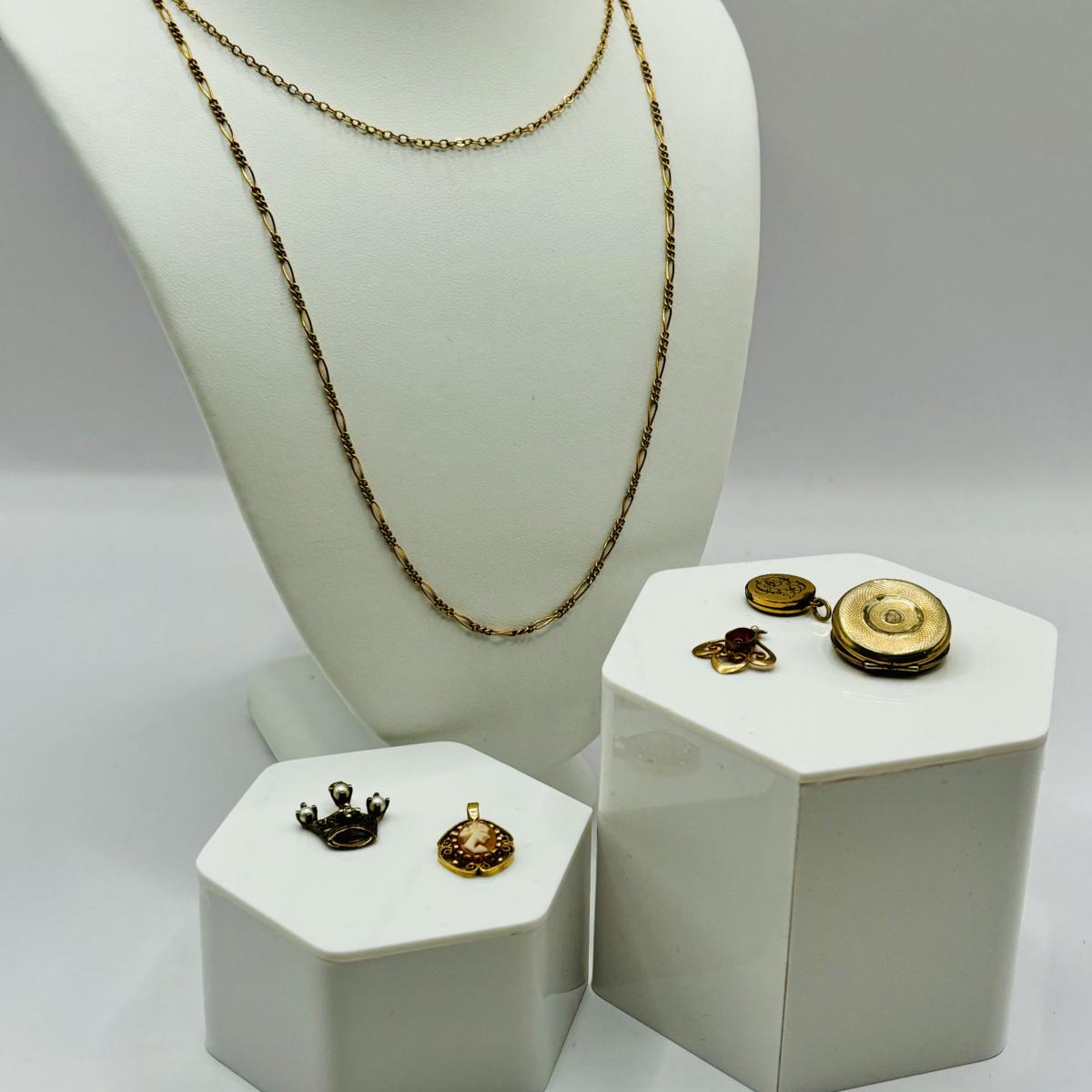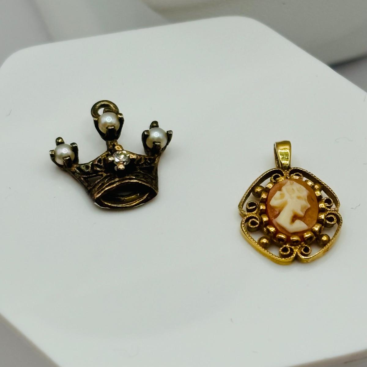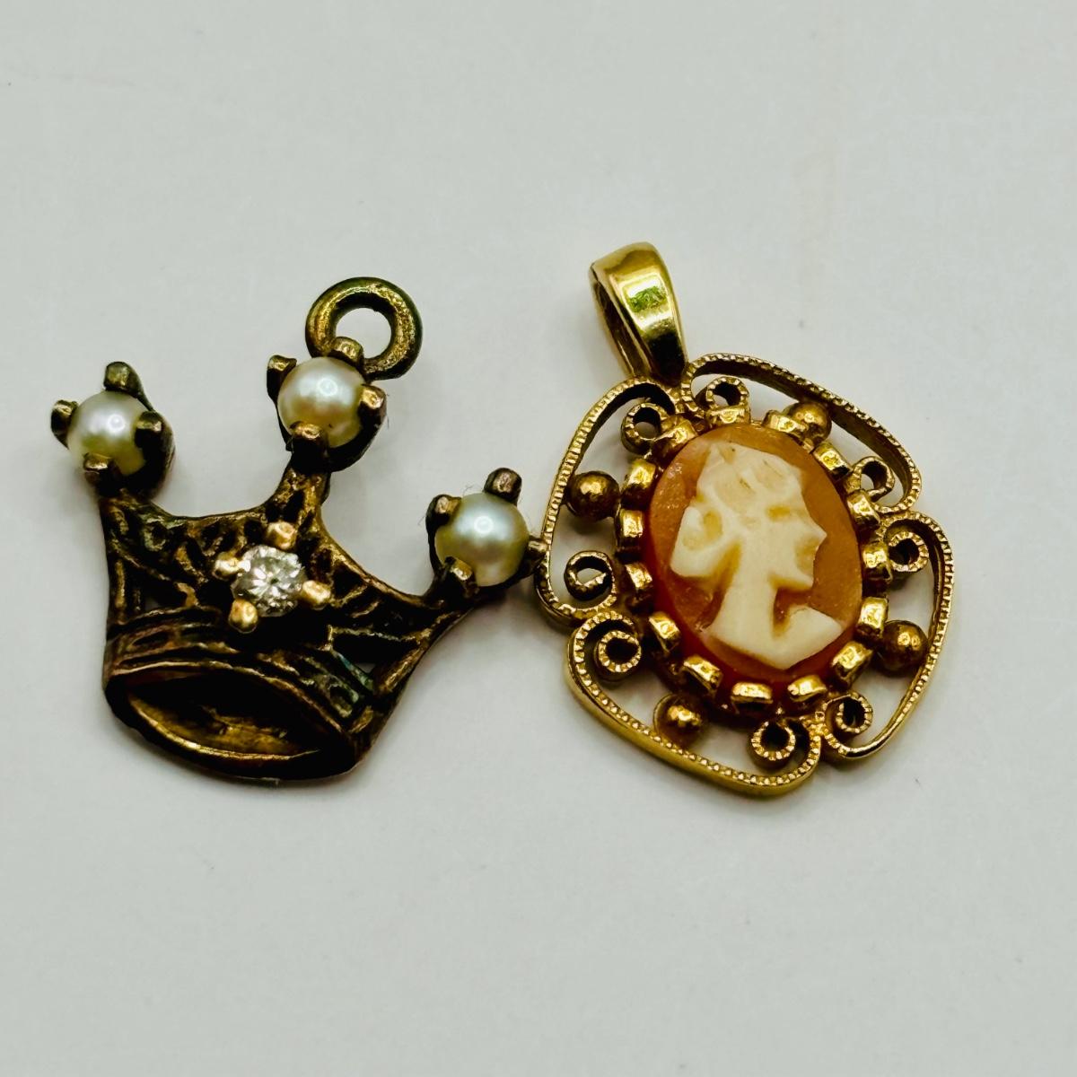 LOT 211: Gold Fill 1/20 14K Double Chain Necklace, Cameo Pendant/Charm 14k, Crown w/Seed Pearls 10k, & Gold Tone Charms