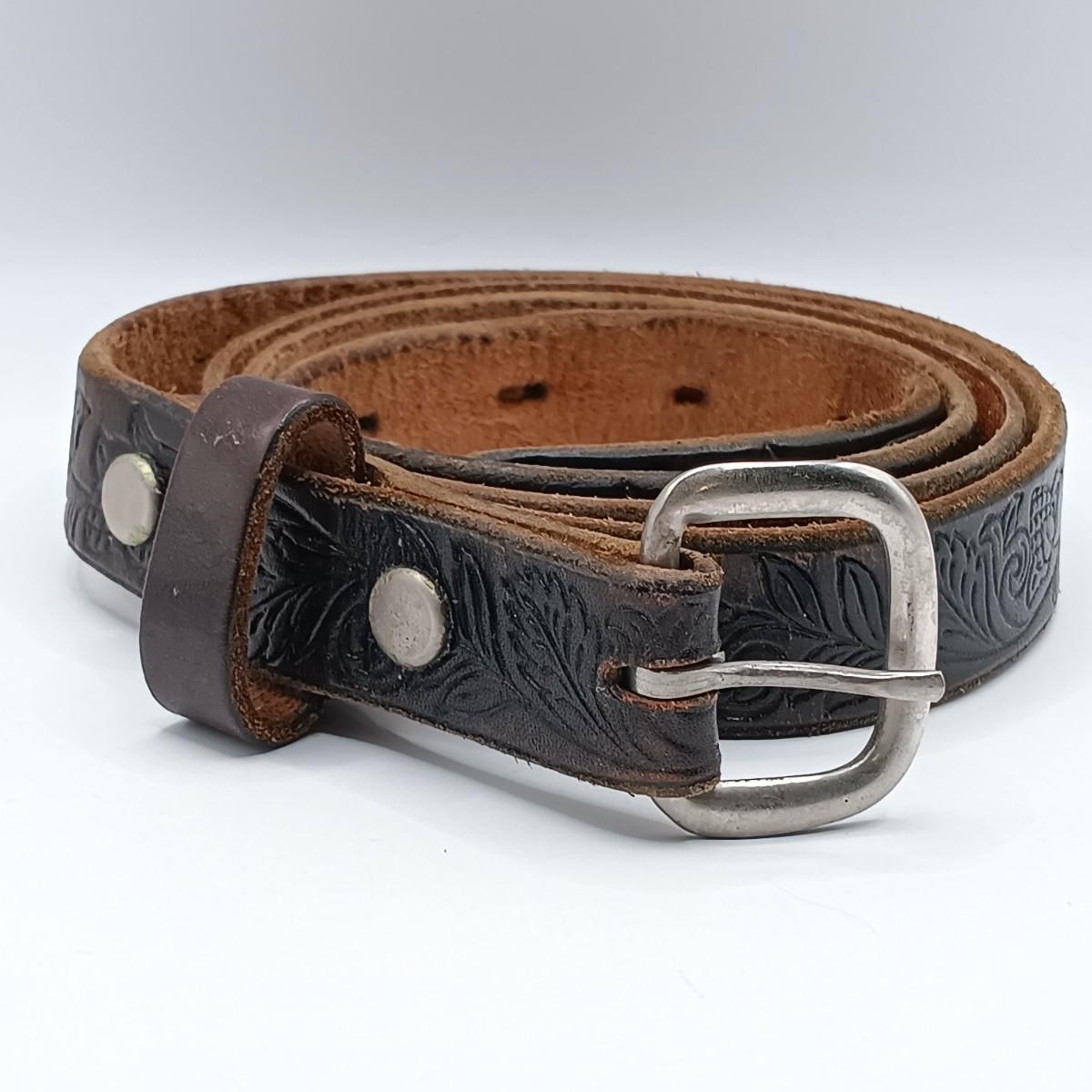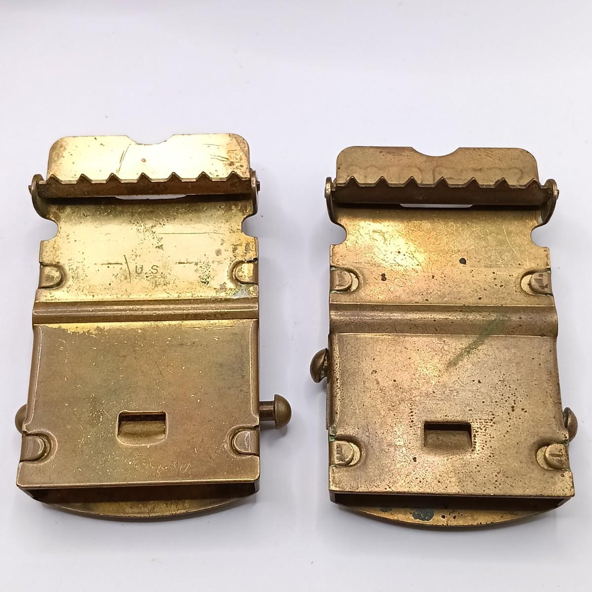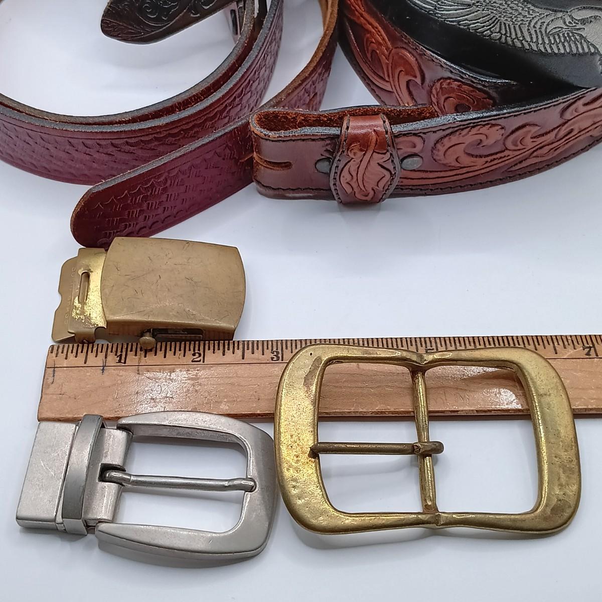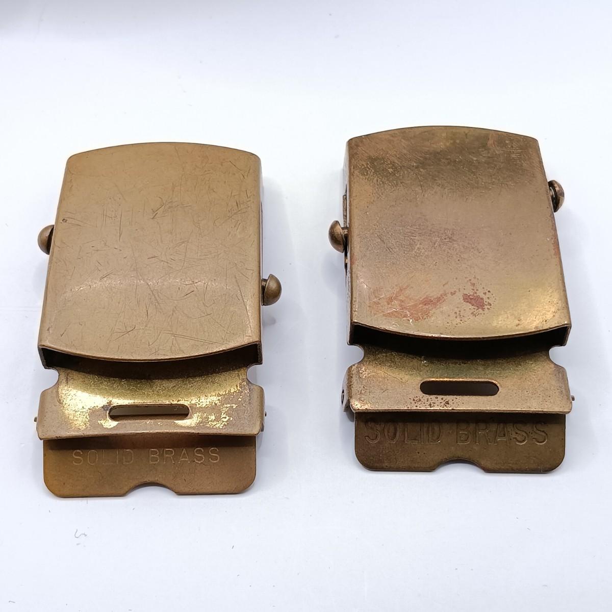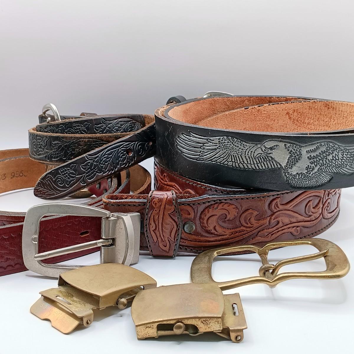 LOT 223: Pair of Solid Brass Military Buckles, Brass Classic Belt Buckle and 4 Vintage Leather Belts