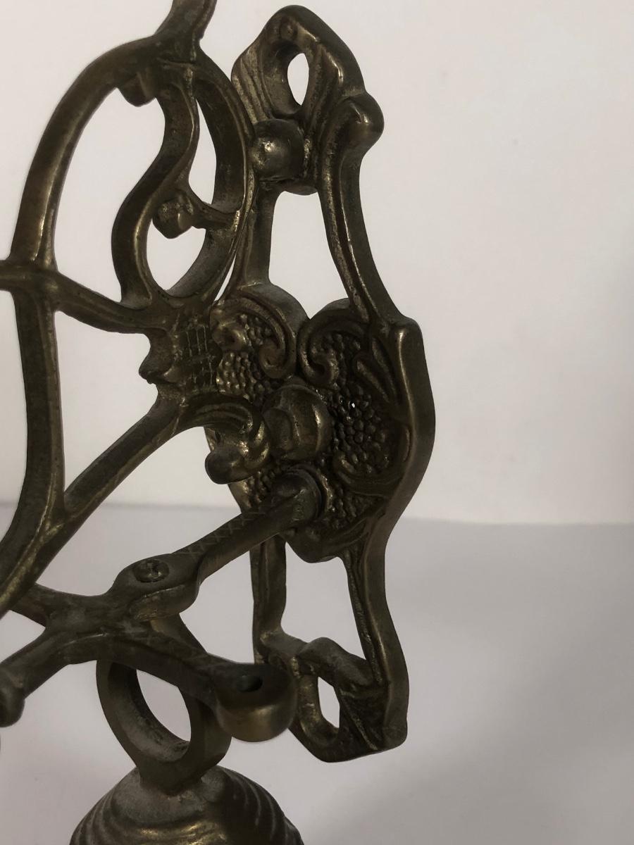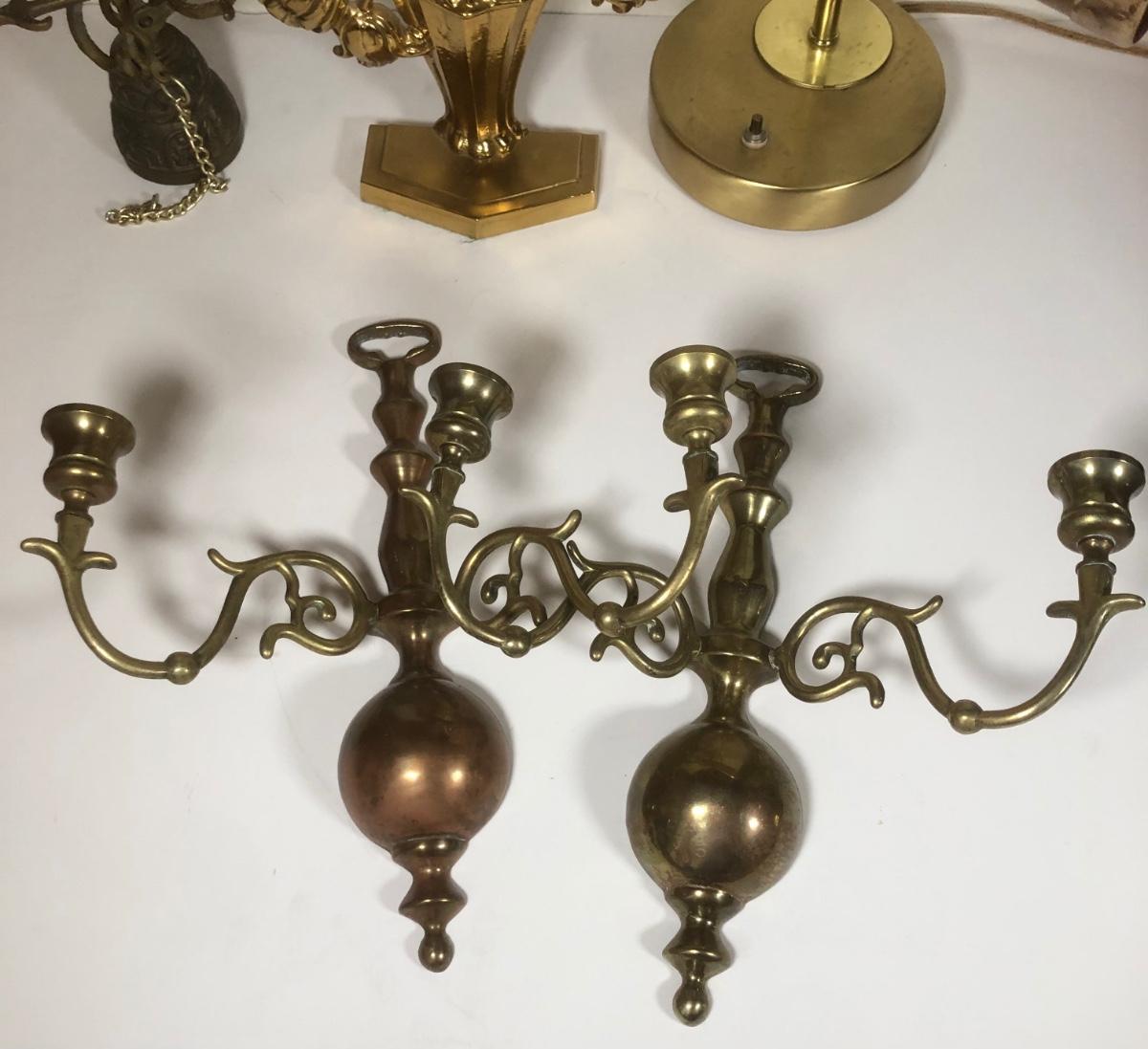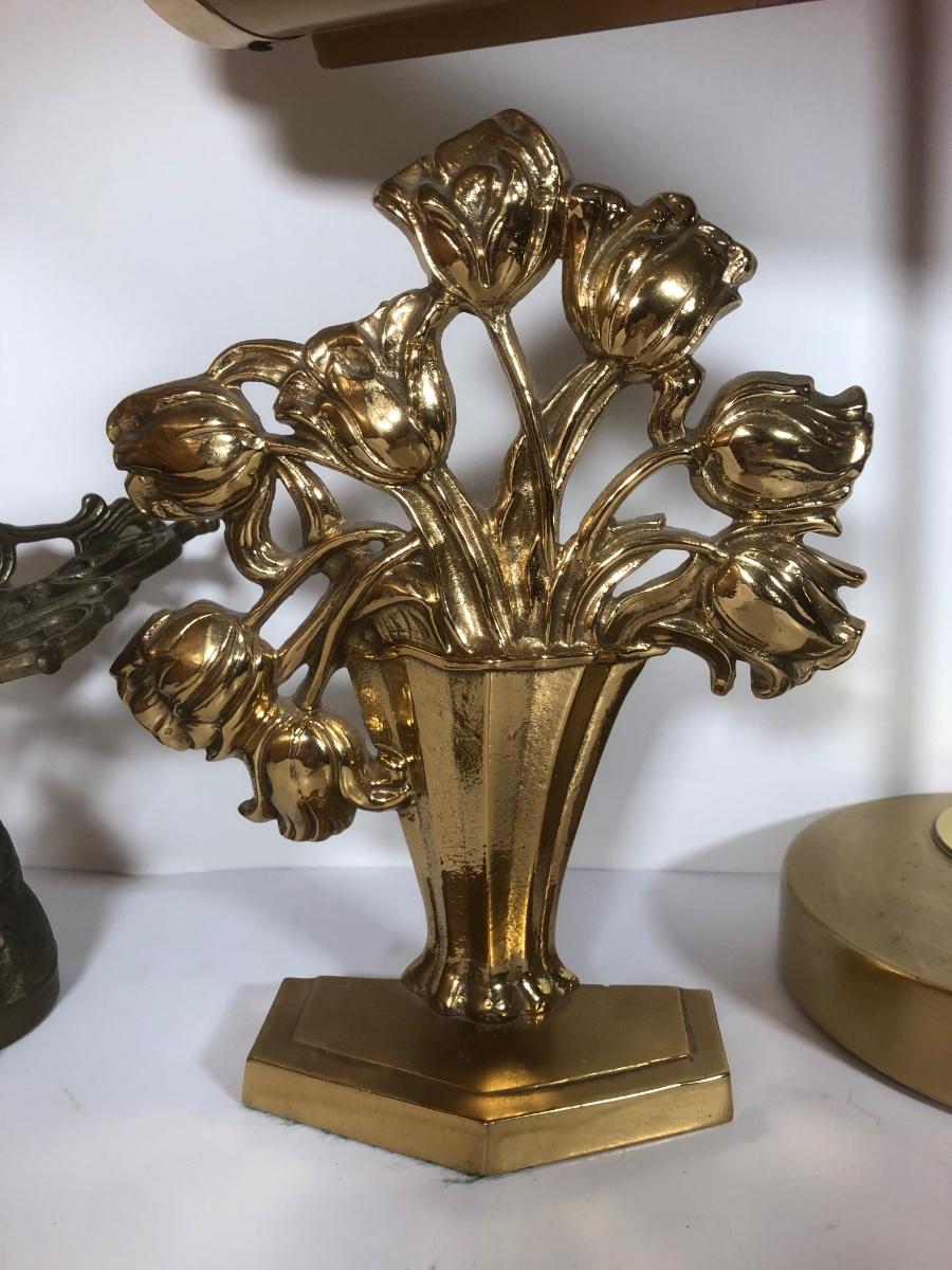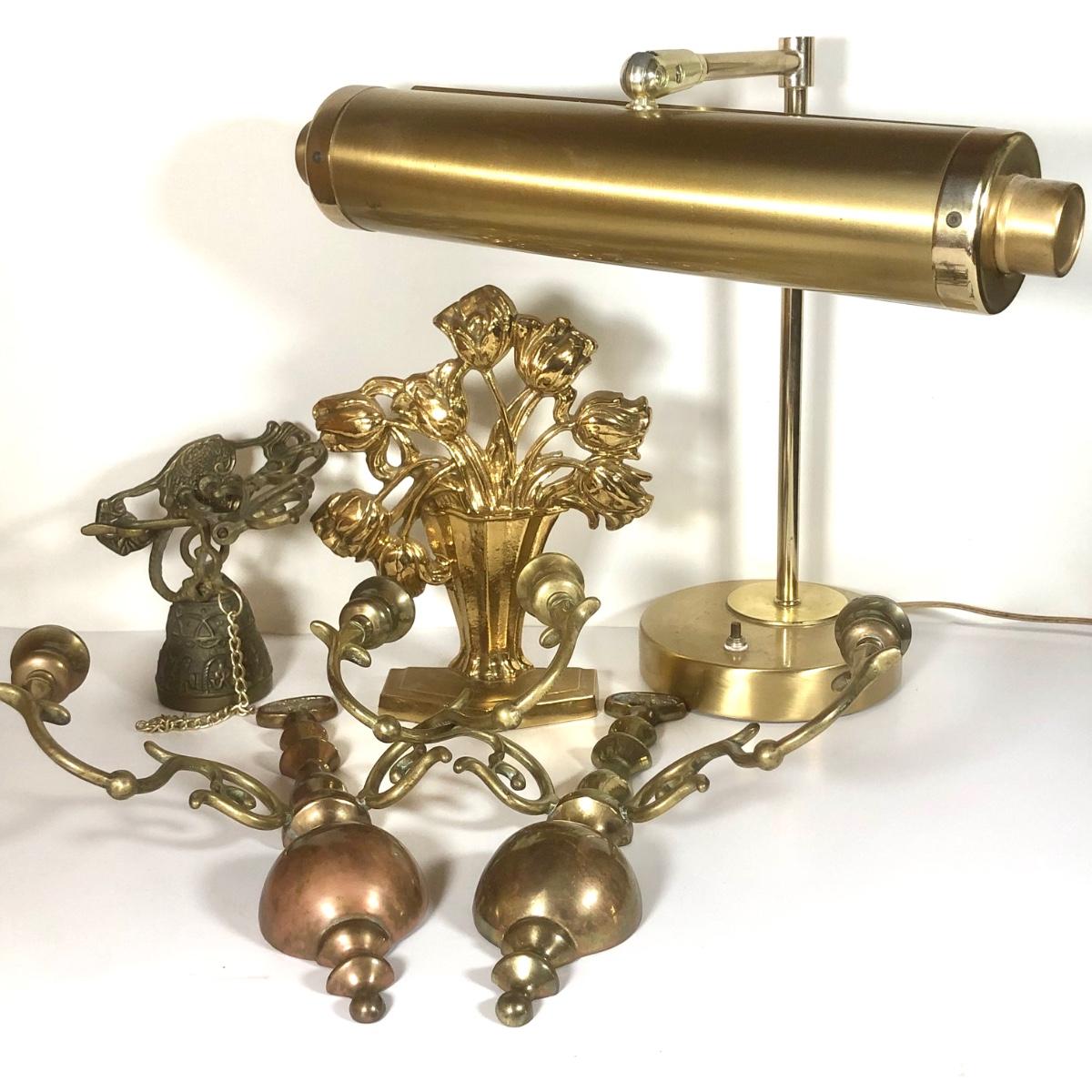 LOT 2D: Vintage Brass Desk Lamp, Vintage/Antique Wall Mounted Metal Bell, Brass Wall Candle Holders & Floral Bookend