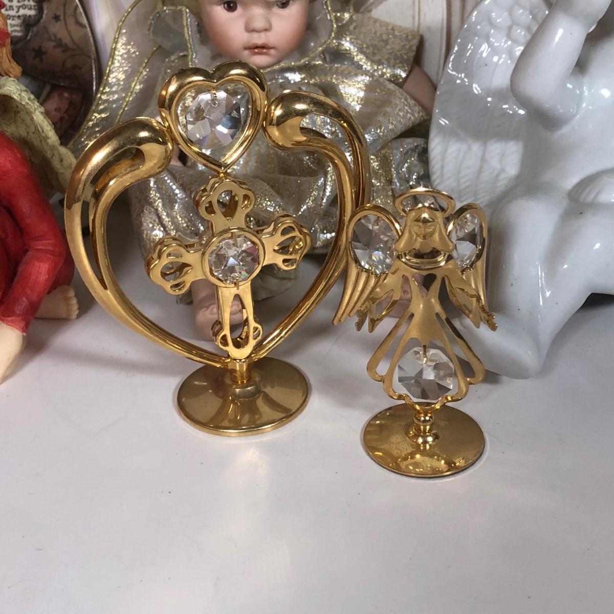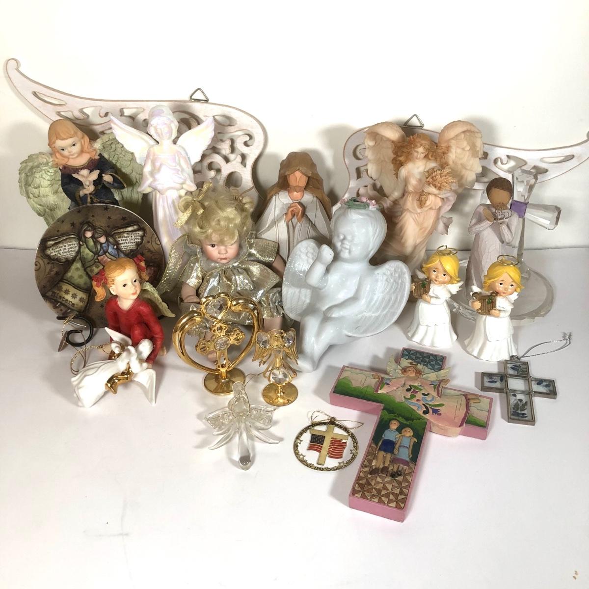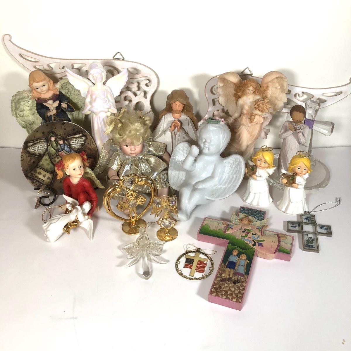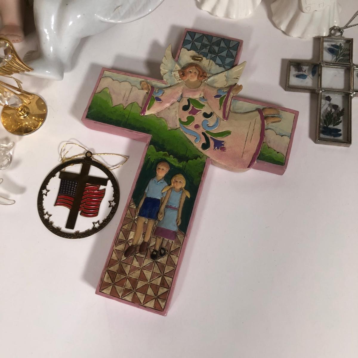 LOT 3D: Collection of Angels & Religious Decor - 2006 Jim Shore Heartwood Creek Cross (4007045), Mascot USA Austrian Crystal 24k Gold Plated Decor, 2014 Willow Tree "Lots of Love" Figurine & More
