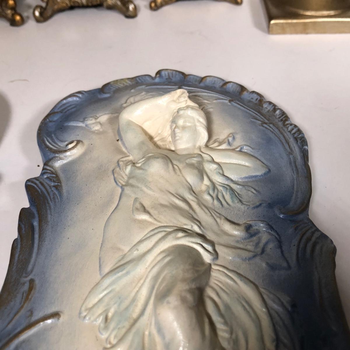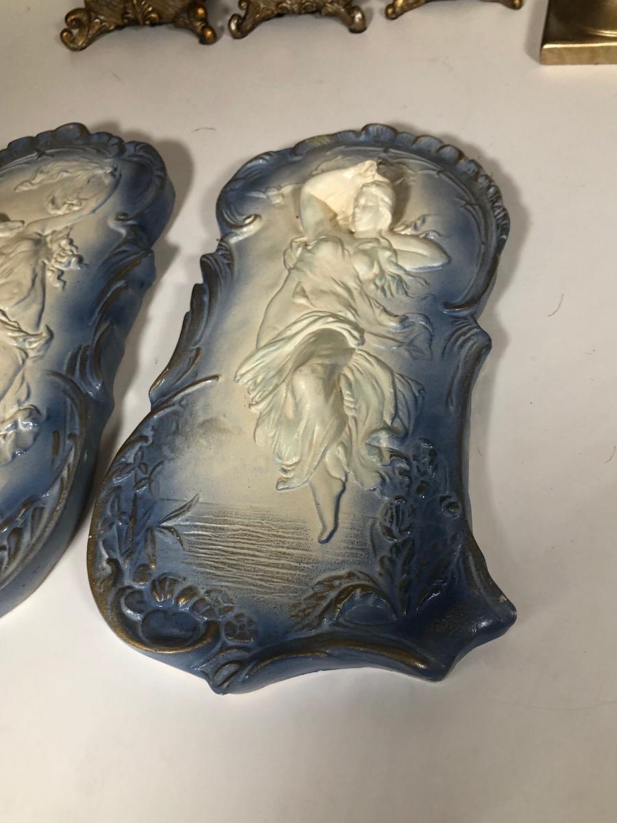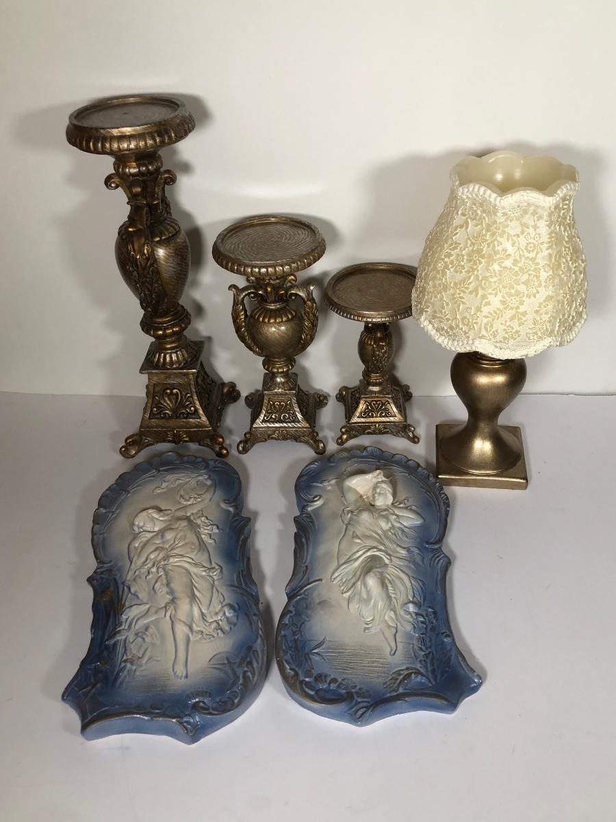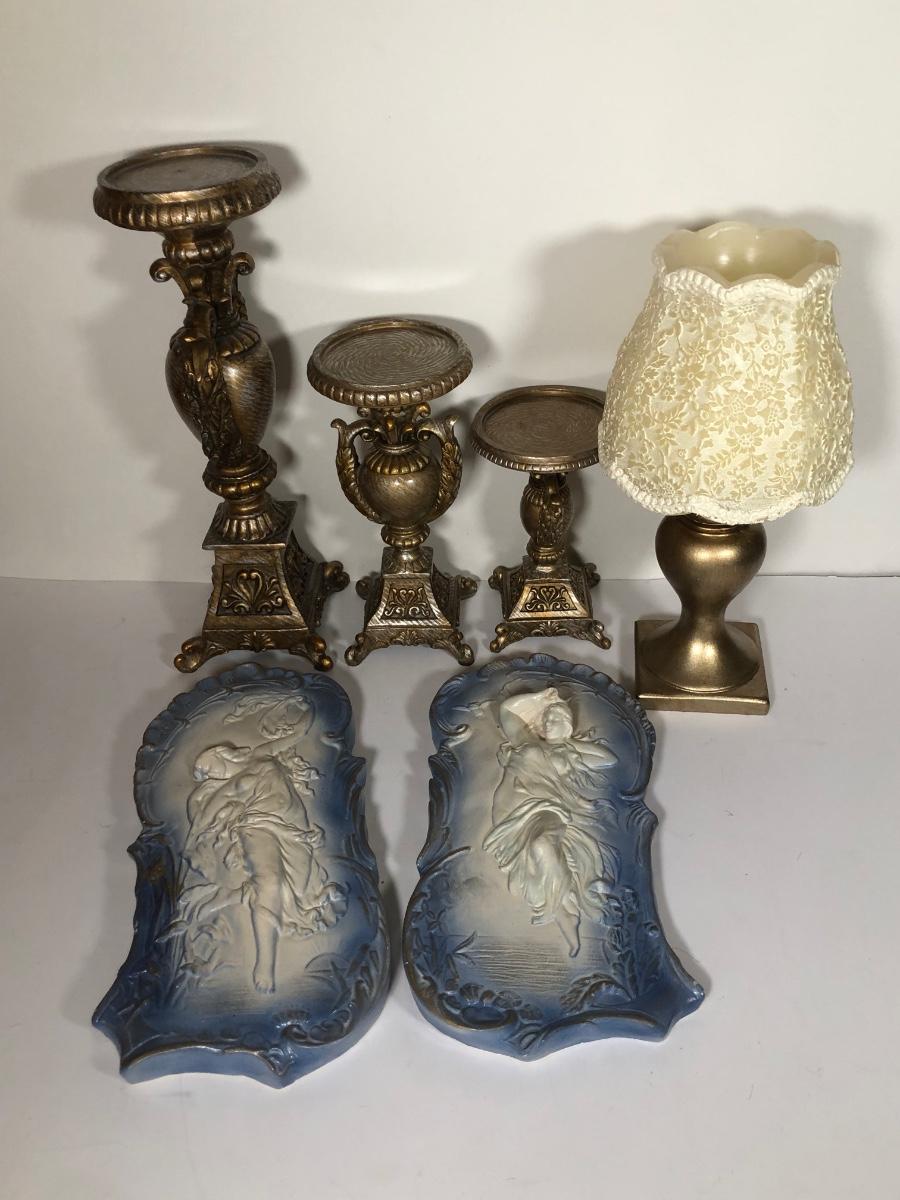 LOT 13D: Vintage Sculpted Chalkware Wall Plaques & Grecian Style Gold Color Candle Holders