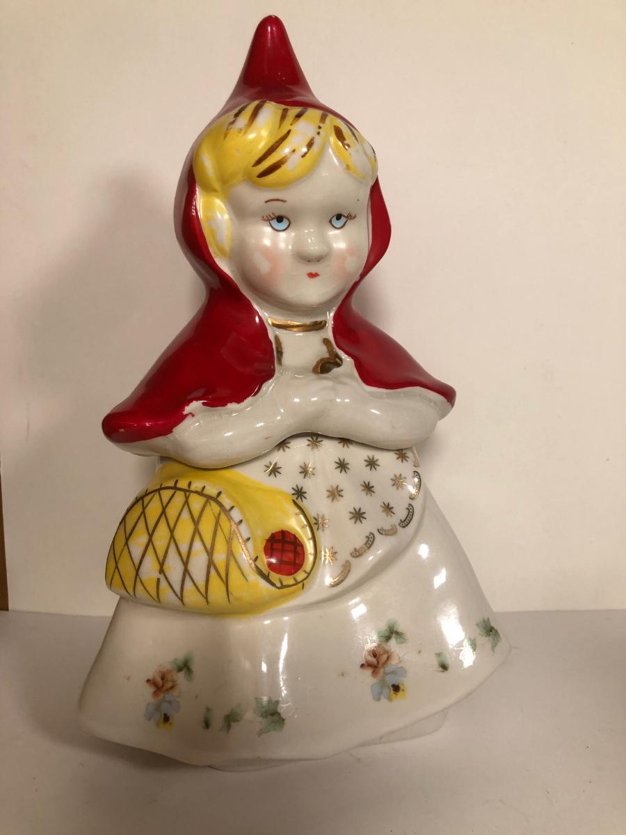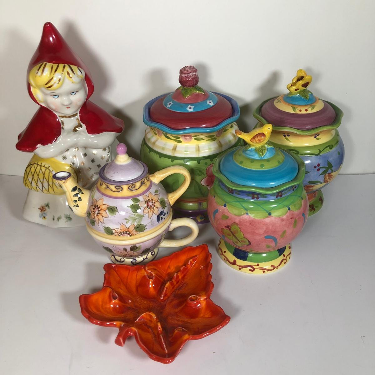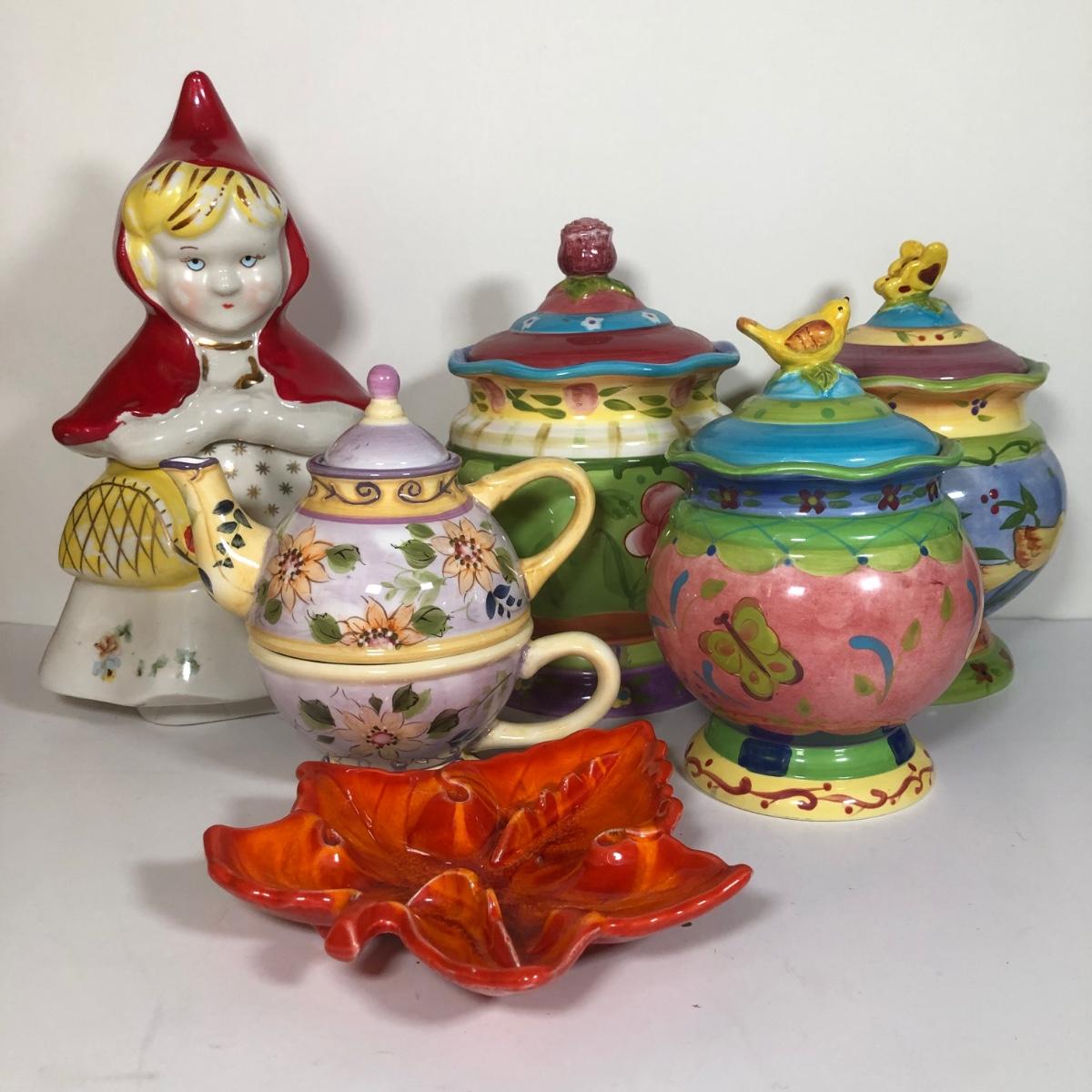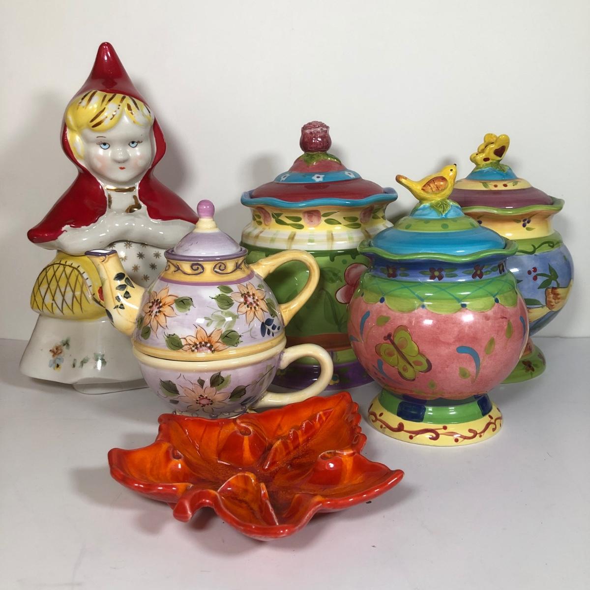 LOT 20D: Vintage Victoria's Trading Co Pottery Red Riding Hood Cookie Jar (11.5"), Sue Zipkin Colorful Pottery Canisters & More
