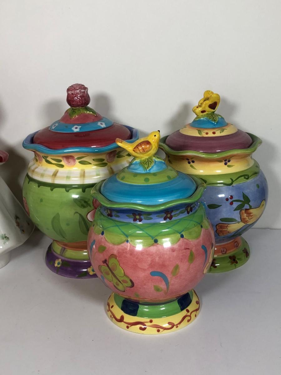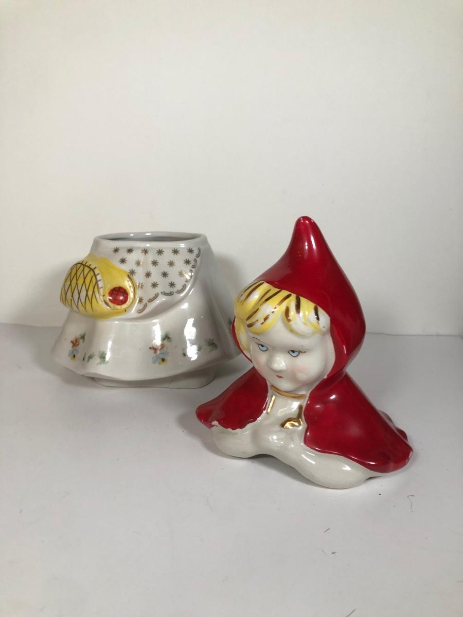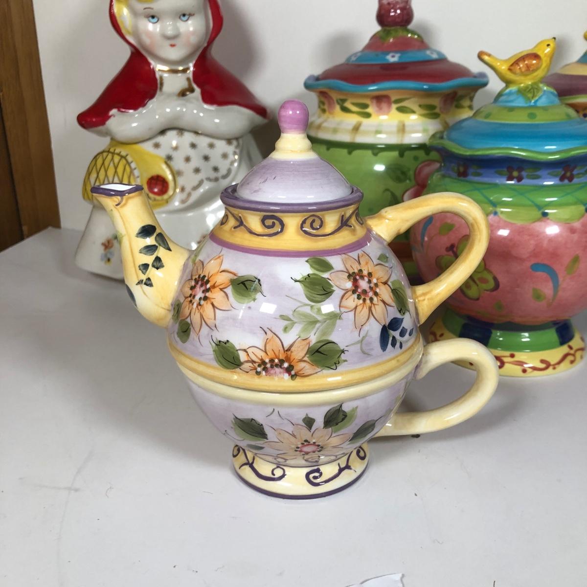 LOT 20D: Vintage Victoria's Trading Co Pottery Red Riding Hood Cookie Jar (11.5"), Sue Zipkin Colorful Pottery Canisters & More