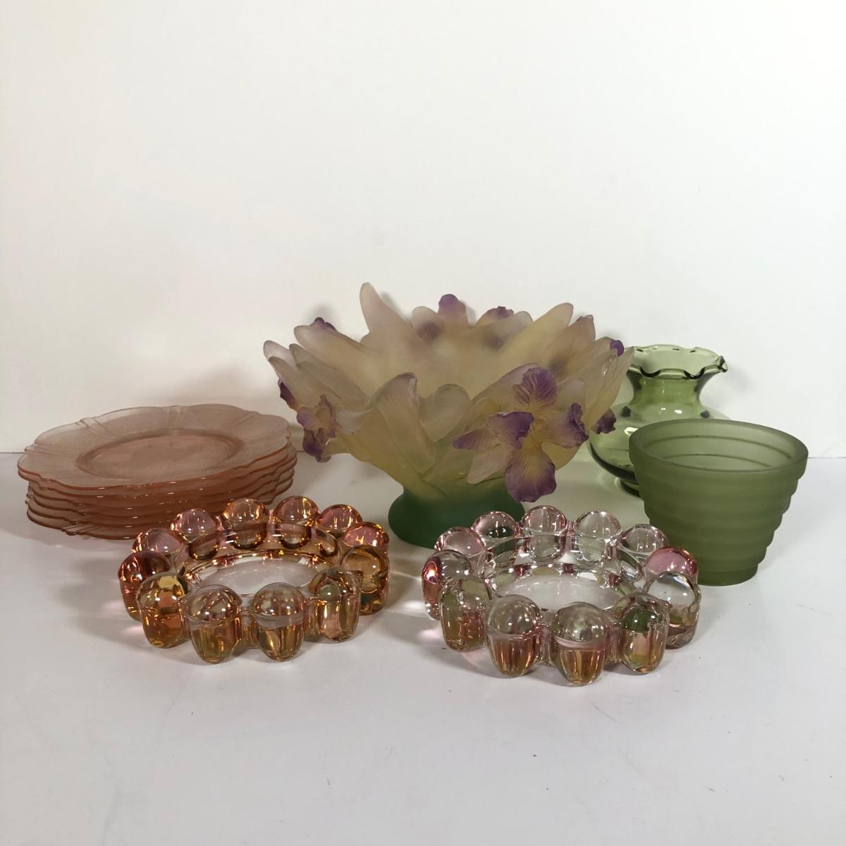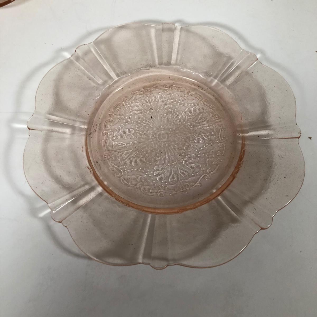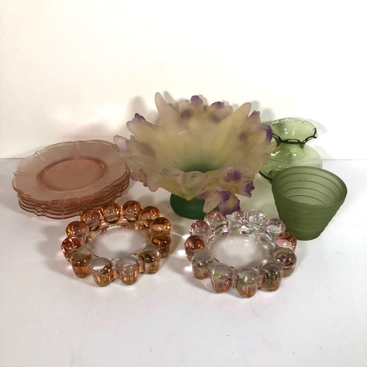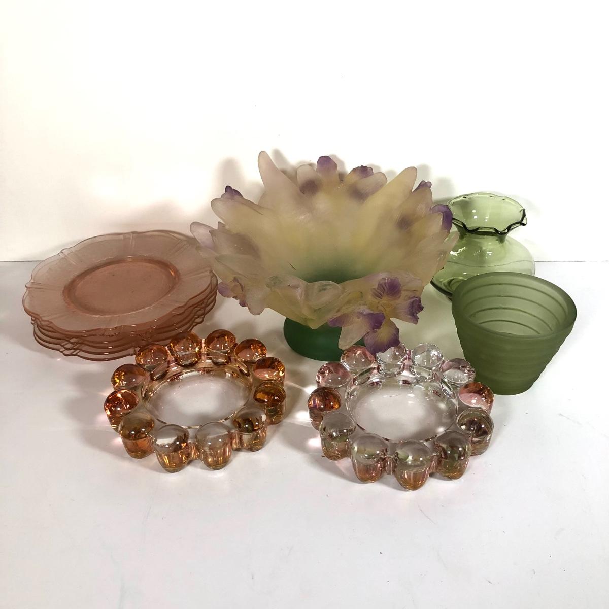LOT 33D: Floral Resin Sculpted Pedestal Dish, Pink Depression Glass Plates, Bubble Edge Dishes & More