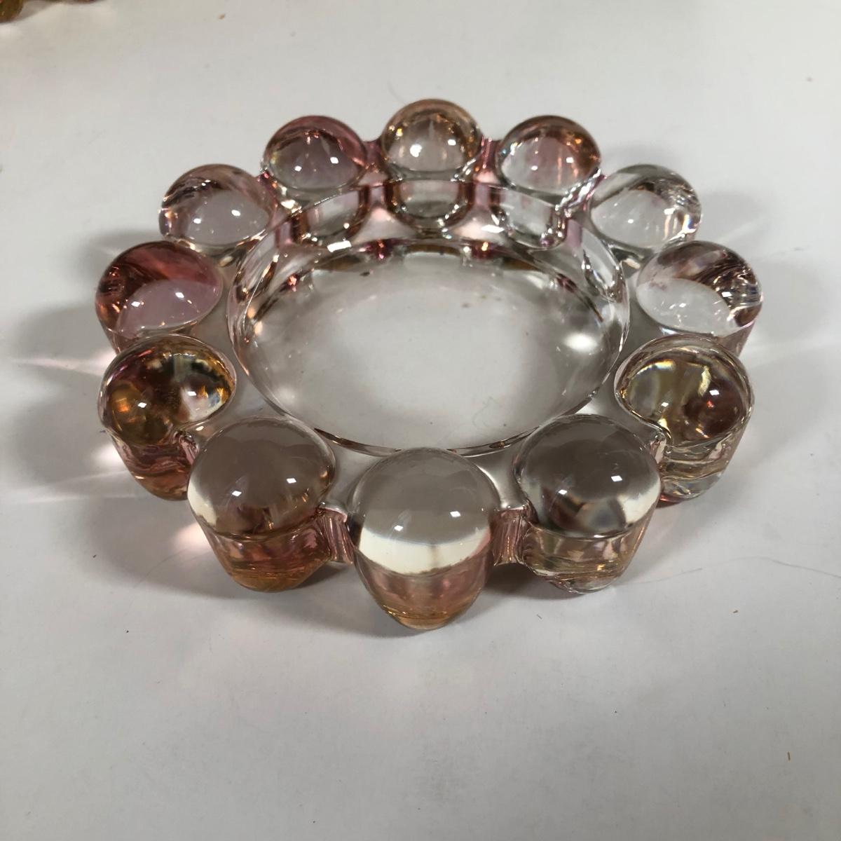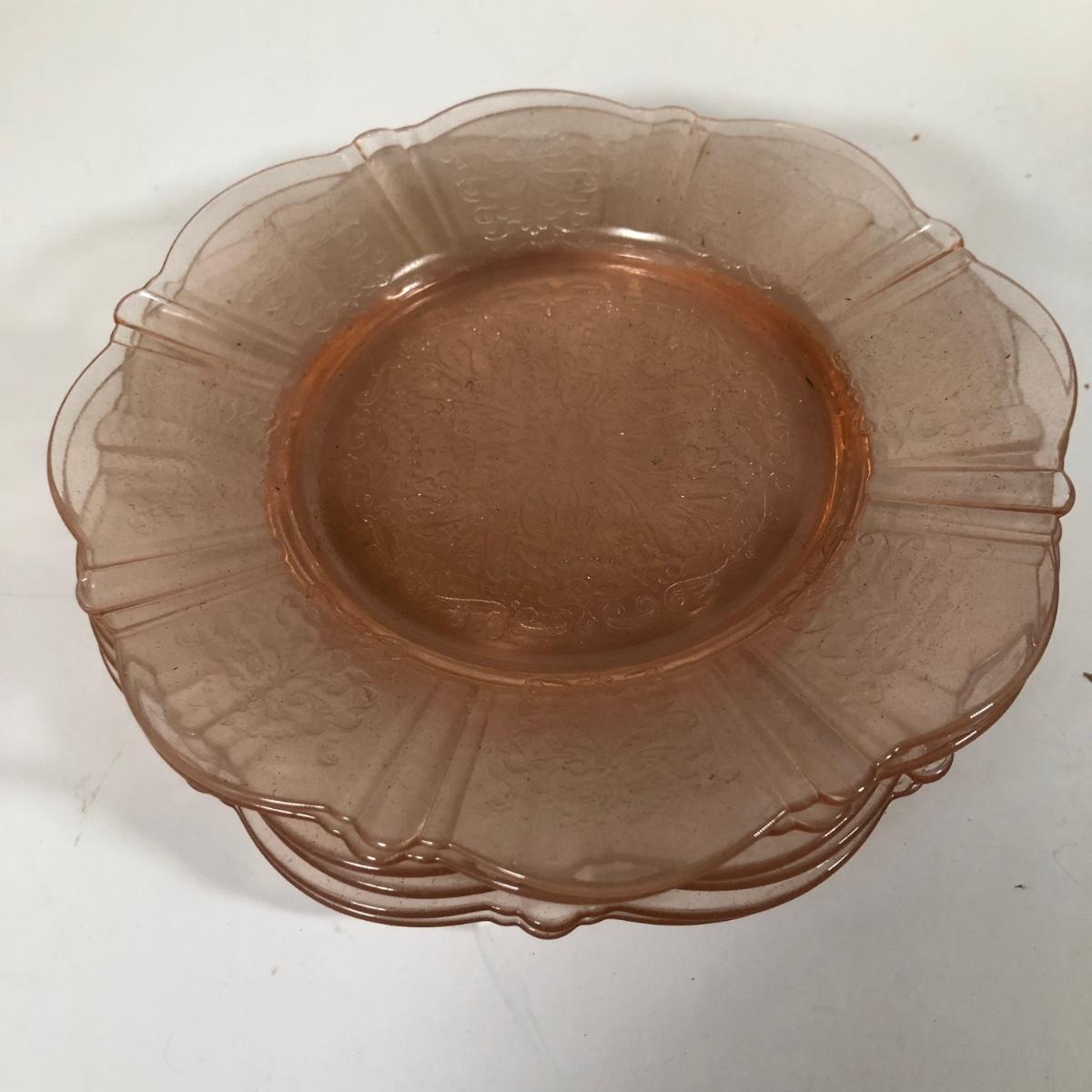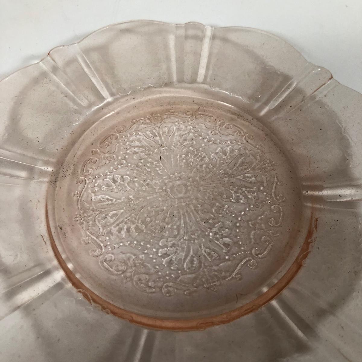 LOT 33D: Floral Resin Sculpted Pedestal Dish, Pink Depression Glass Plates, Bubble Edge Dishes & More
