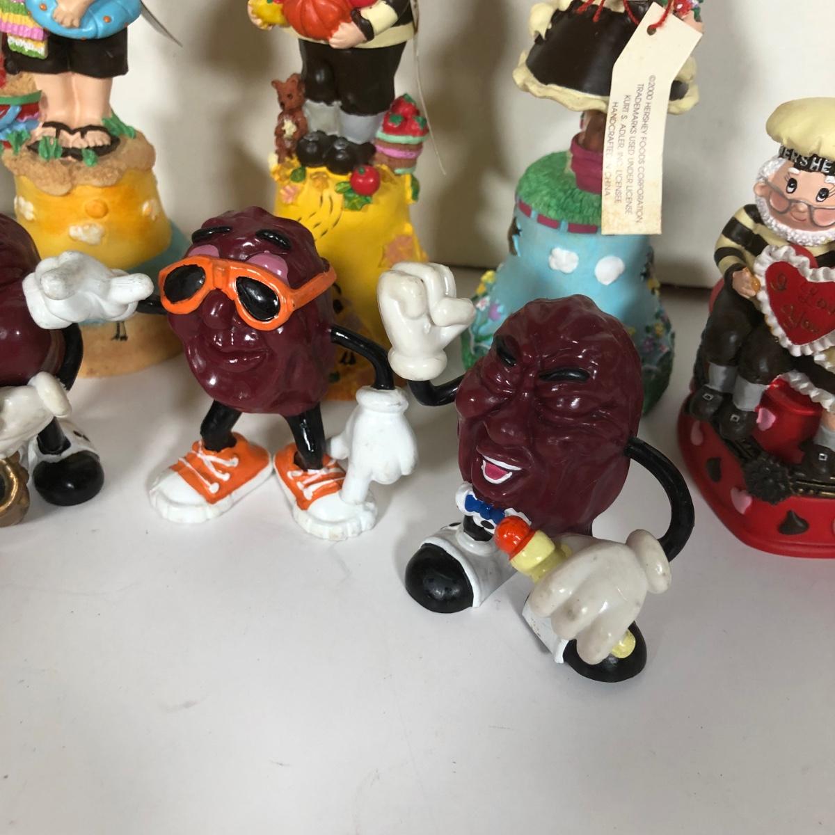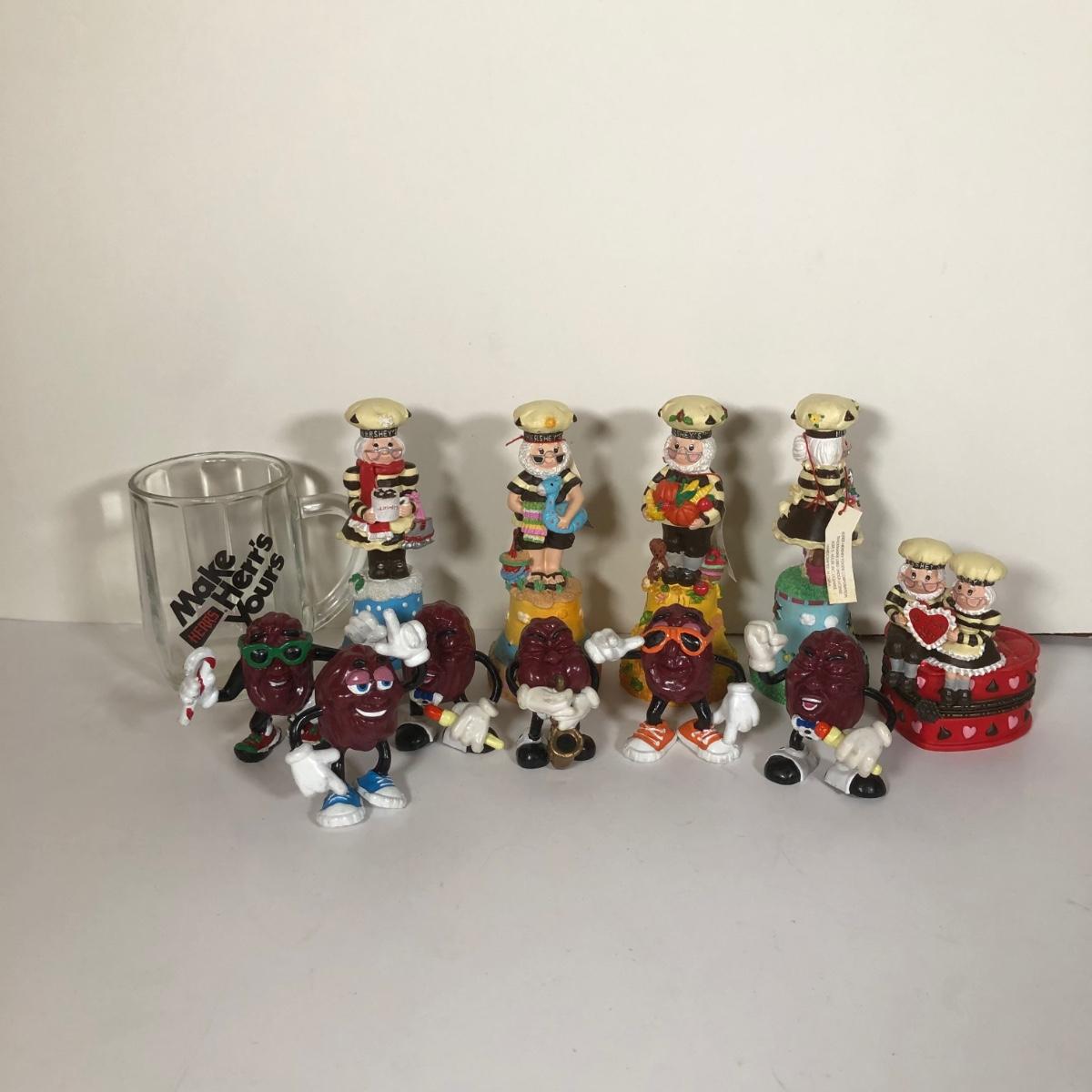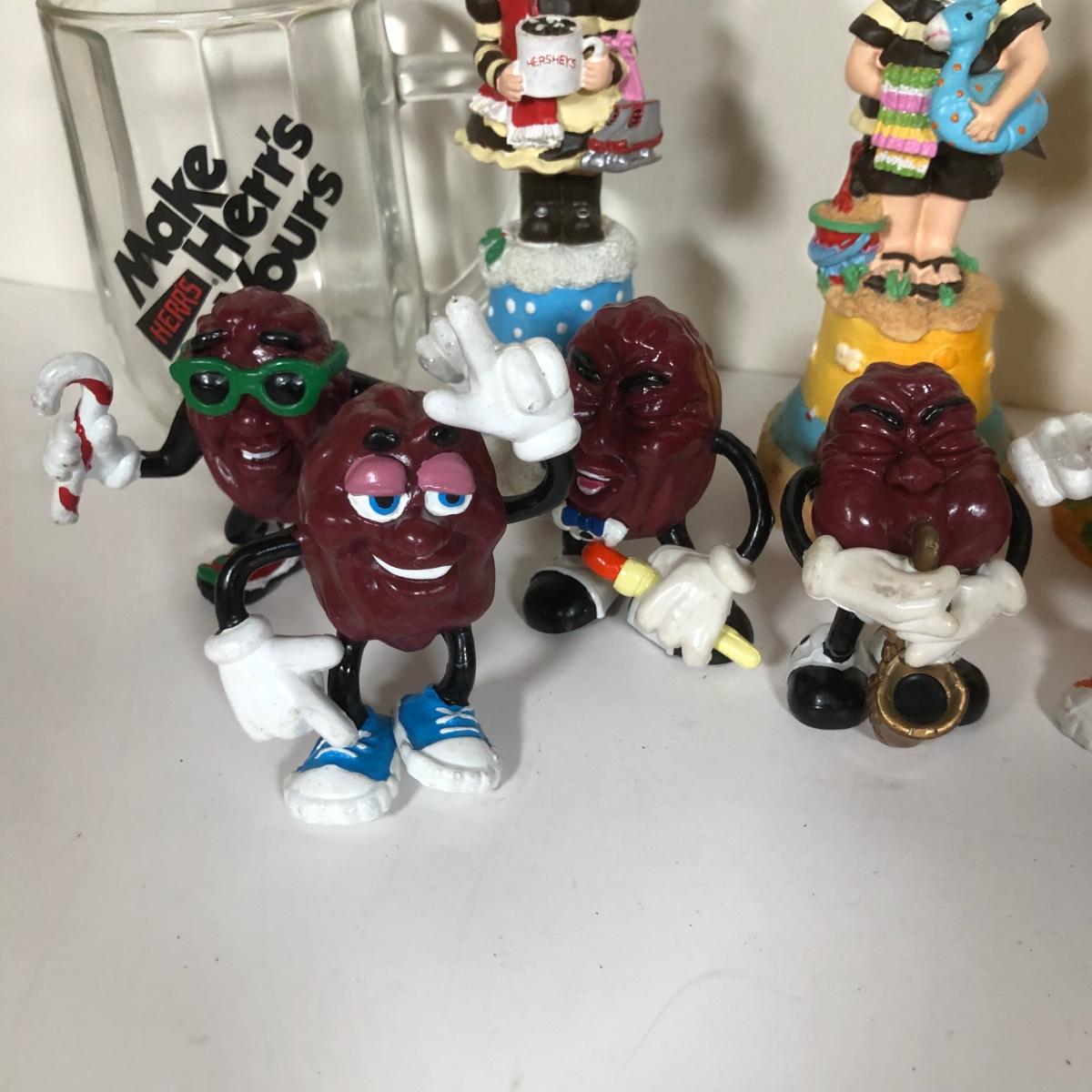 LOT 38D: 1980s California Raisin Toys, Herr's Glass Mug & 2000s Hershey's Collectible Trinket Box & Bells