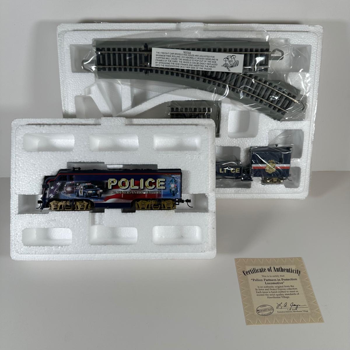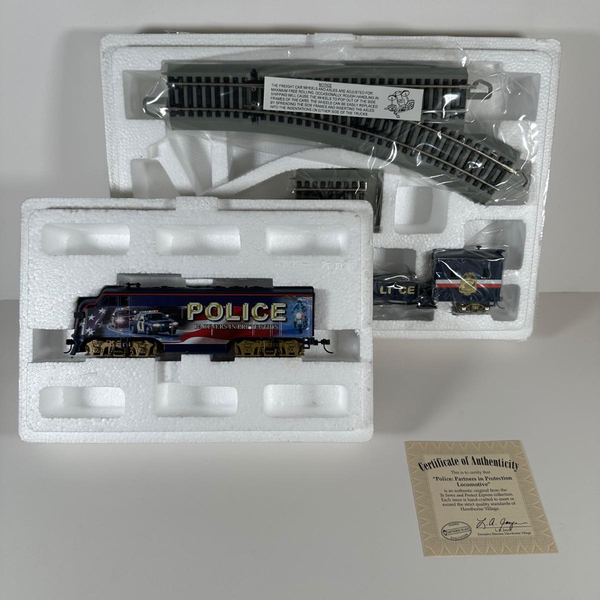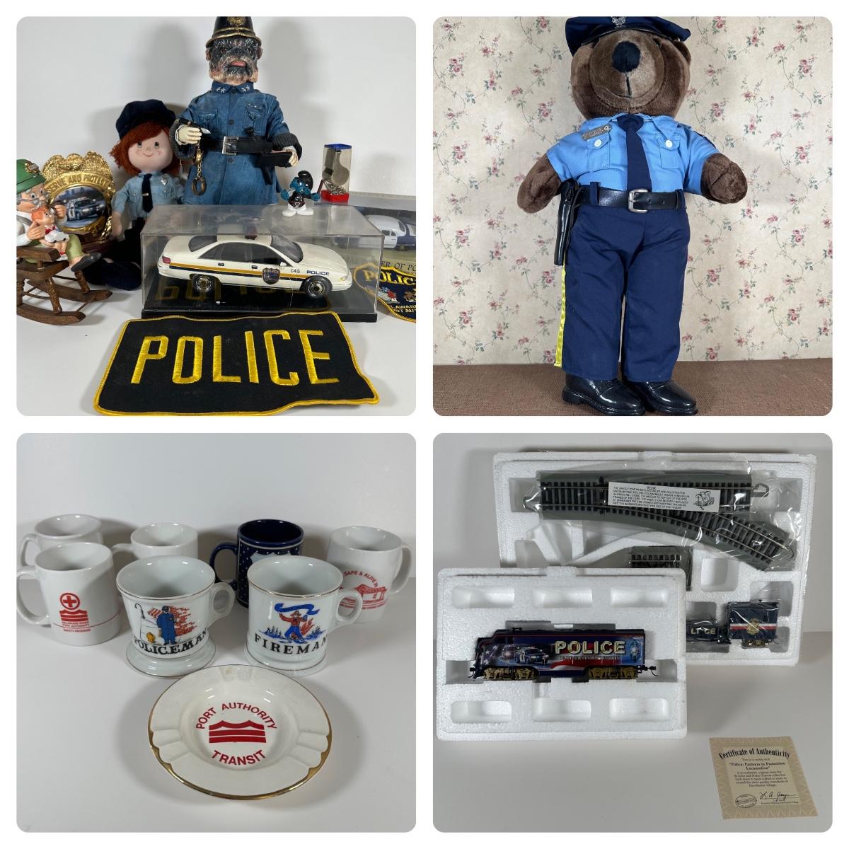 LOT 56X: Police Themed Toys, Decor, Mugs, Hawthorne Village Police Partners In Protection Locomotive & More