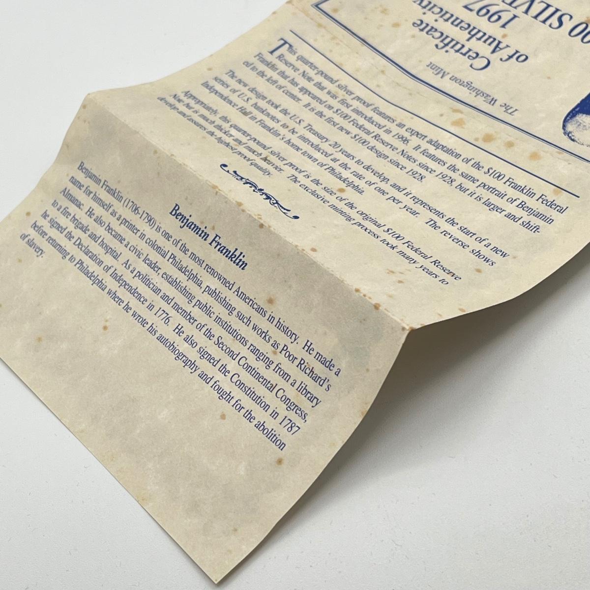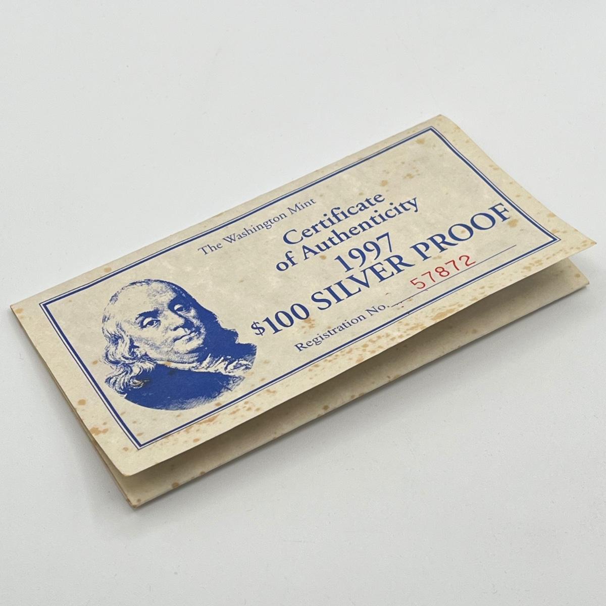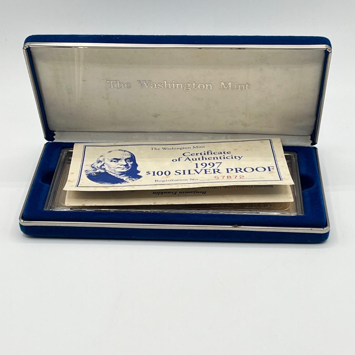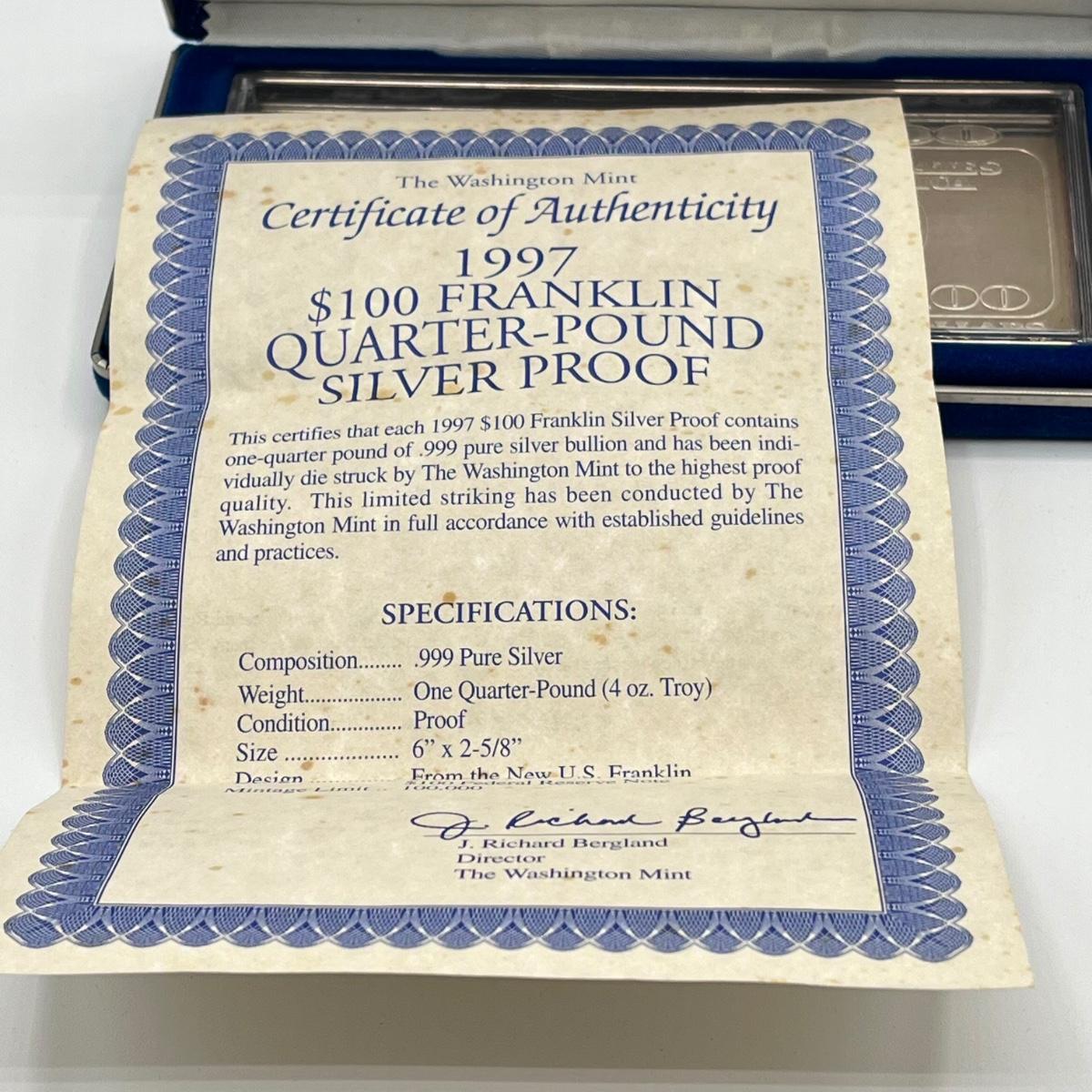 LOT 78J: 1997 Silver Proof $100 Bill - Quarter Pound of .999 Silver Bar
