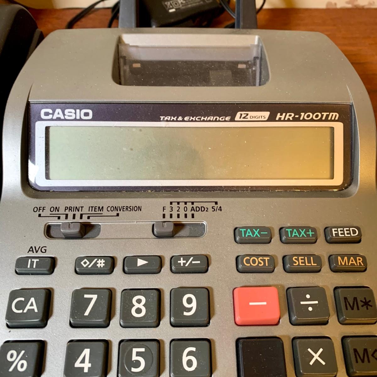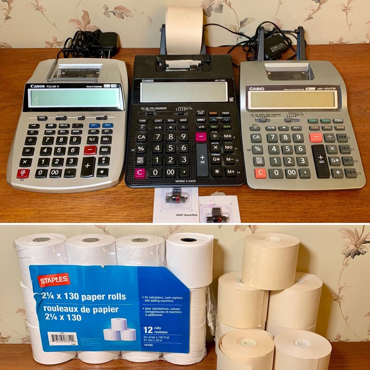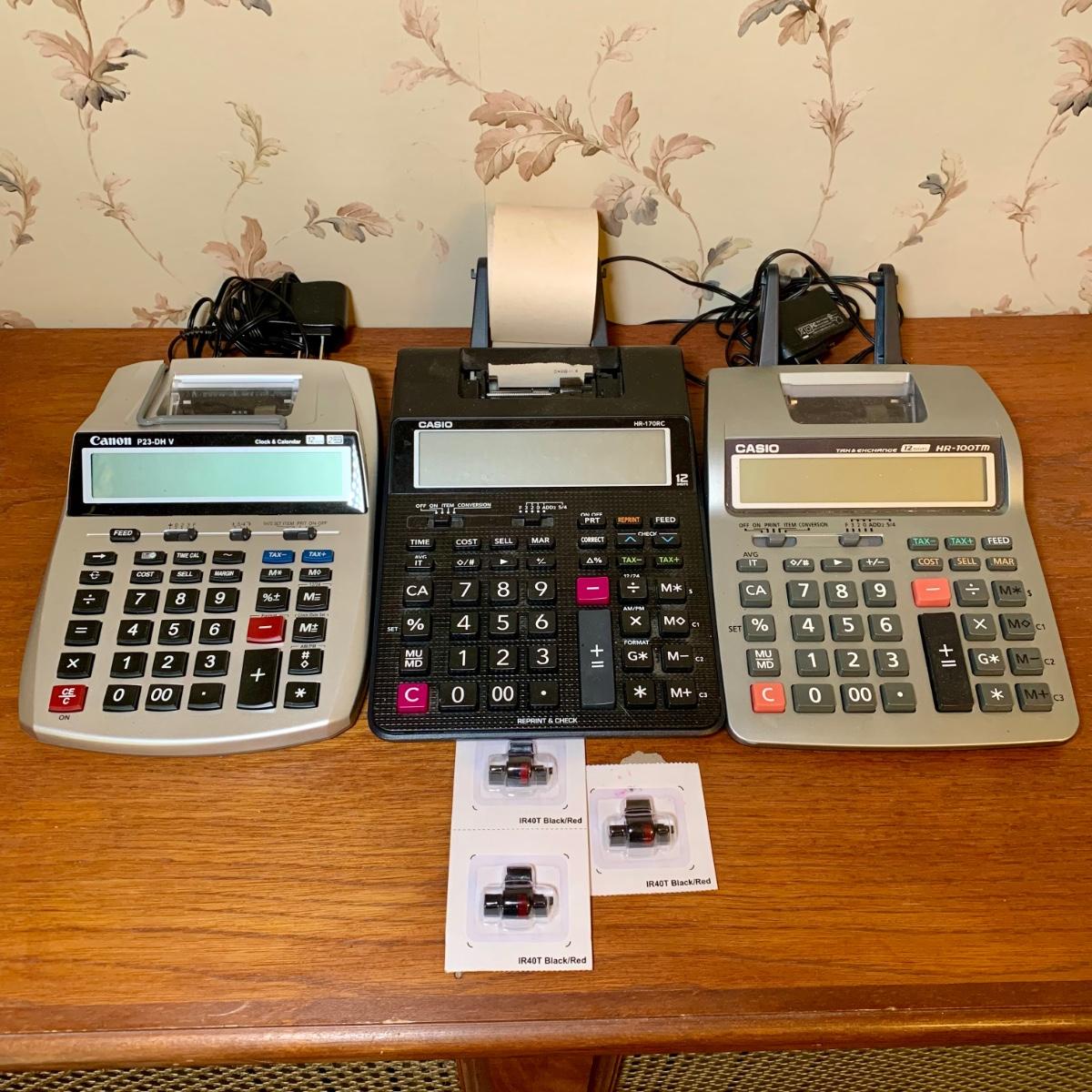 LOT 94 F: Business Calculator Collection: Casio Tax & Exchange 12 Digit HR-100TM, Casio 12 Digit HR-170RC, & Canon Clock & Calendar 12 Digit 2 Color Print P23-DHV