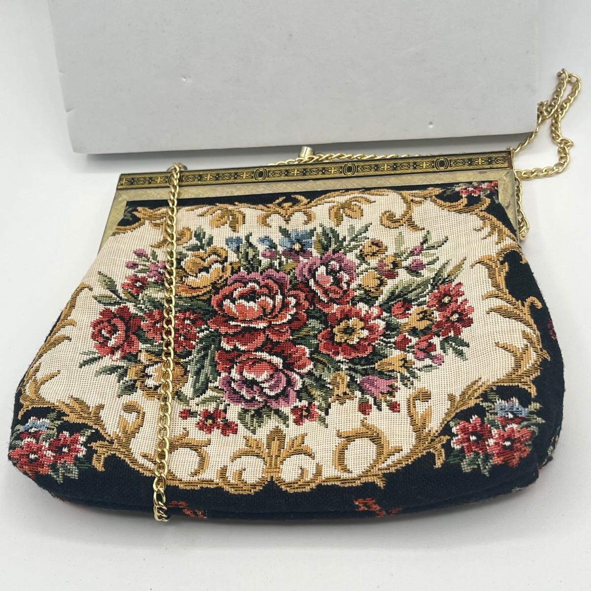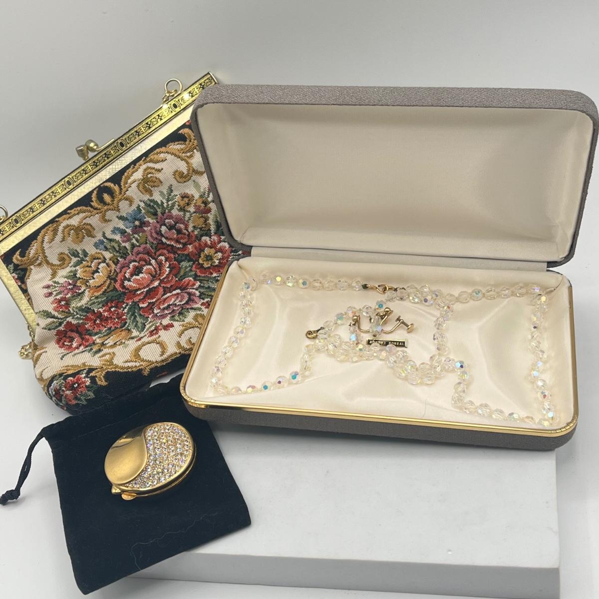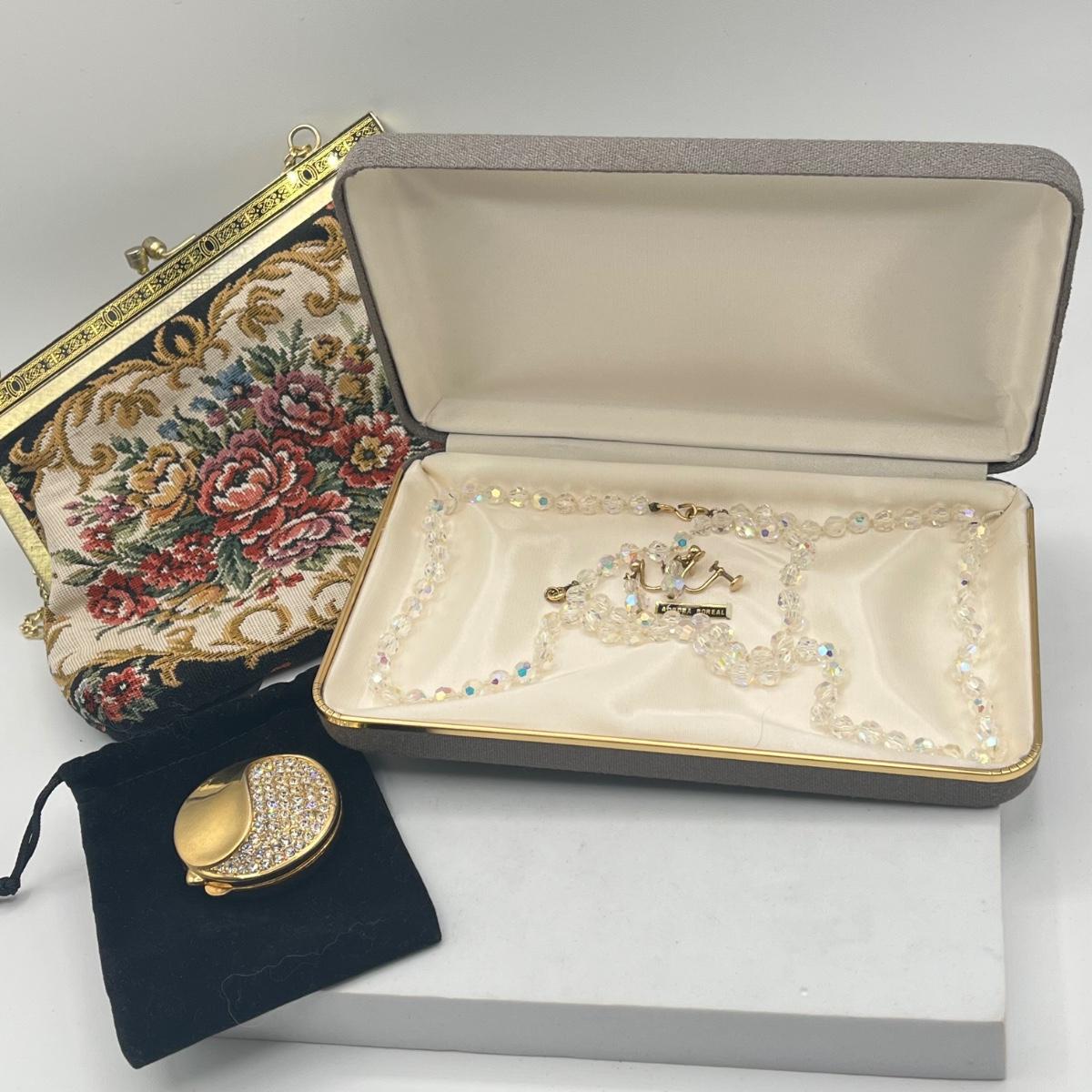 LOT 112J: Vintage Bob Mackie Crystal Top Pill Case, 1950s Petit Point Embroidered Tapestry Purse, Vintage Aurora Borealis Gold Set with Gold Filled Clasps