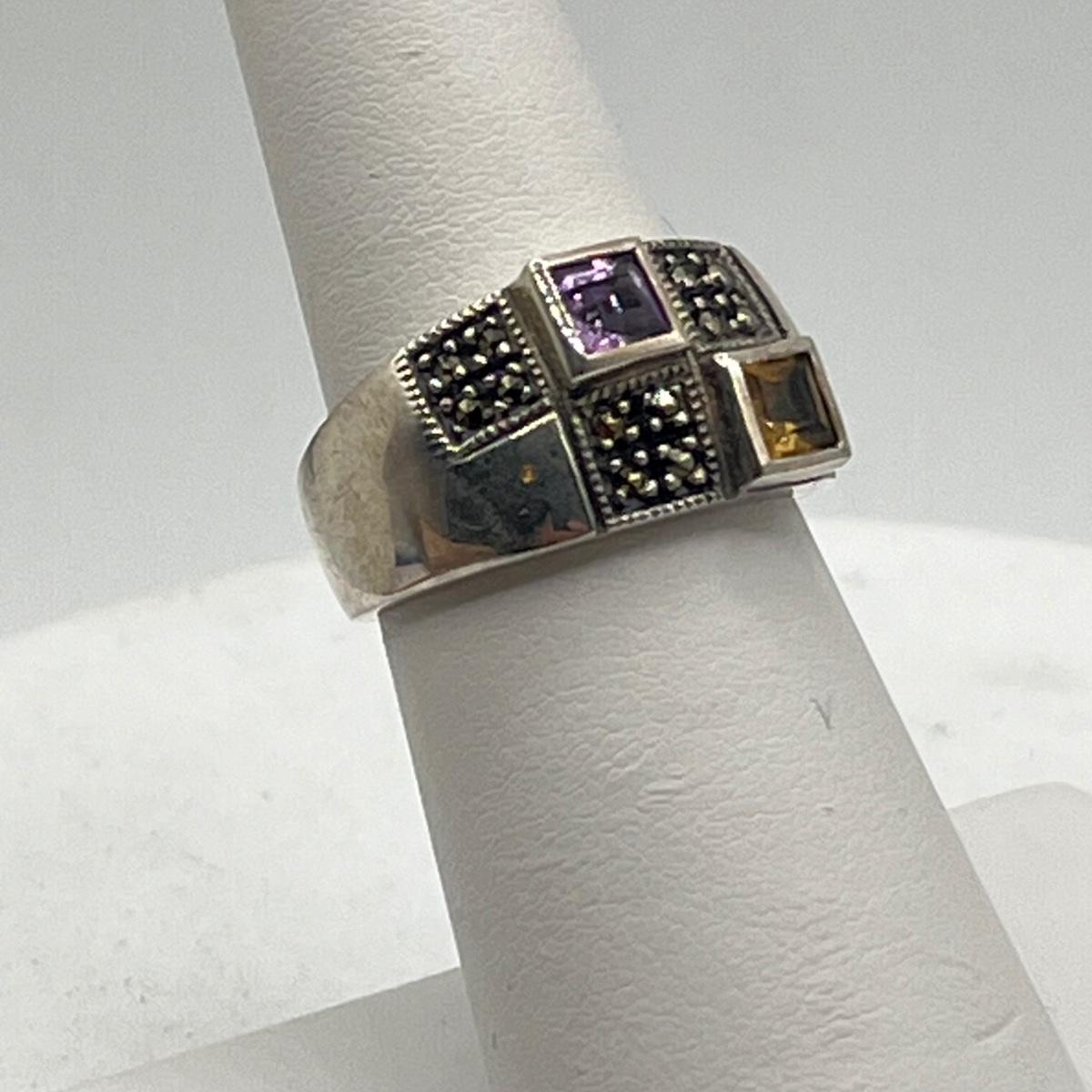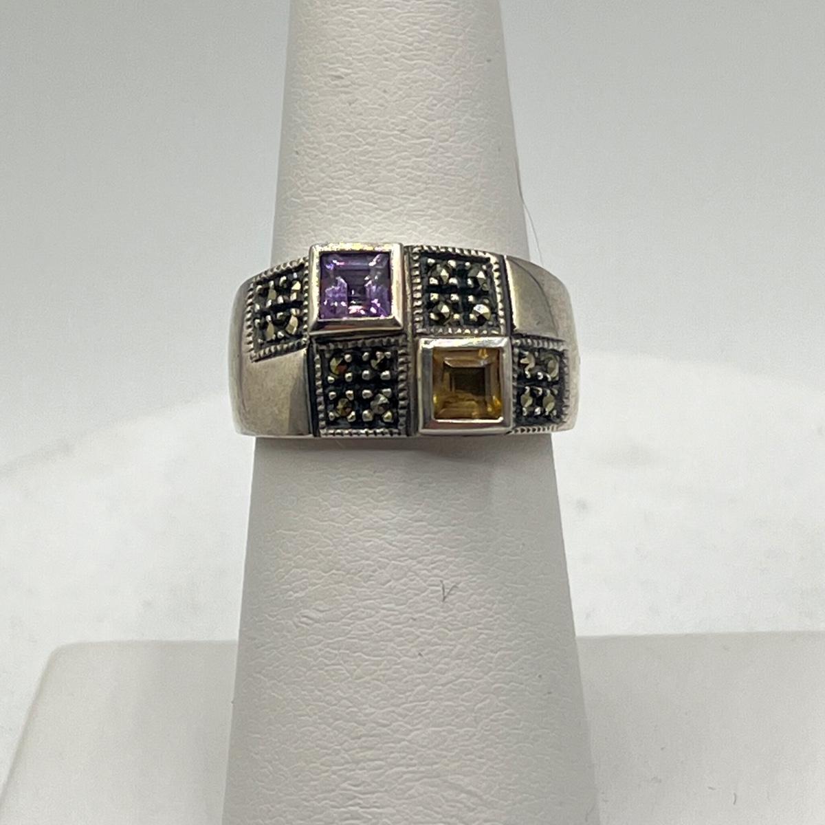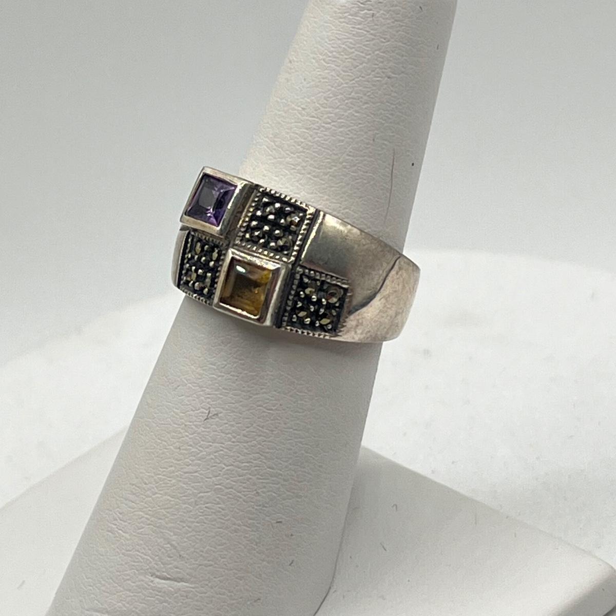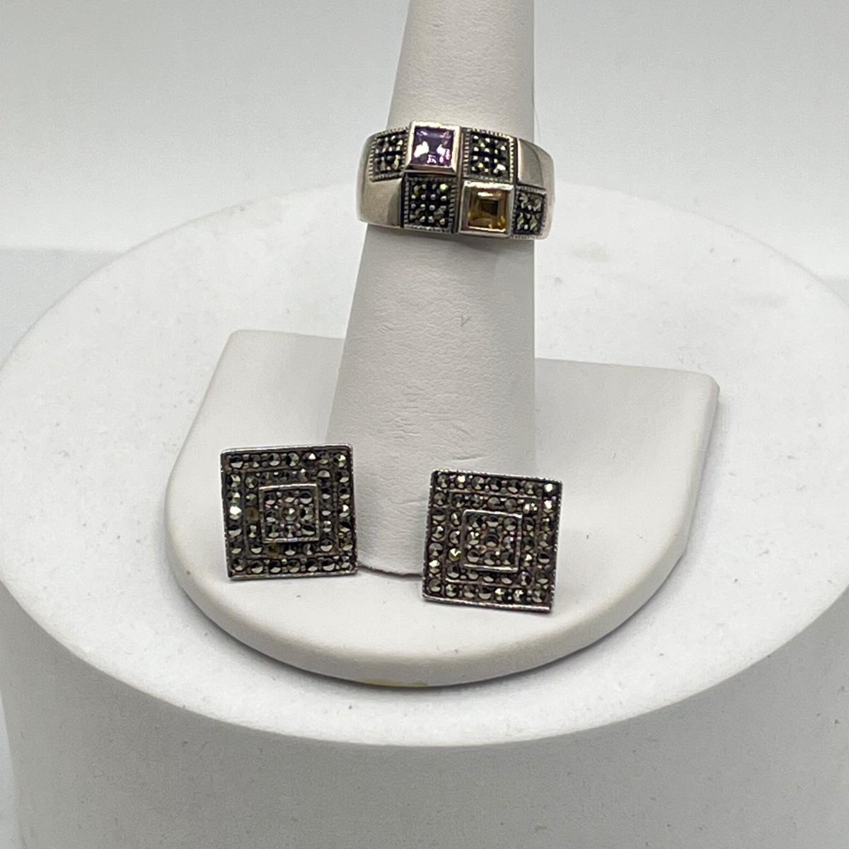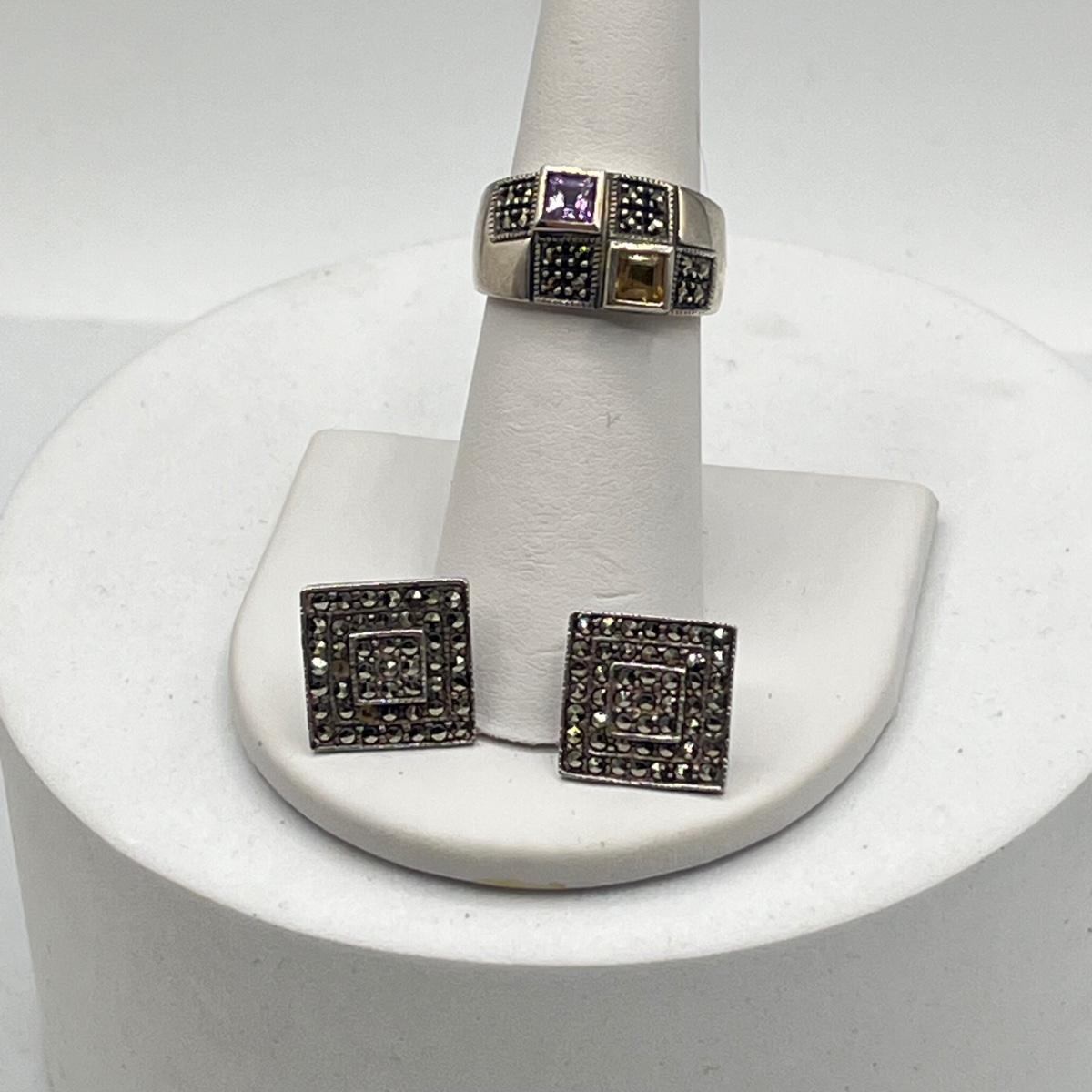 LOT 131J: Vintage Sterling Silver Marcasite, Amethyst and Citrine Size 6 Ring and Marcasite Earrings - 11.3 gtw