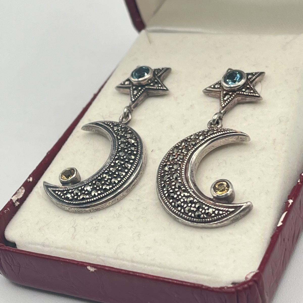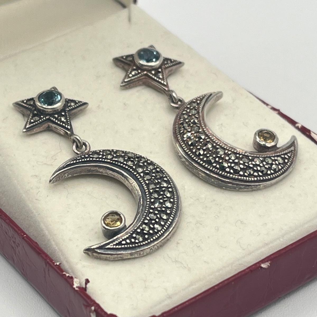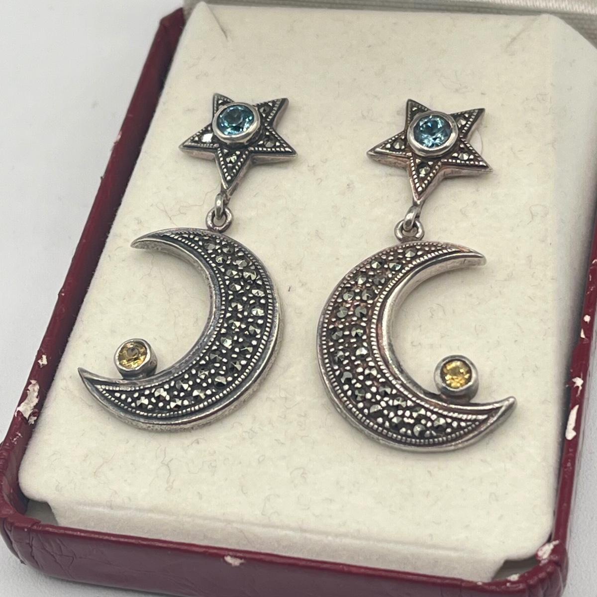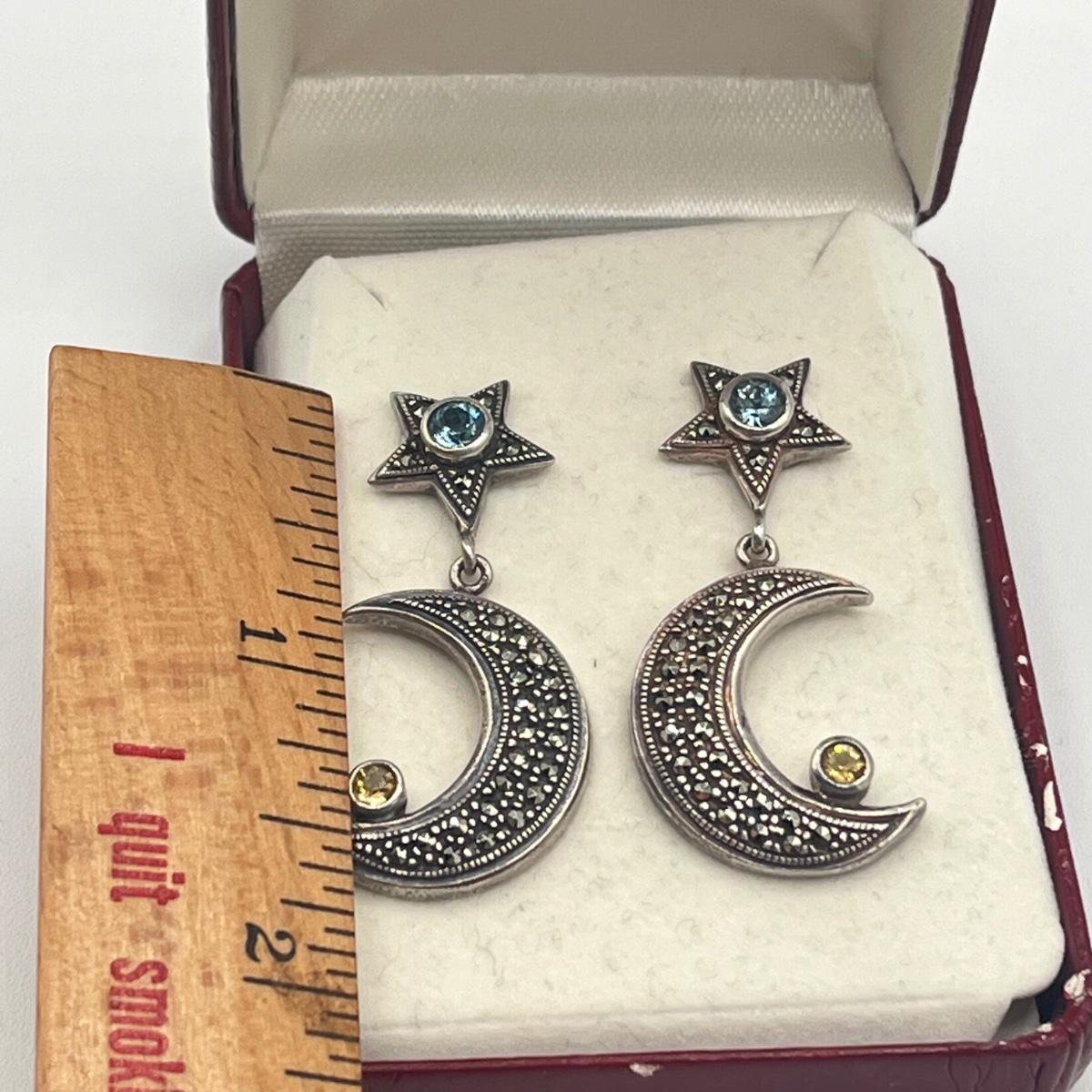 LOT 154J: Vintage Sterling Silver Marcasite, Citrine and Blue Topaz Moon and Star Earrings