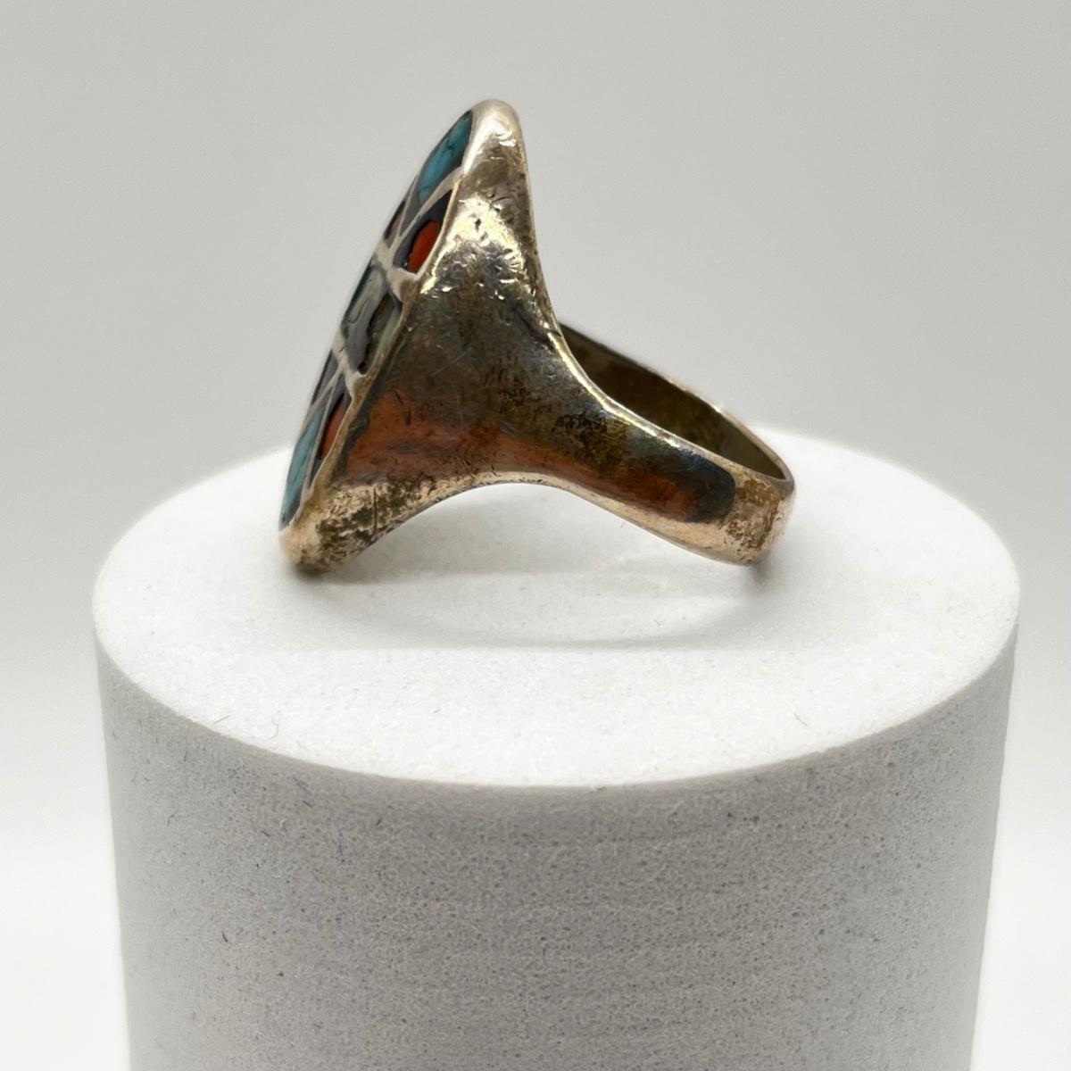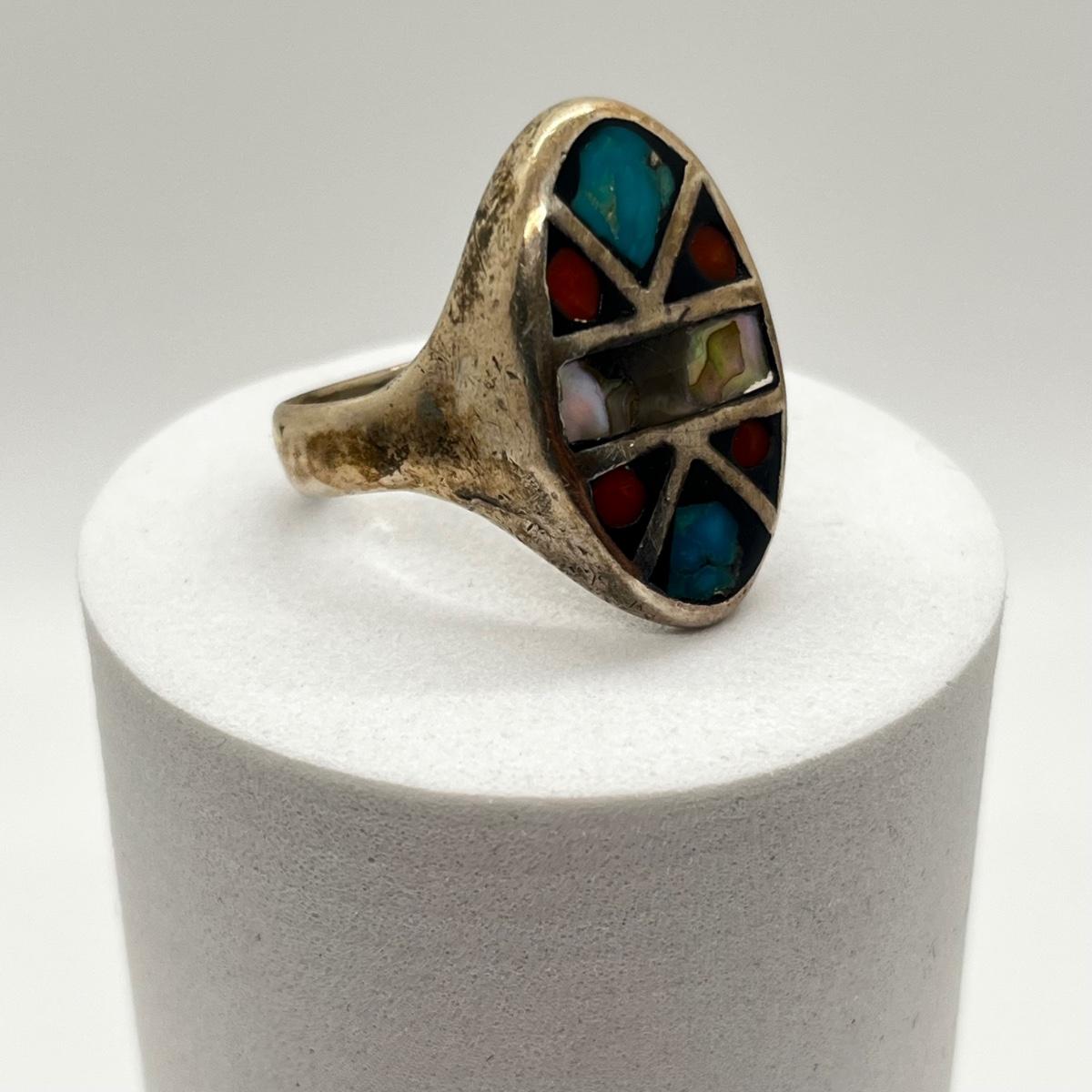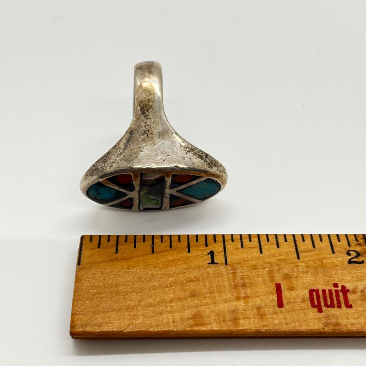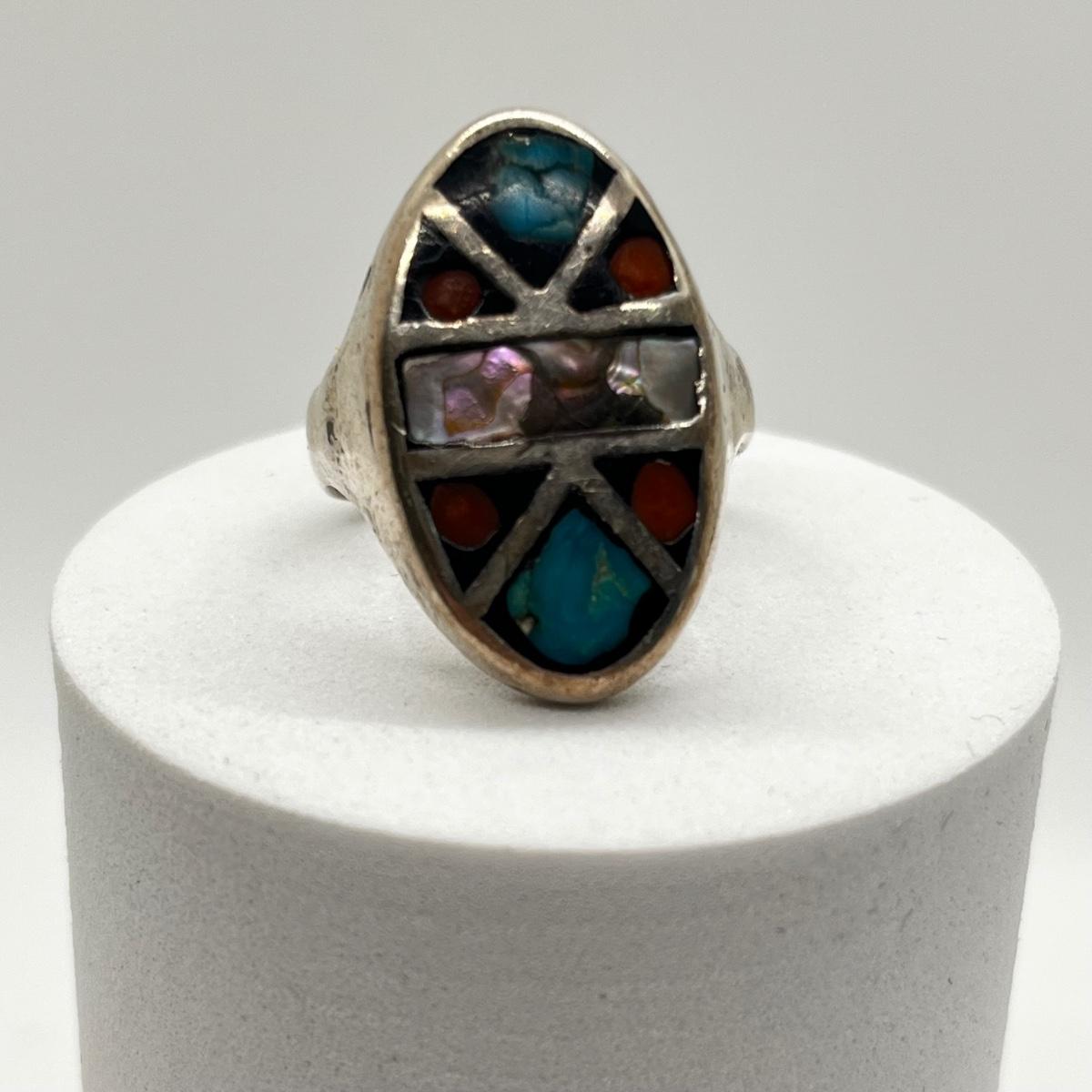 LOT 161J: Sterling Silver Vintage Native American Unsigned Size 10.5 Silver Ring with Inlay of Turquoise, Coral and Mother of Pearl