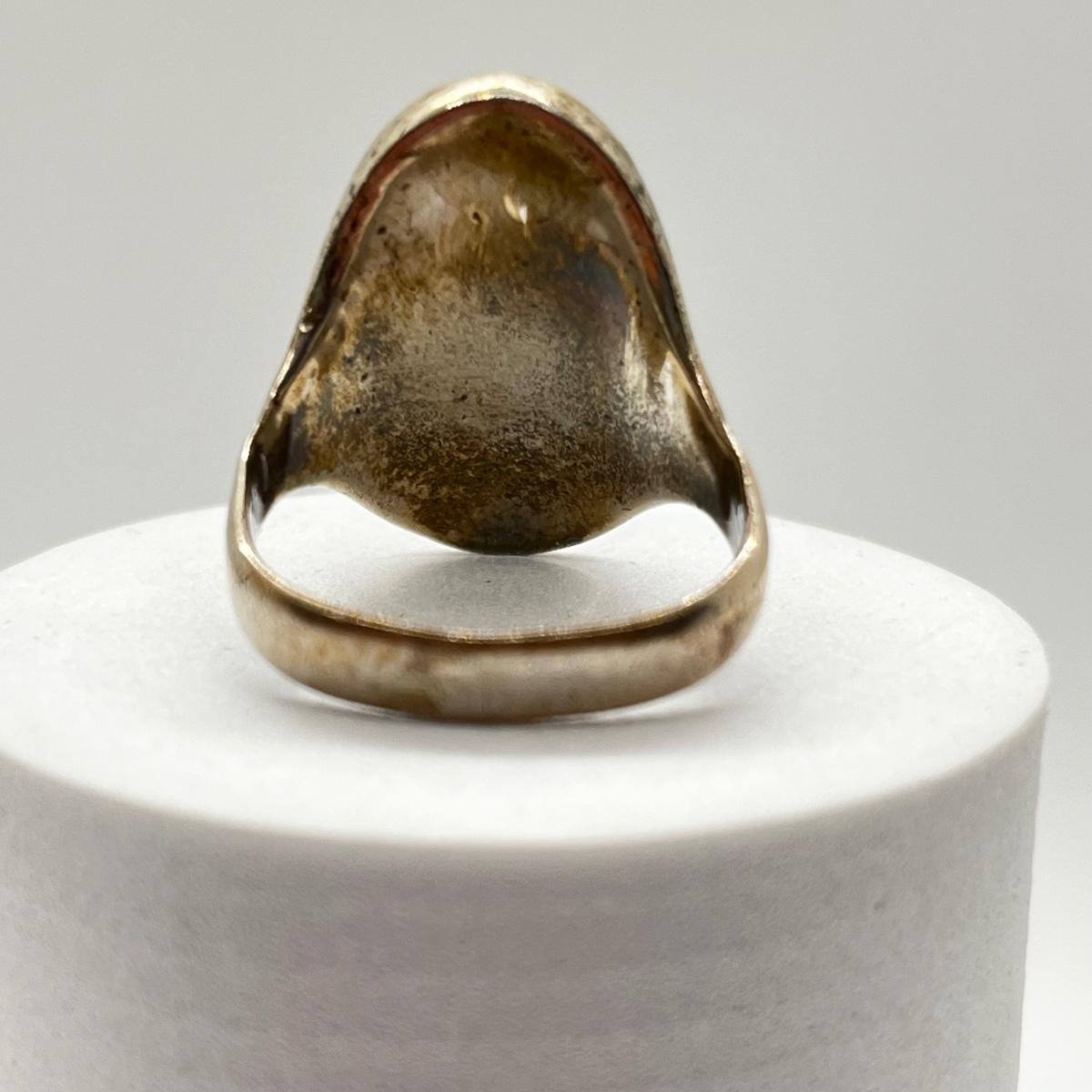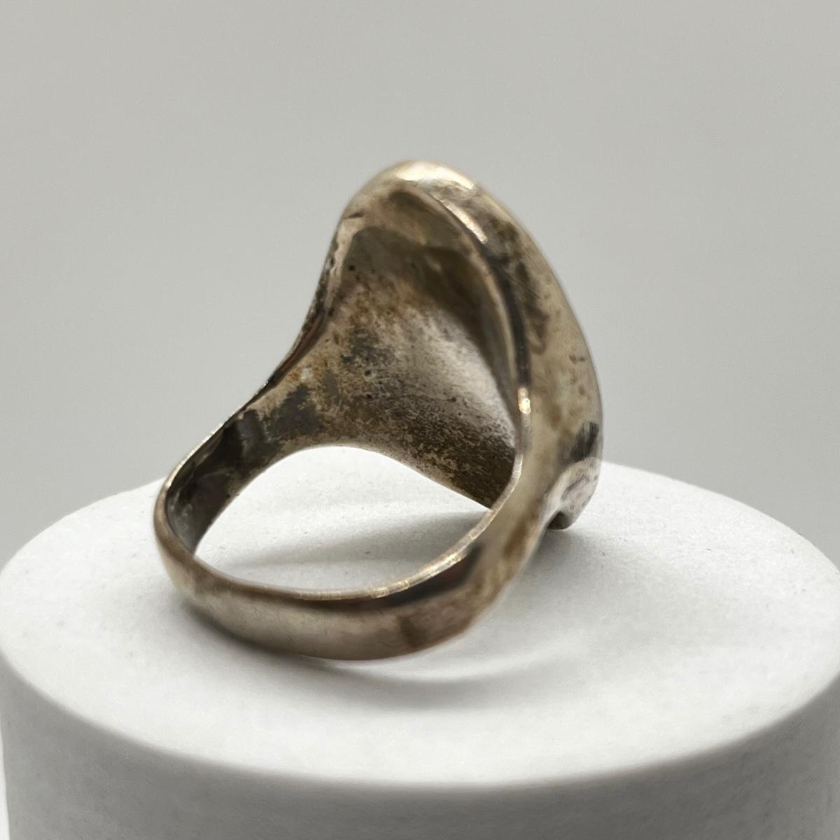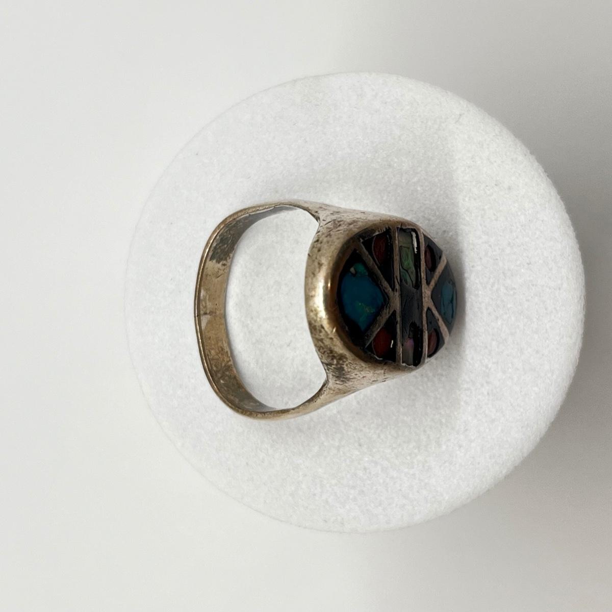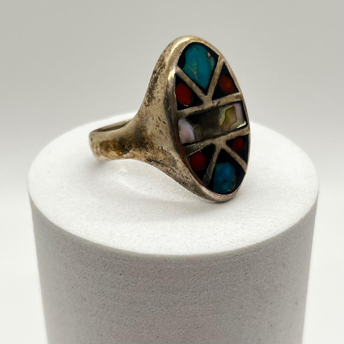 LOT 161J: Sterling Silver Vintage Native American Unsigned Size 10.5 Silver Ring with Inlay of Turquoise, Coral and Mother of Pearl