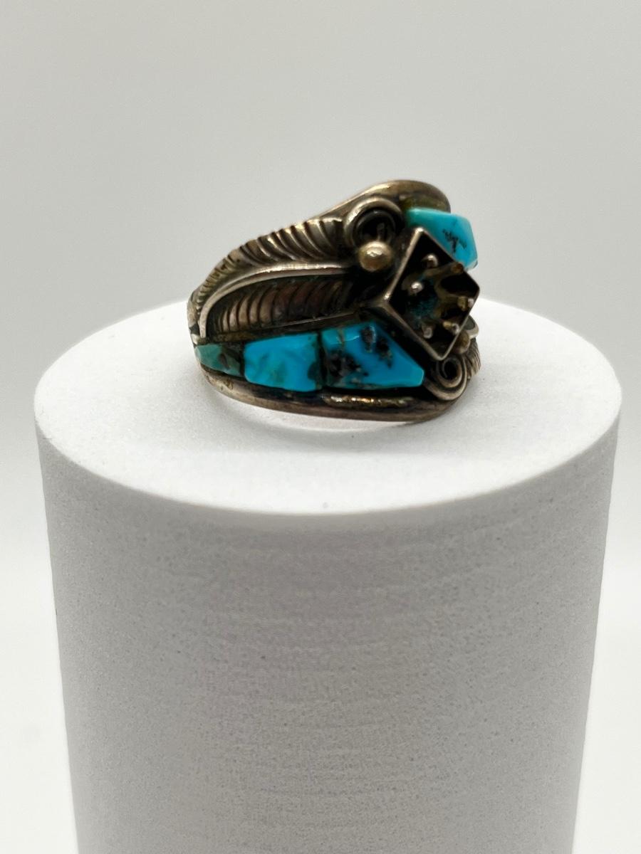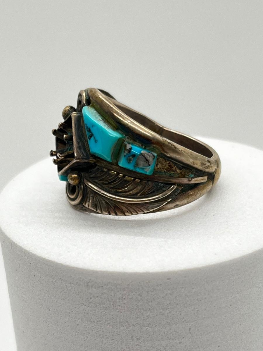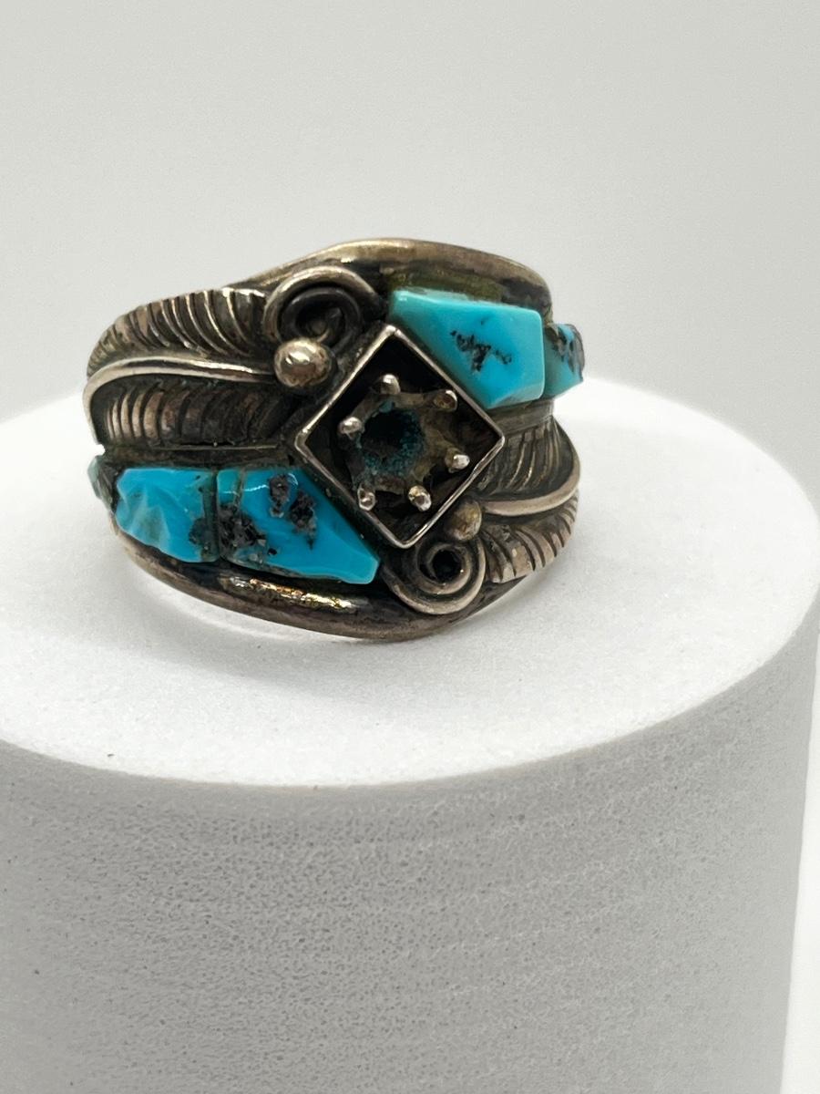 LOT 177: Sterling Silver Vintage Native American Design Turquoise Size 11 Ring - Marked CW