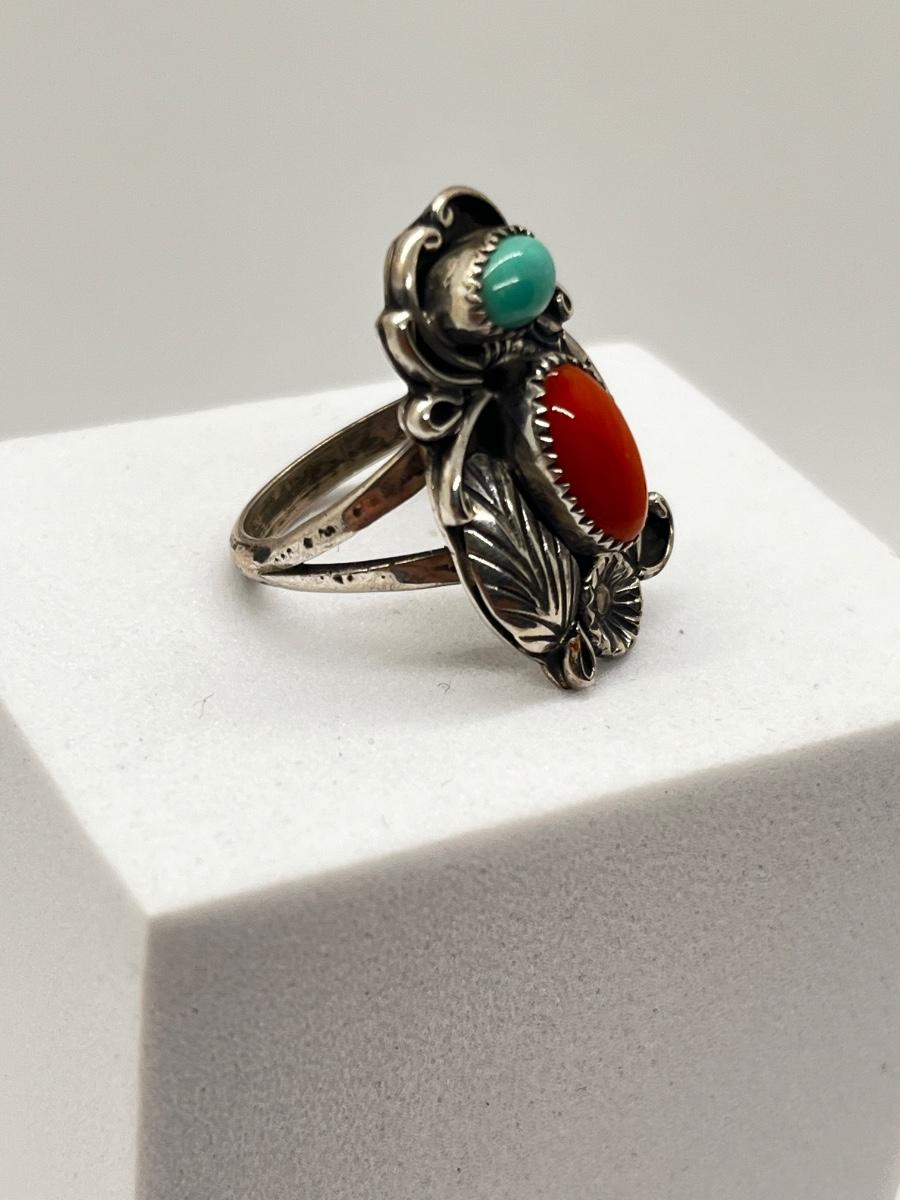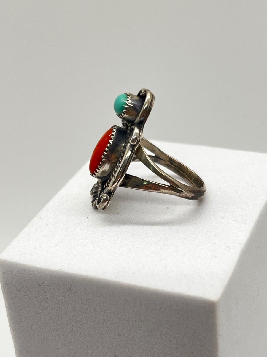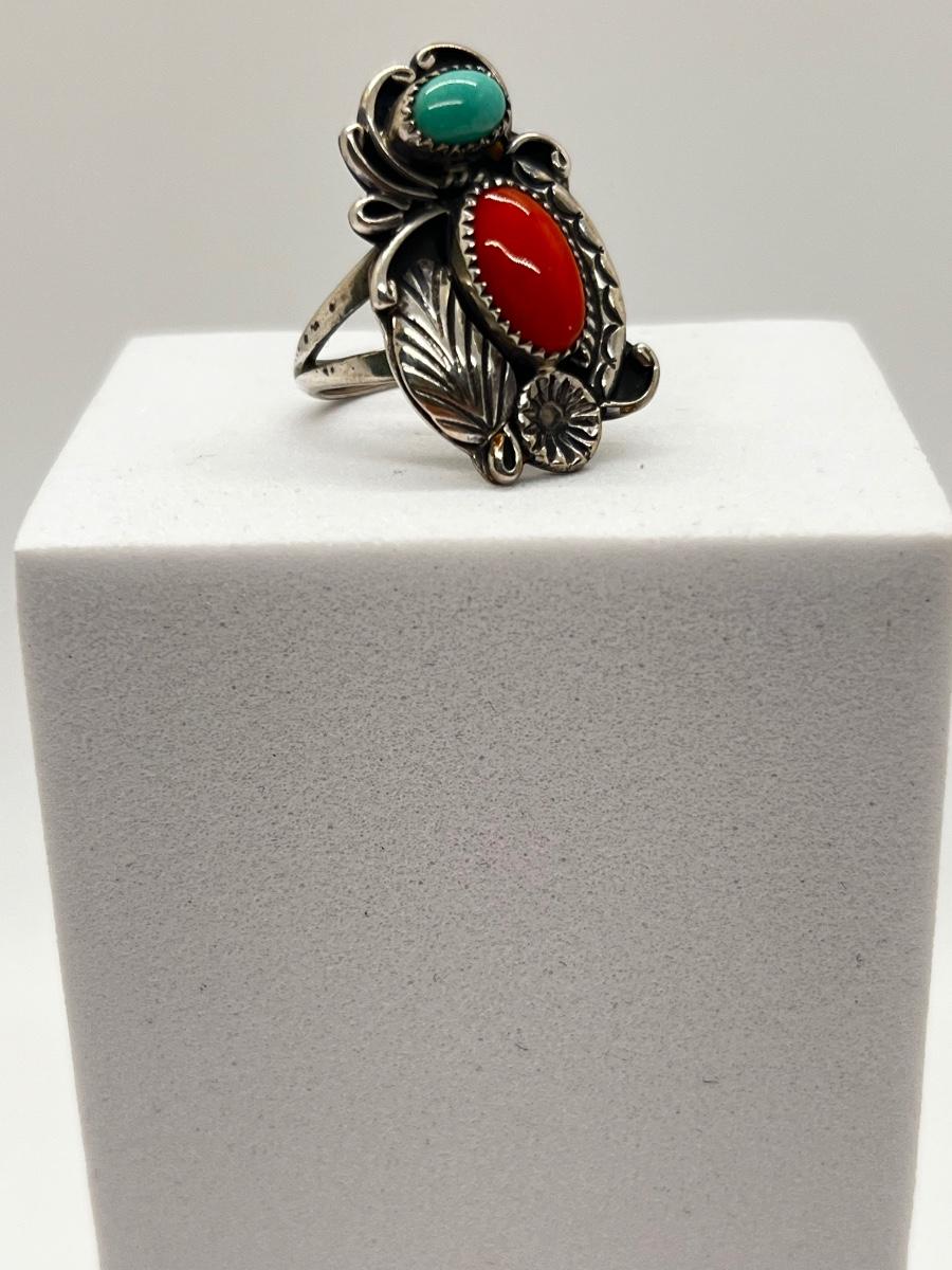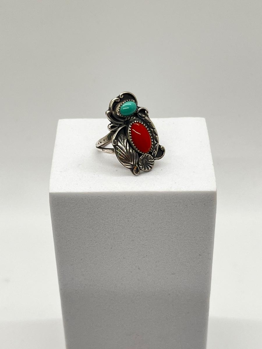 LOT 197J: Sterling Silver, Turquoise and Coral Vintage Navajo Signed E. Harvey Ring