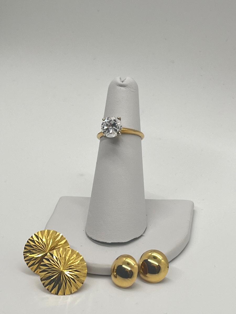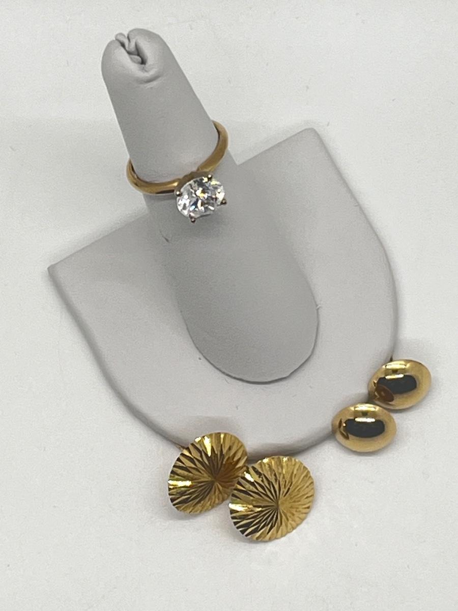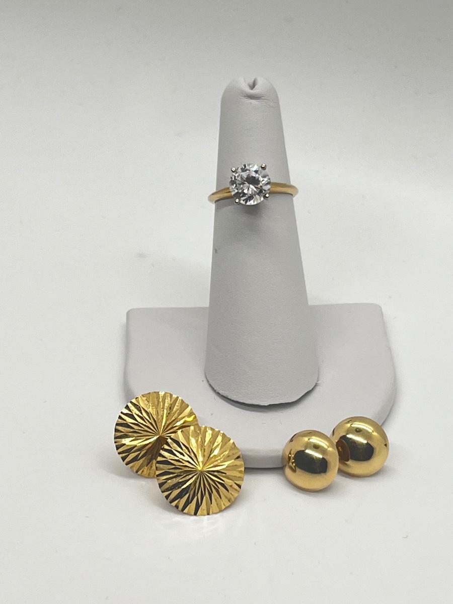 LOT 205J: 14K Diamonique Cubic Zirconia Size 5 Ring + Two Pairs 14K Post Earrings
